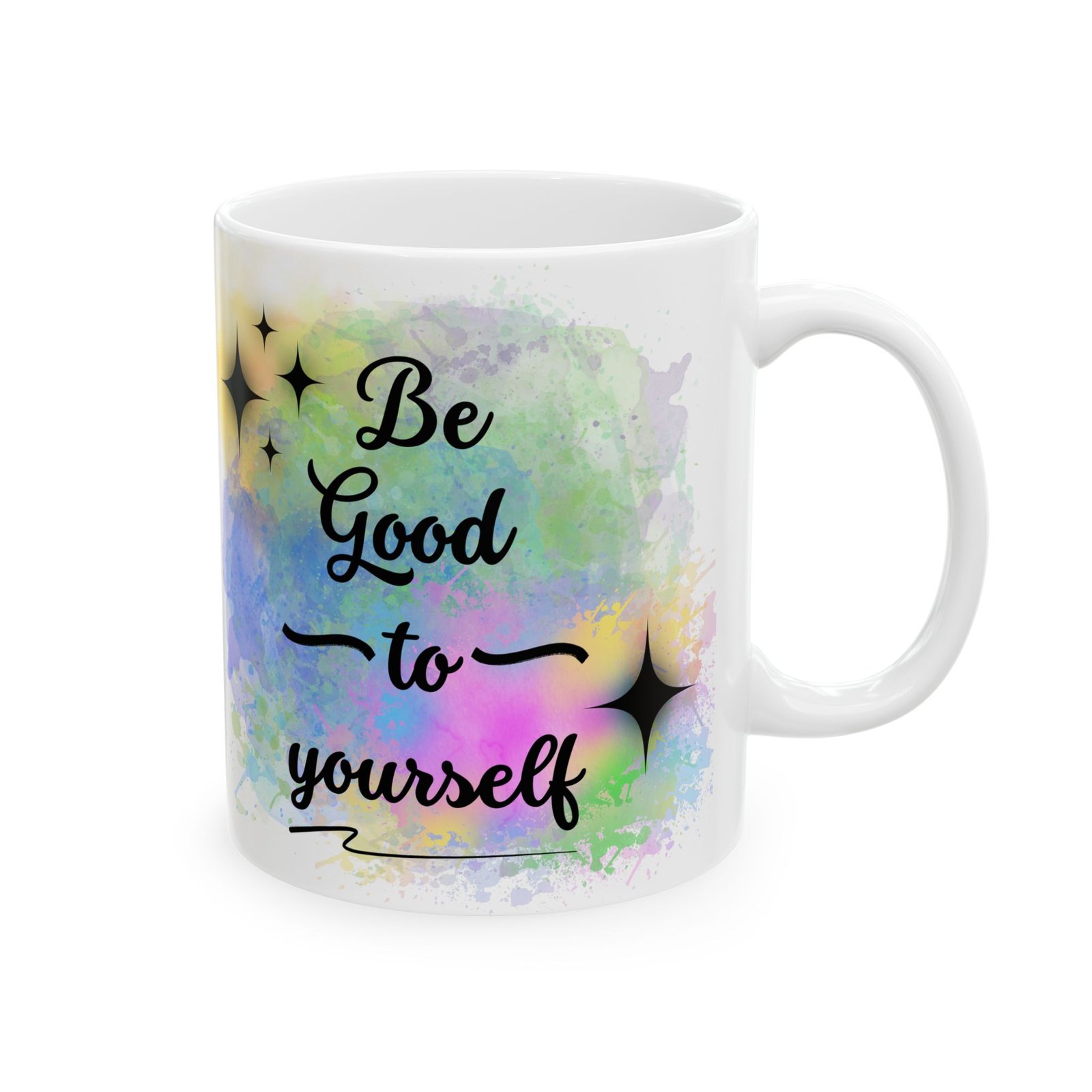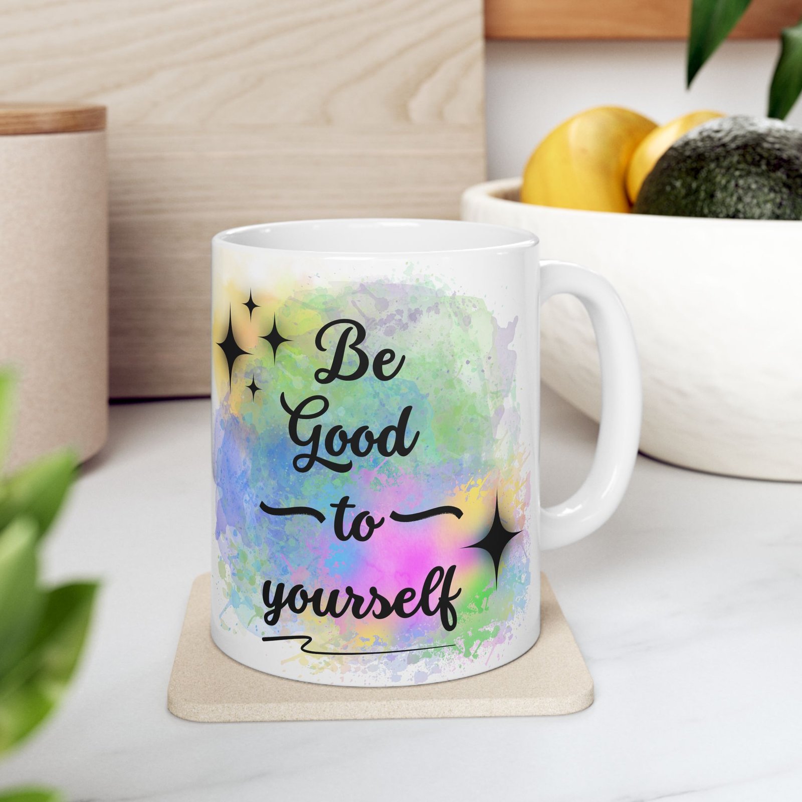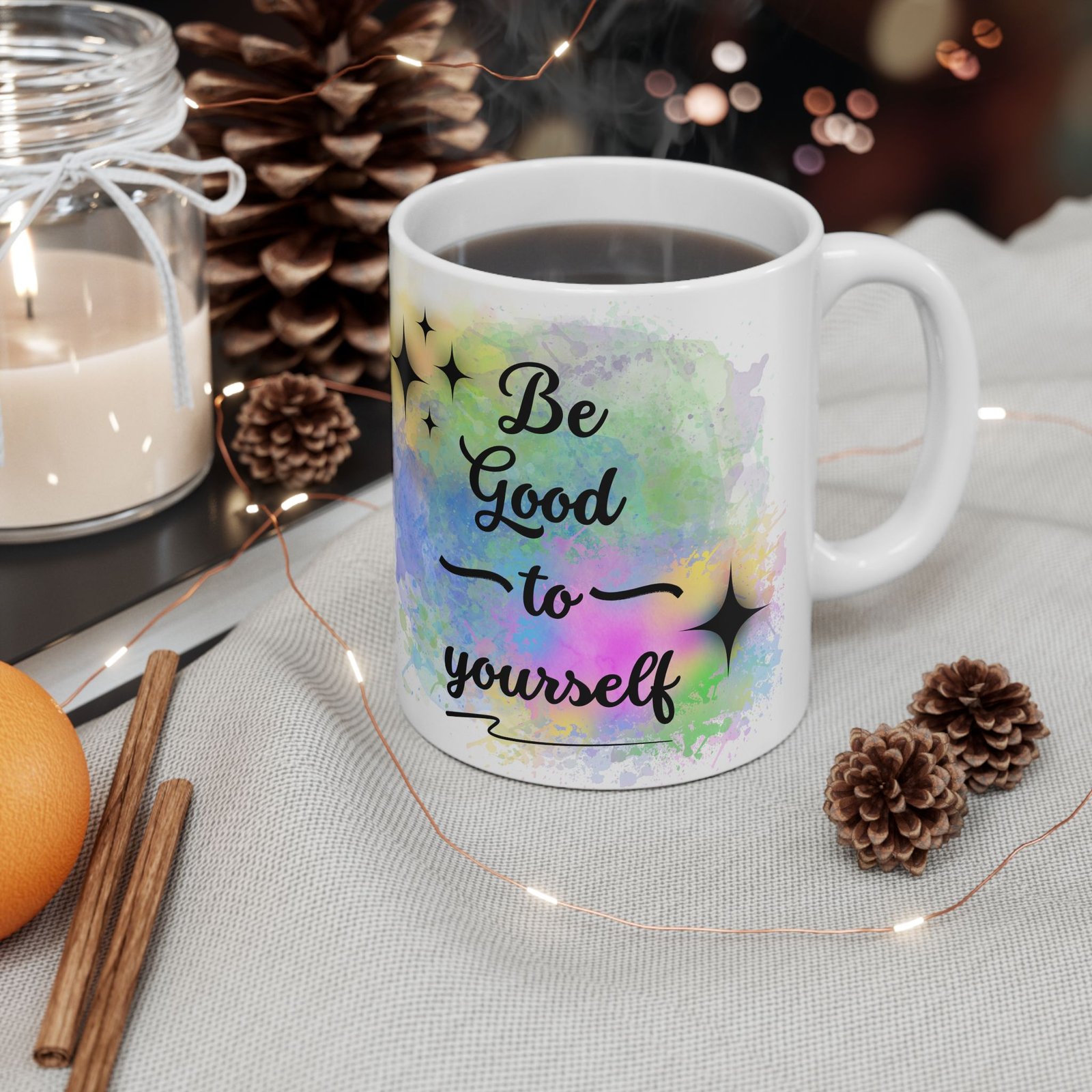 Embrace positivity with this beautifully designed mug that serves as a daily reminder to be kind to yourself. Featuring the gentle phrase “Be Good to Yourself” against a calming watercolor background and twinkling star accents, this mug is the perfect companion for moments of reflection, relaxation, or self-care. It’s not just a cup; it’s an everyday boost of inspiration!