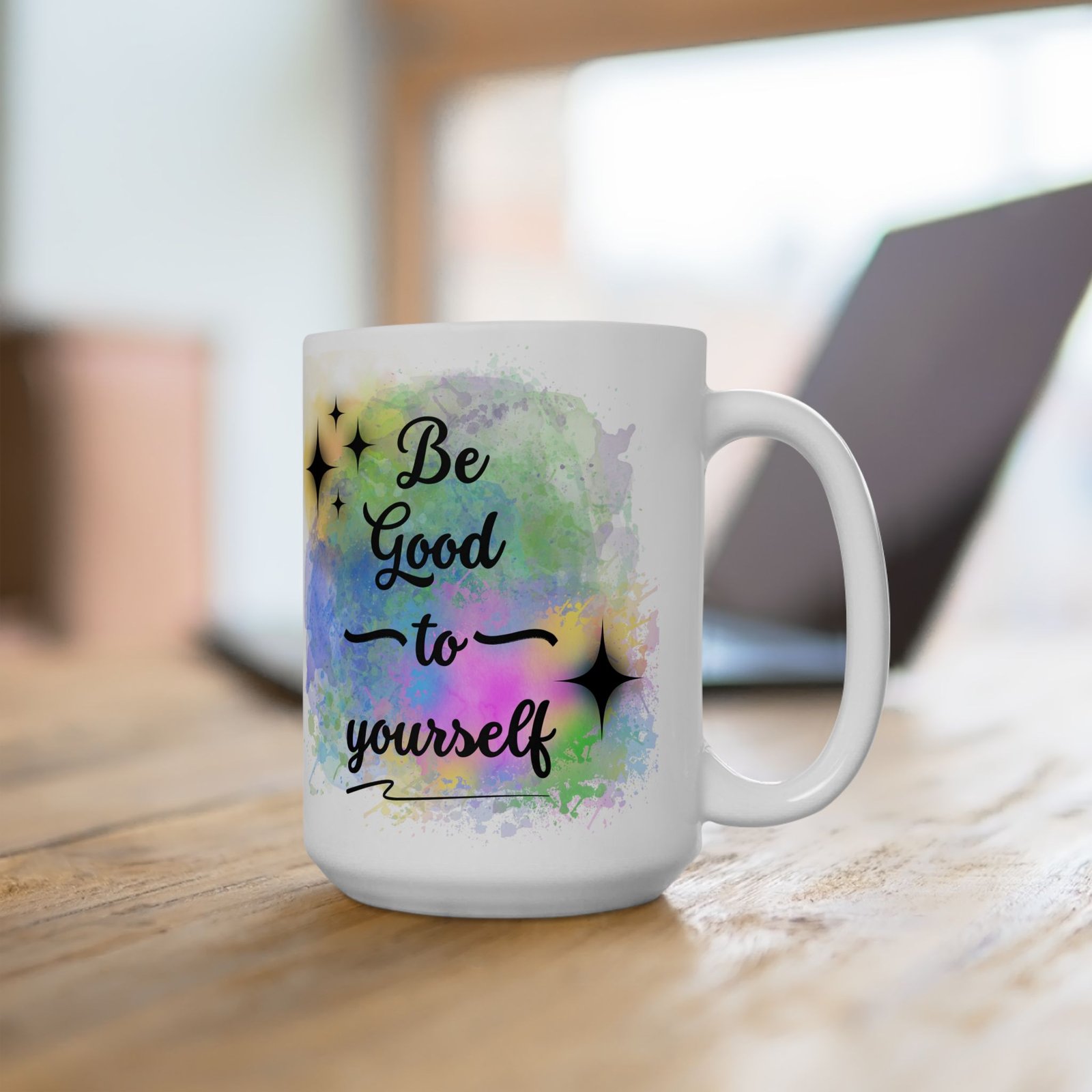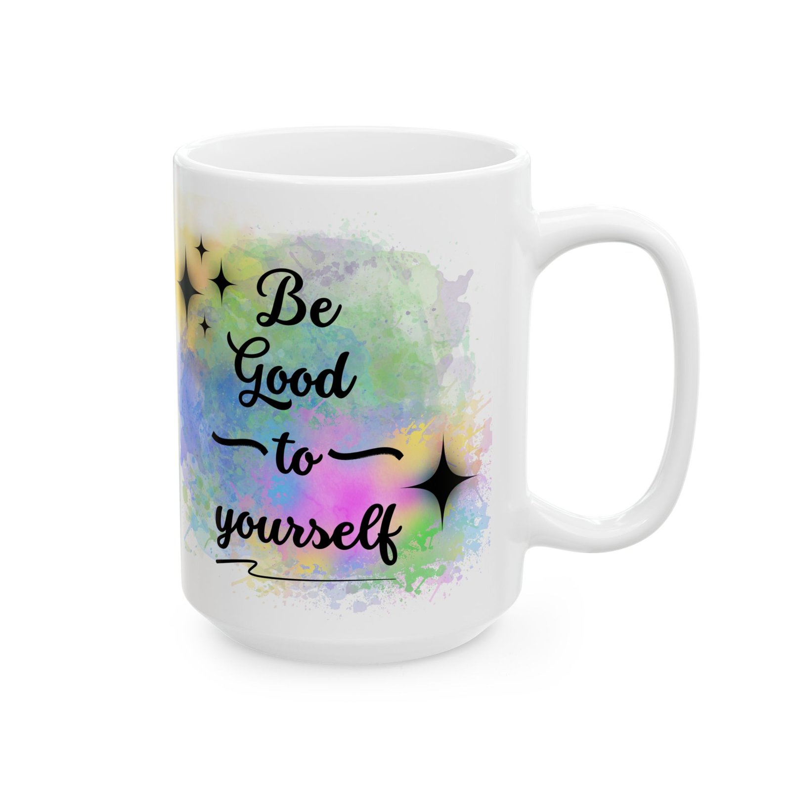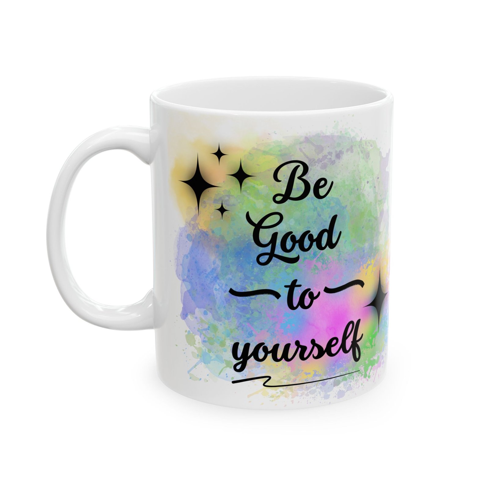 Embrace positivity with this beautifully designed mug that serves as a daily reminder to be kind to yourself. Featuring the gentle phrase “Be Good to Yourself” against a calming watercolor background and twinkling star accents, this mug is the perfect companion for moments of reflection, relaxation, or self-care. It’s not just a cup; it’s an everyday boost of inspiration!