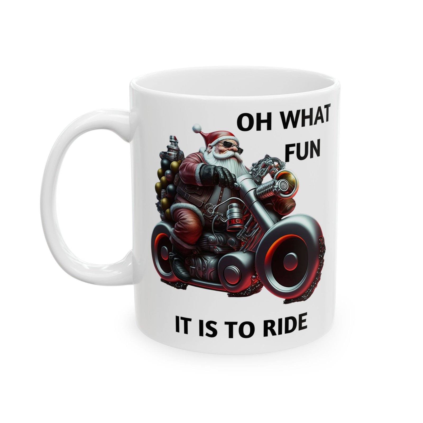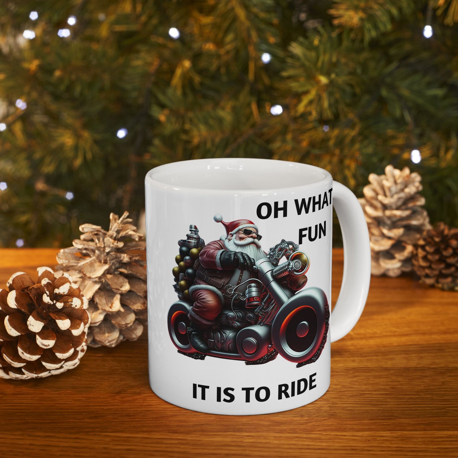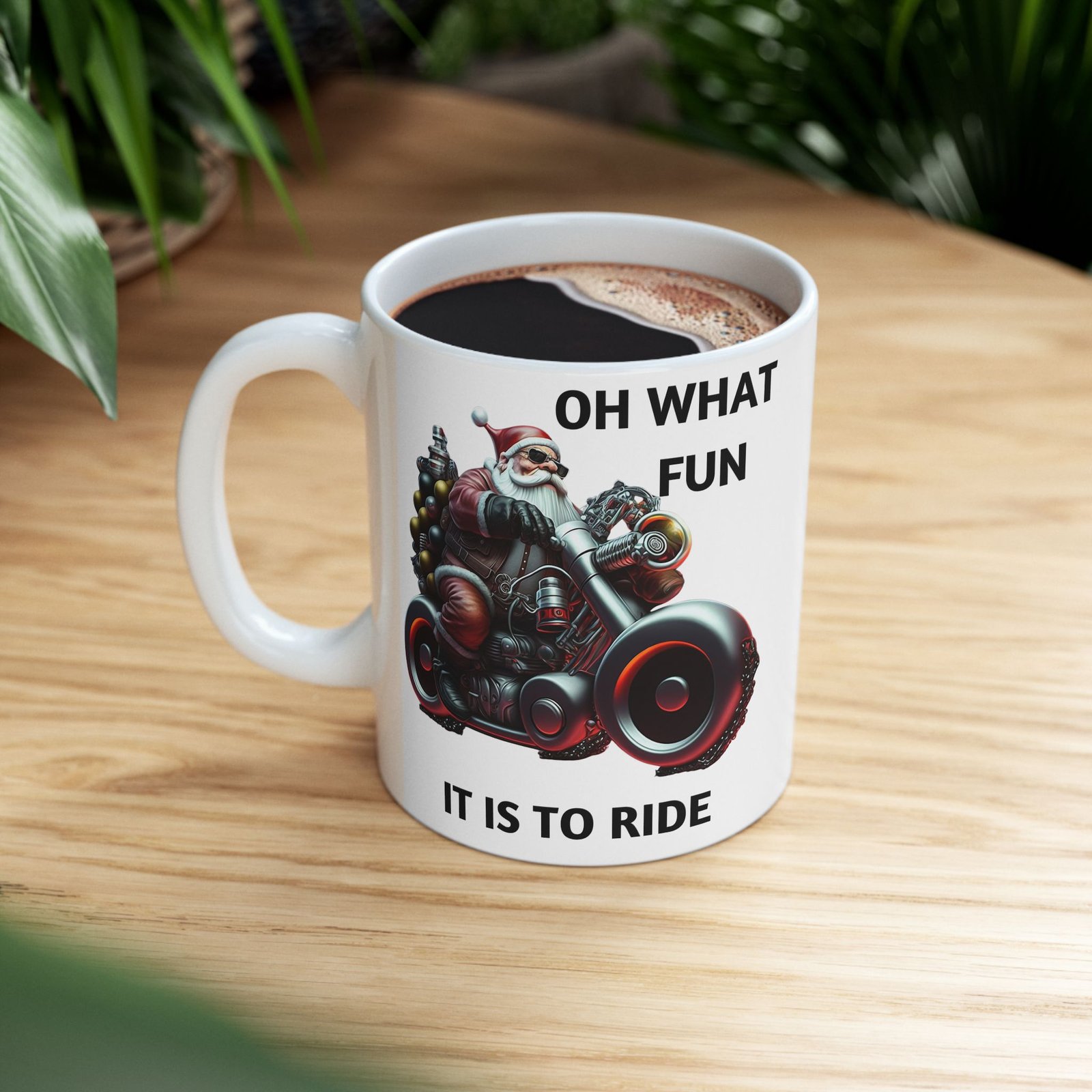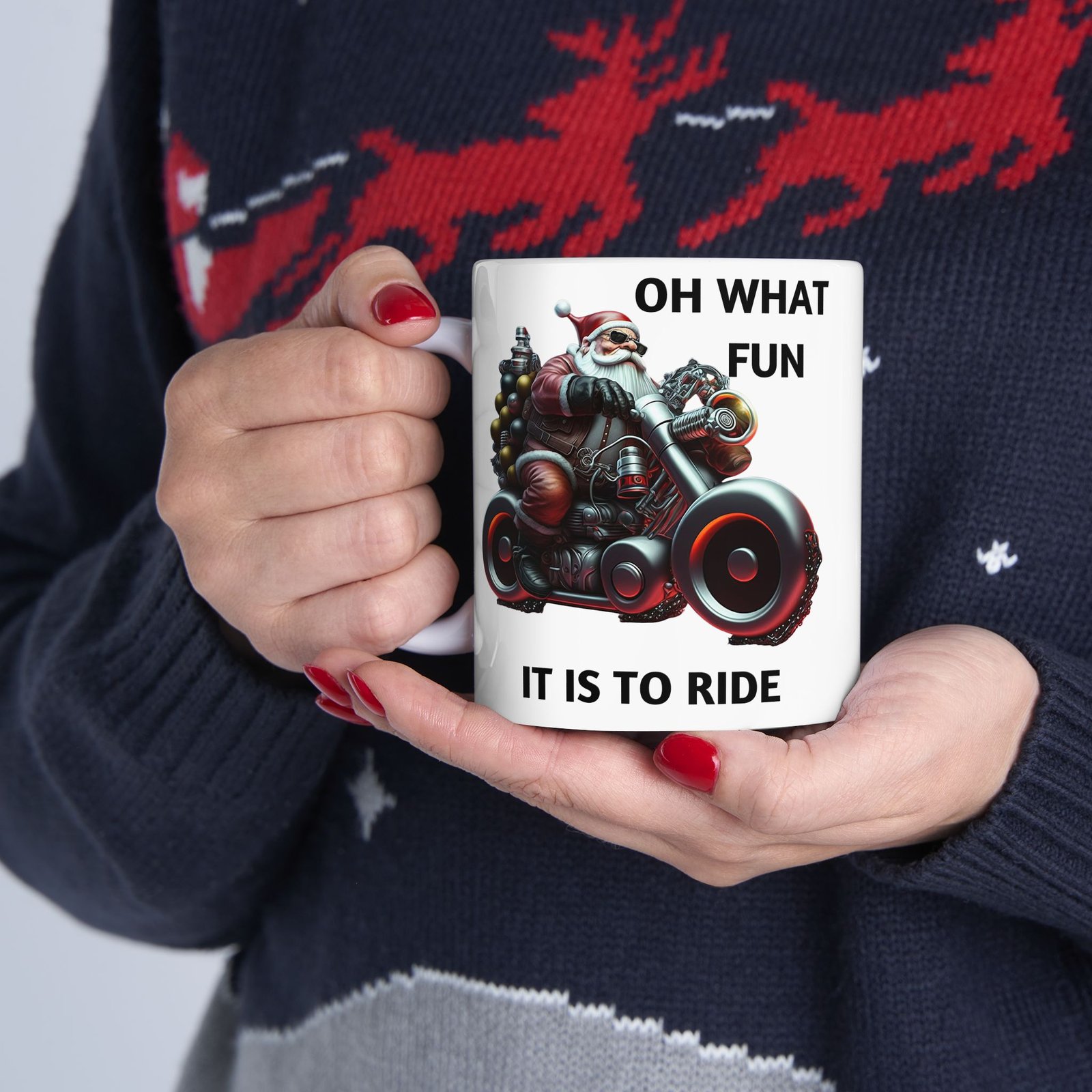 Biker Santa “Oh What Fun It Is To Ride” Mug – Modern & Funny Holiday Edition Ceramic Mug, (11oz, 15oz)