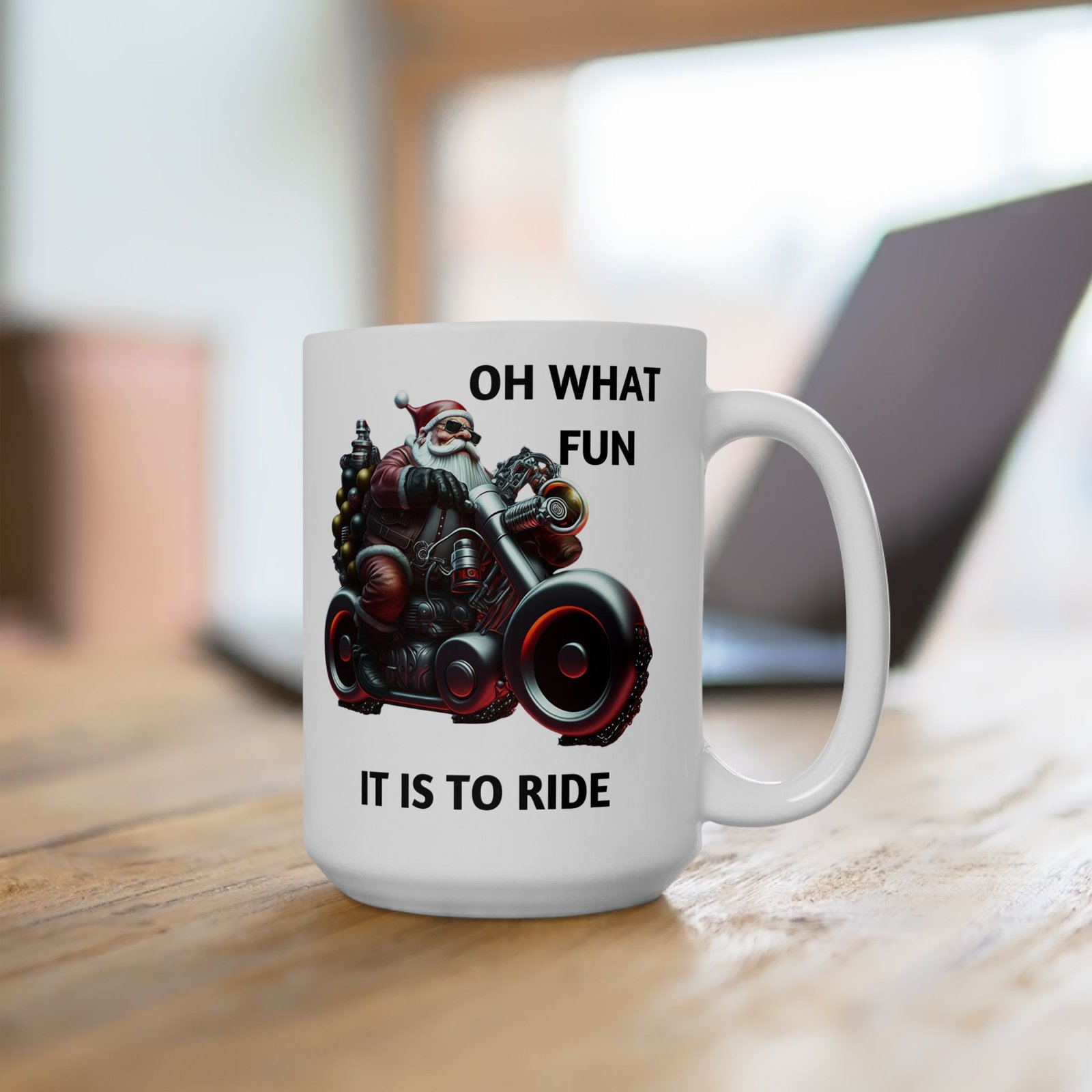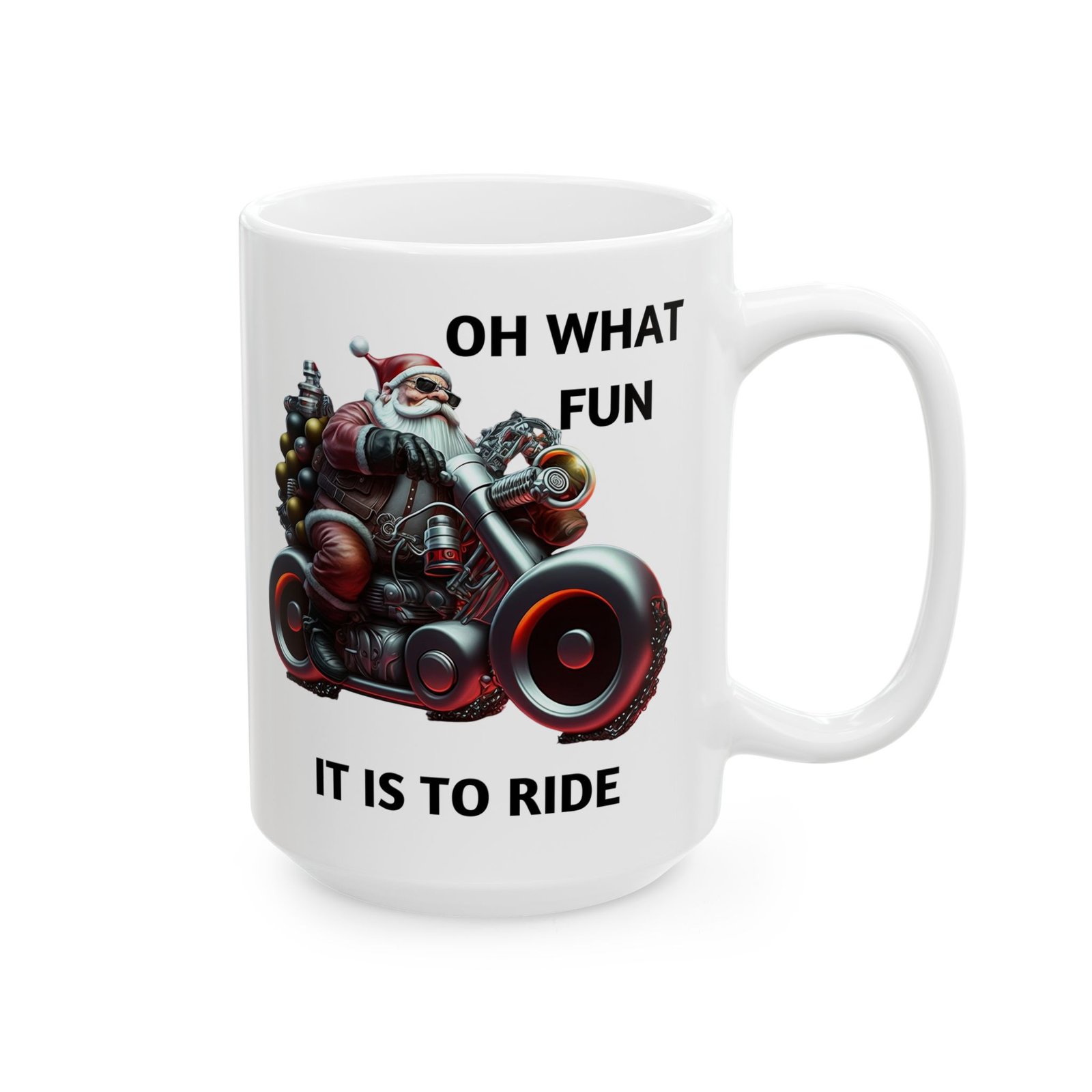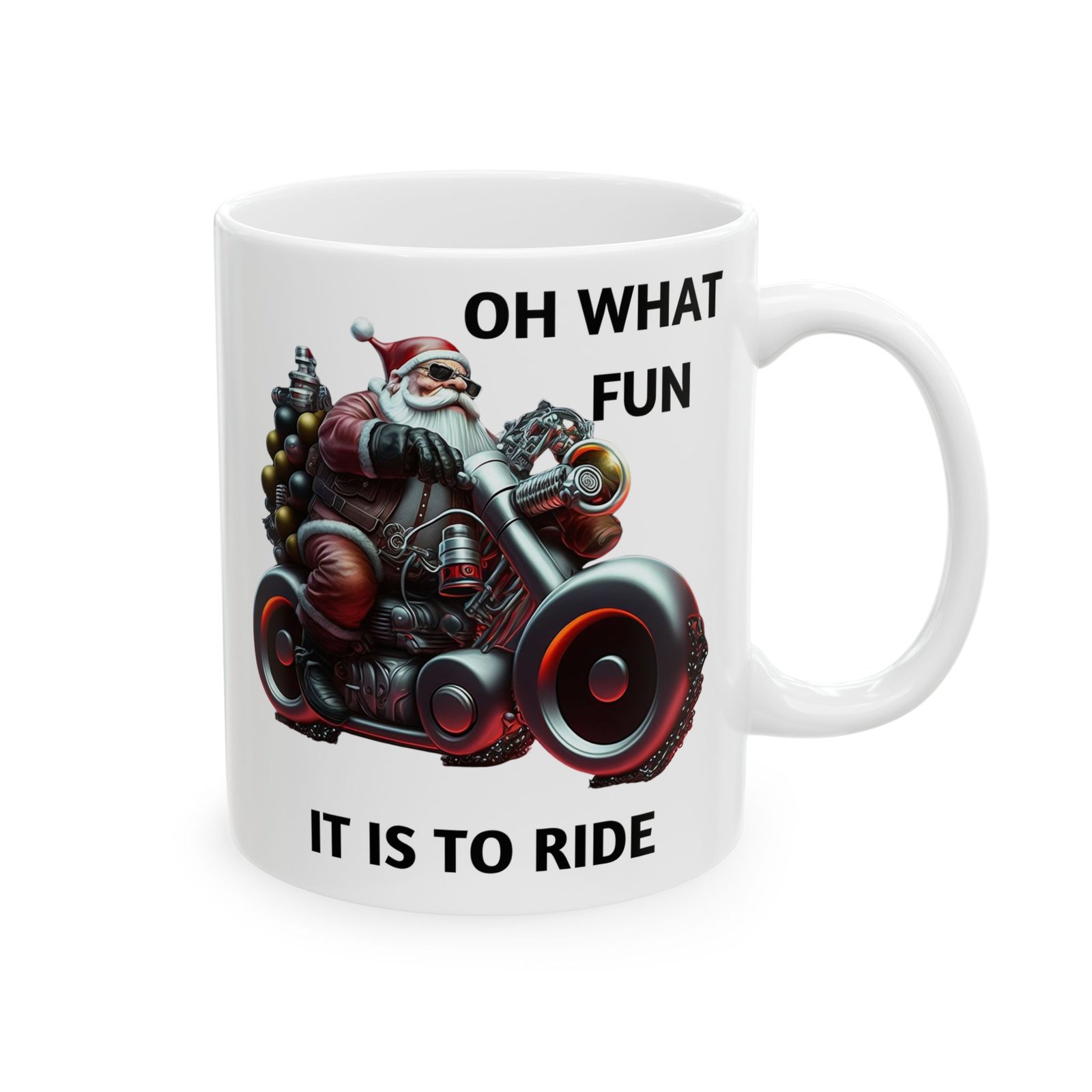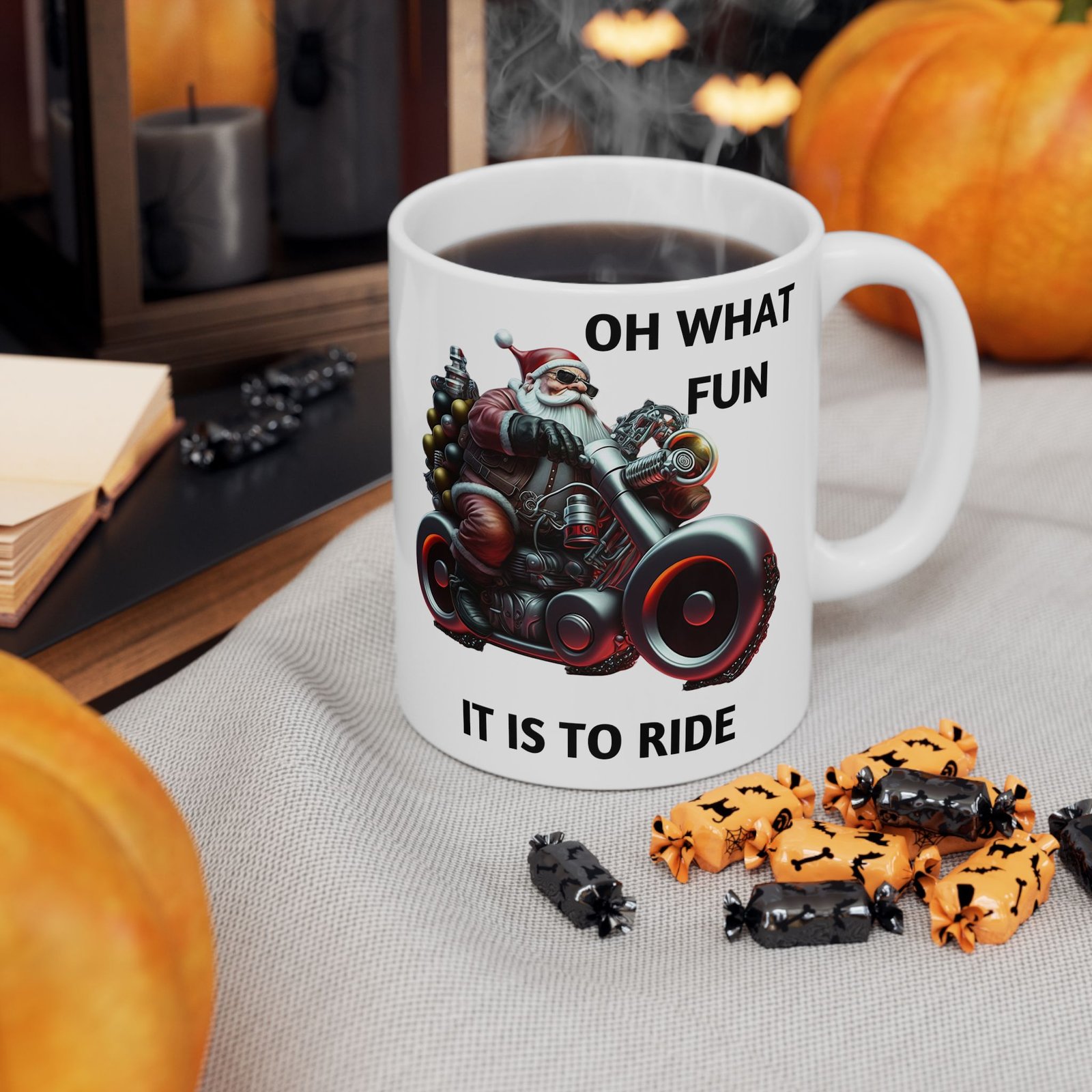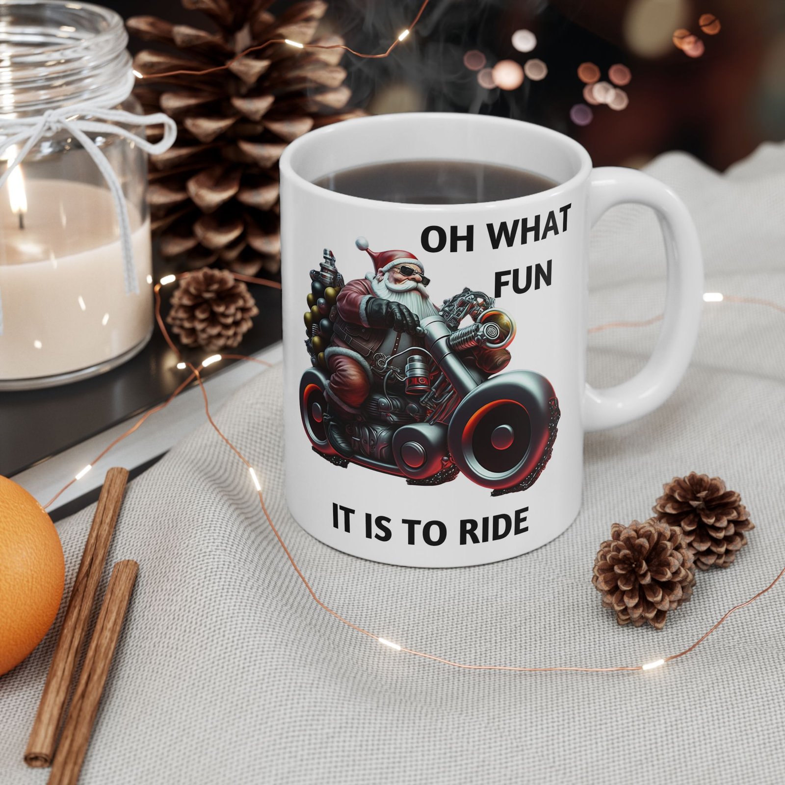 Biker Santa “Oh What Fun It Is To Ride” Mug – Modern & Funny Holiday Edition Ceramic Mug, (11oz, 15oz)
