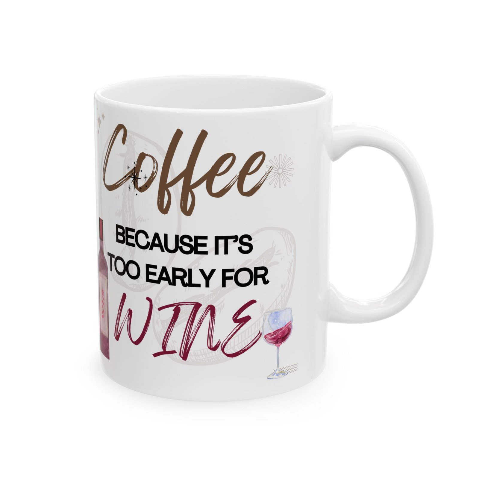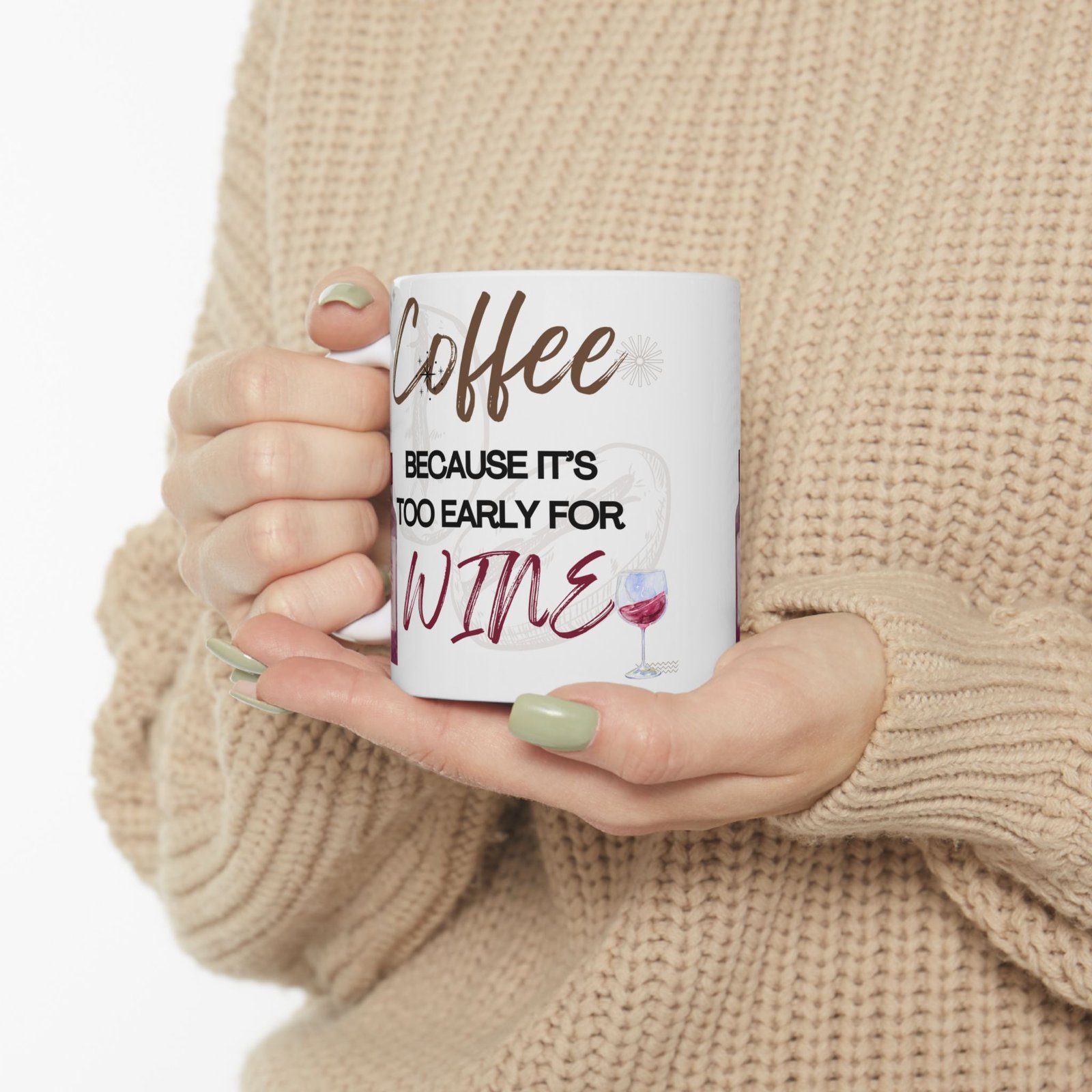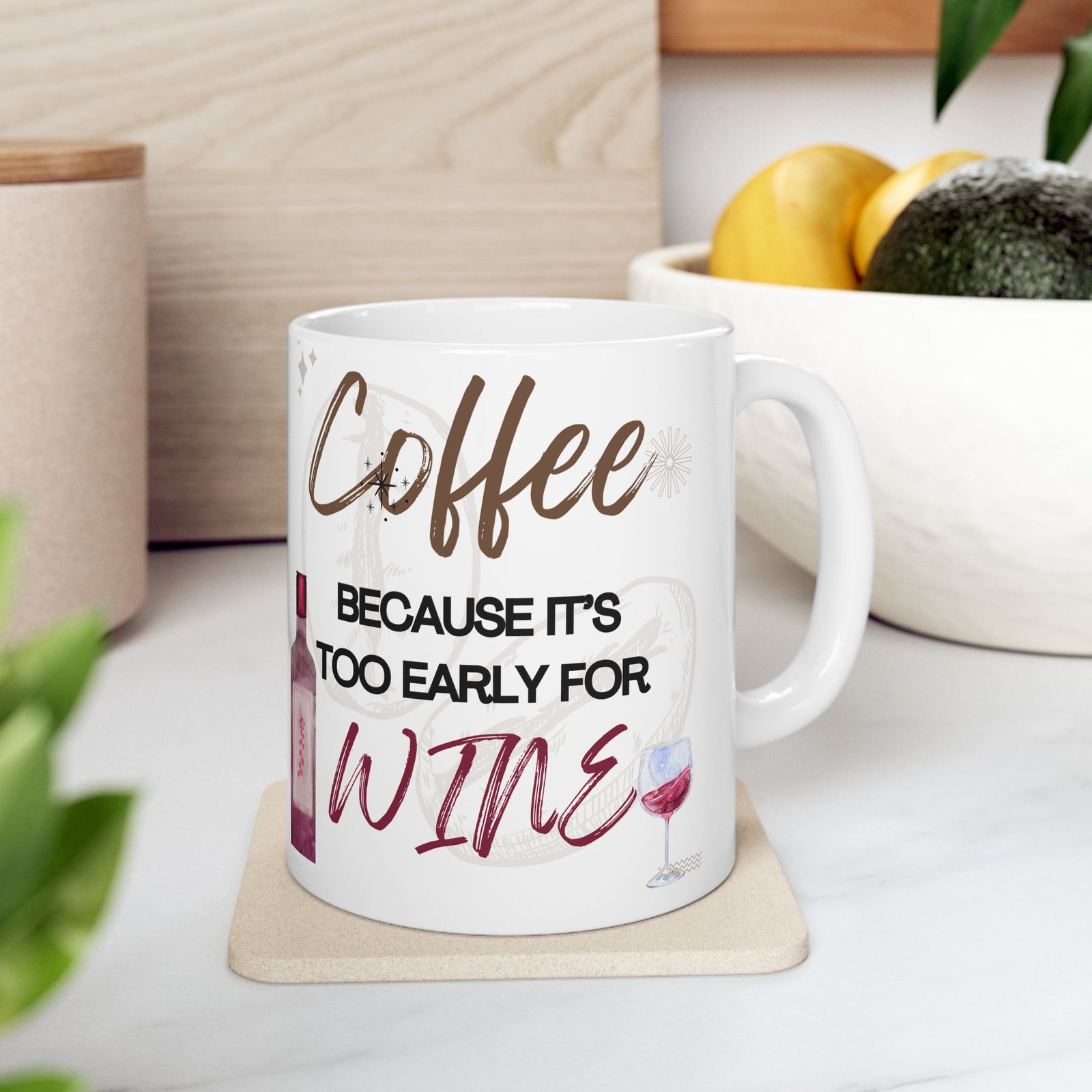 For those who joke that mornings should come with wine but settle for coffee instead, this mug is the match! Featuring the humorous phrase, “Coffee Because It’s Too Early for Wine,” alongside an elegant graphic of a red wine glass and bottle, this mug brings a smile to your face with every sip. Made from ceramic, it’s durable, microwave-safe, and easy to clean in the dishwasher. Whether it’s for yourself or as a gift for a friend who loves both coffee and wine, this mug makes mornings just a bit more fun.