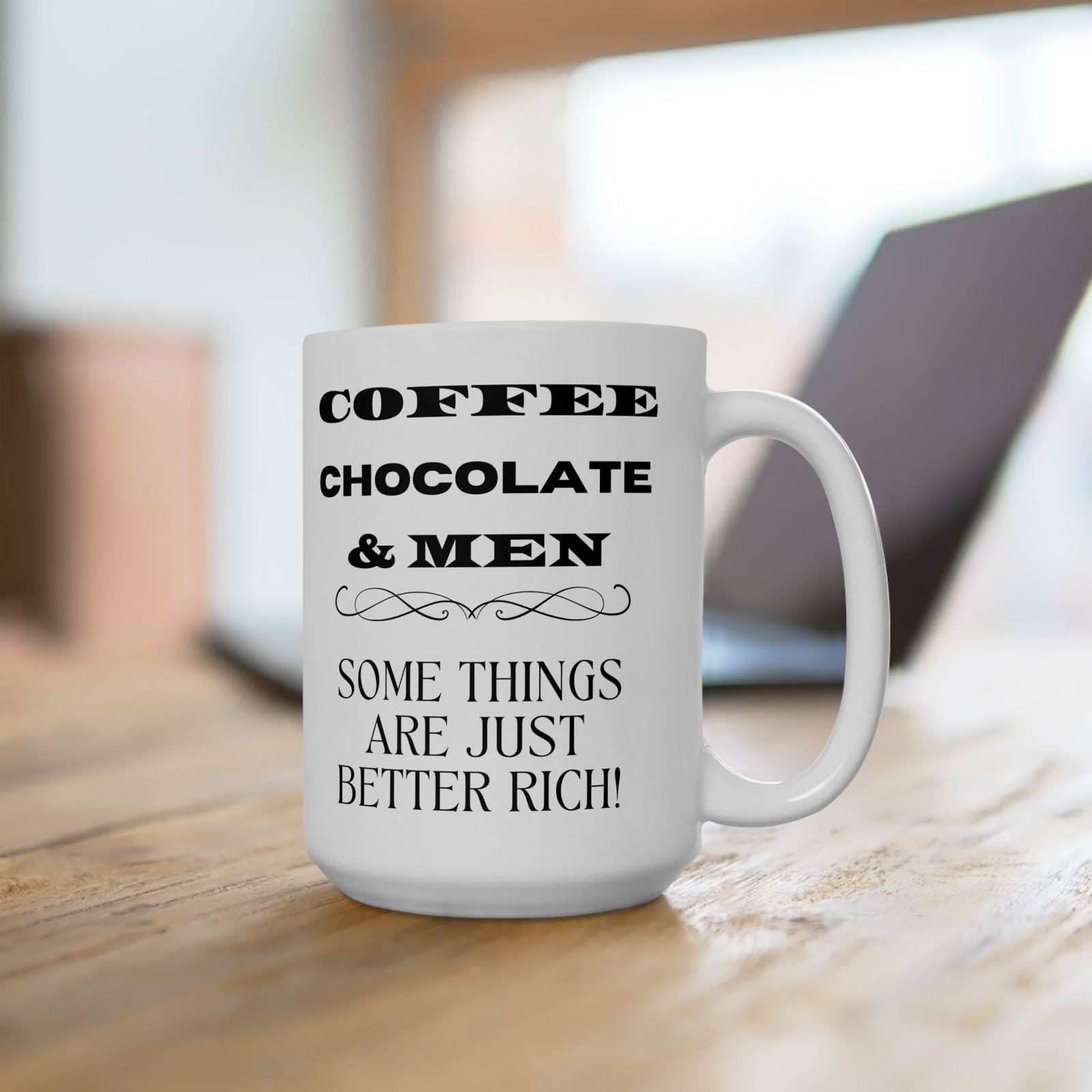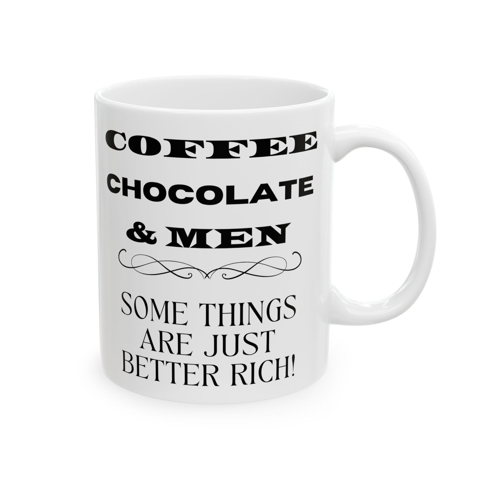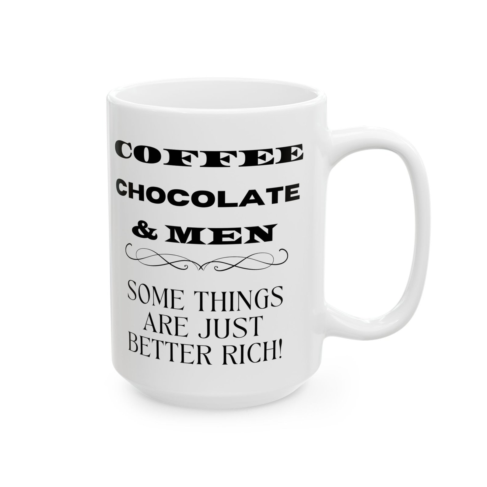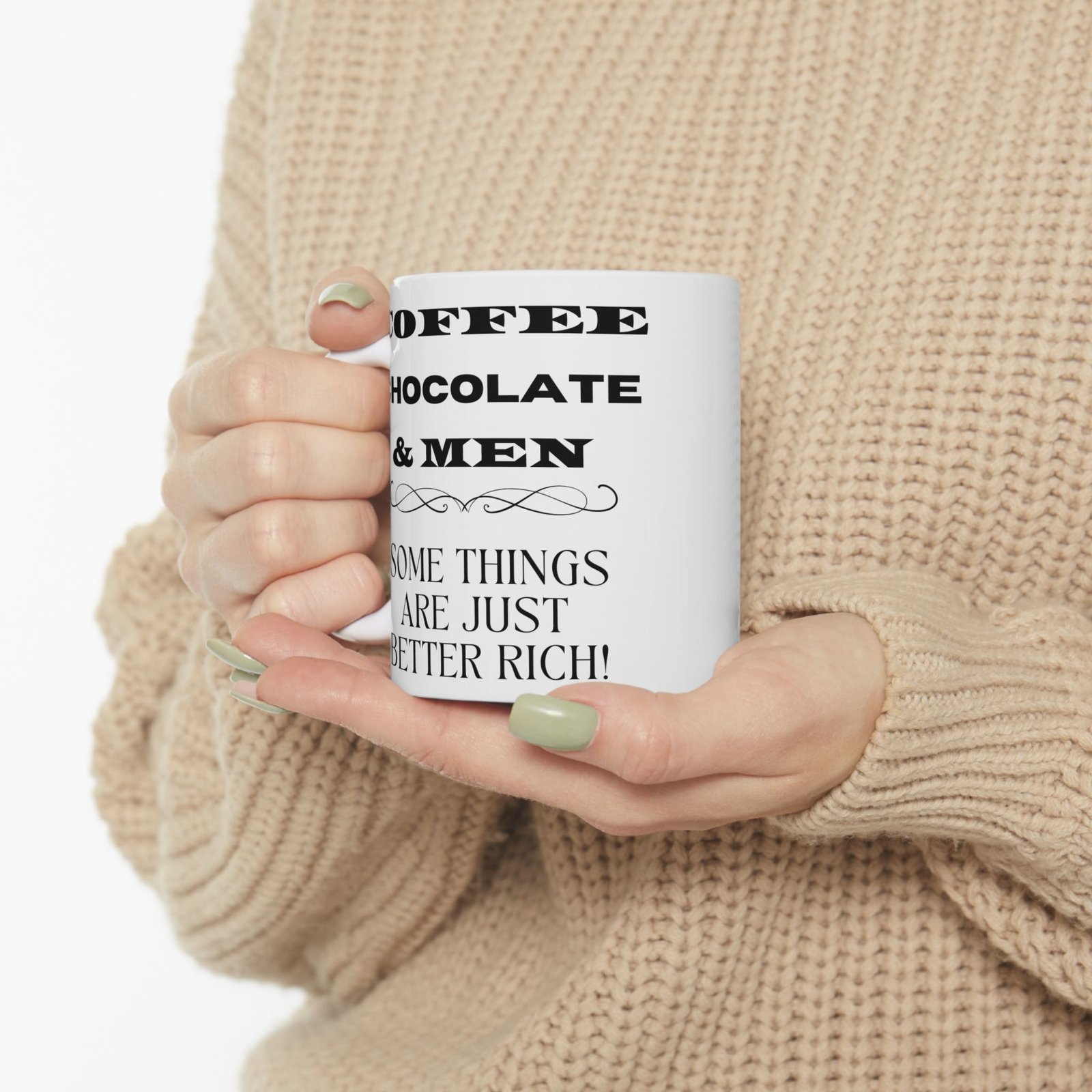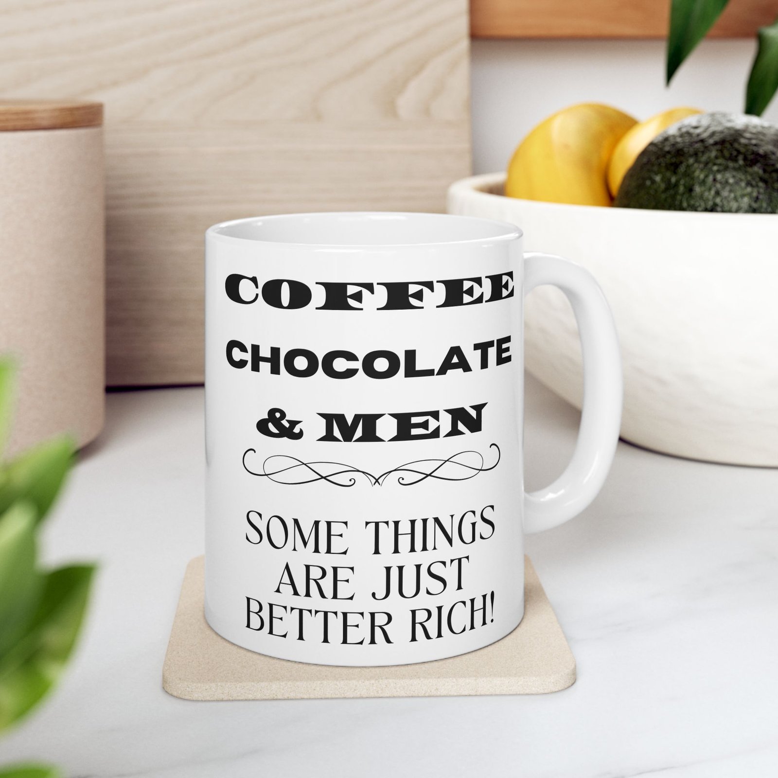 Start your day with a laugh (and maybe a little luxury) with this witty coffee mug! Featuring the sassy phrase, “Coffee, Chocolate & Men… Some Things Are Just Better Rich!” it’s the perfect blend of humor and style for your morning routine. Available in both 11oz and 15oz sizes, this ceramic mug is built to last with a finish that’s both microwave and dishwasher safe. for coffee lovers with a taste for sarcasm, this mug makes a fabulous gift for birthdays, holidays, or just because – because who doesn’t need a little laugh with their coffee?
