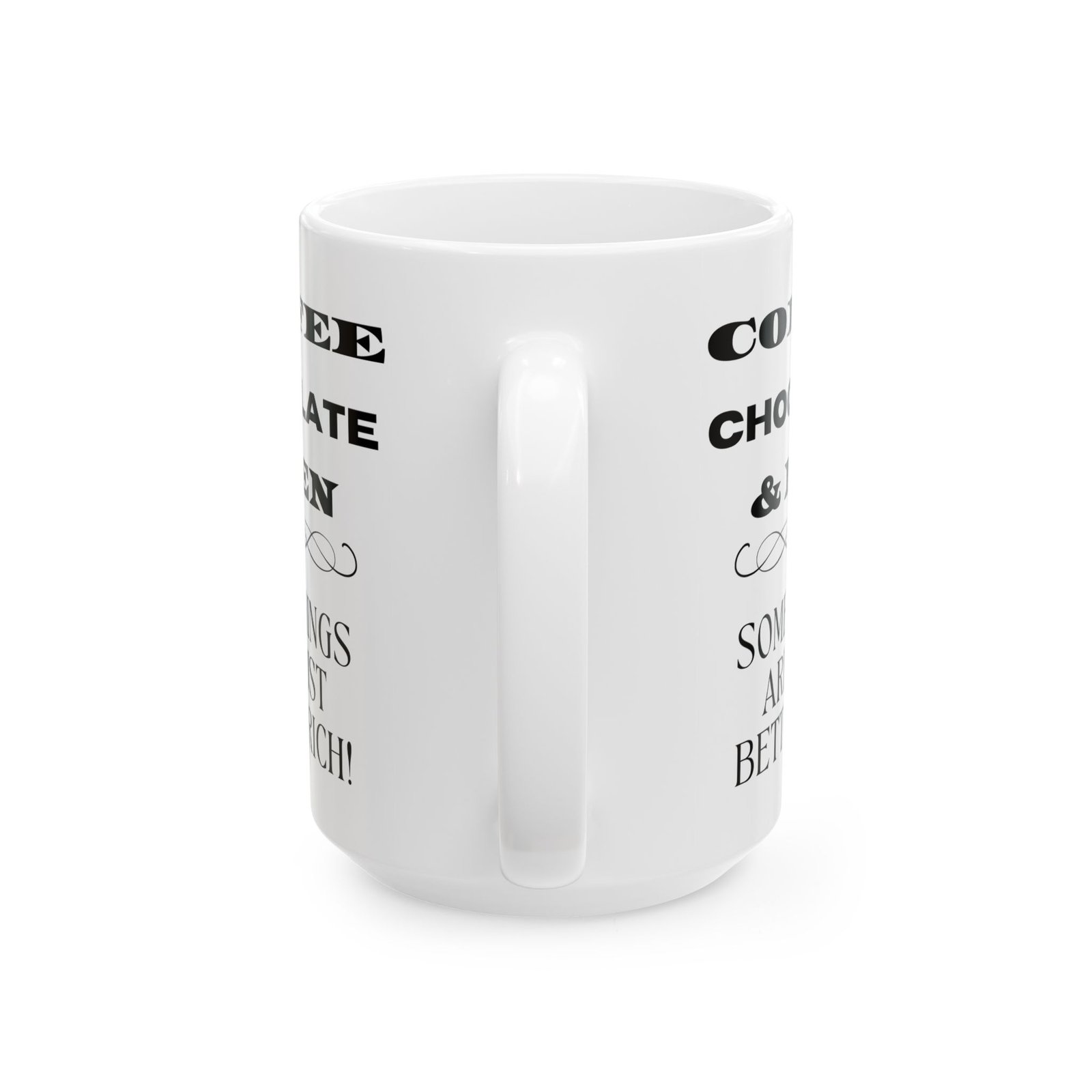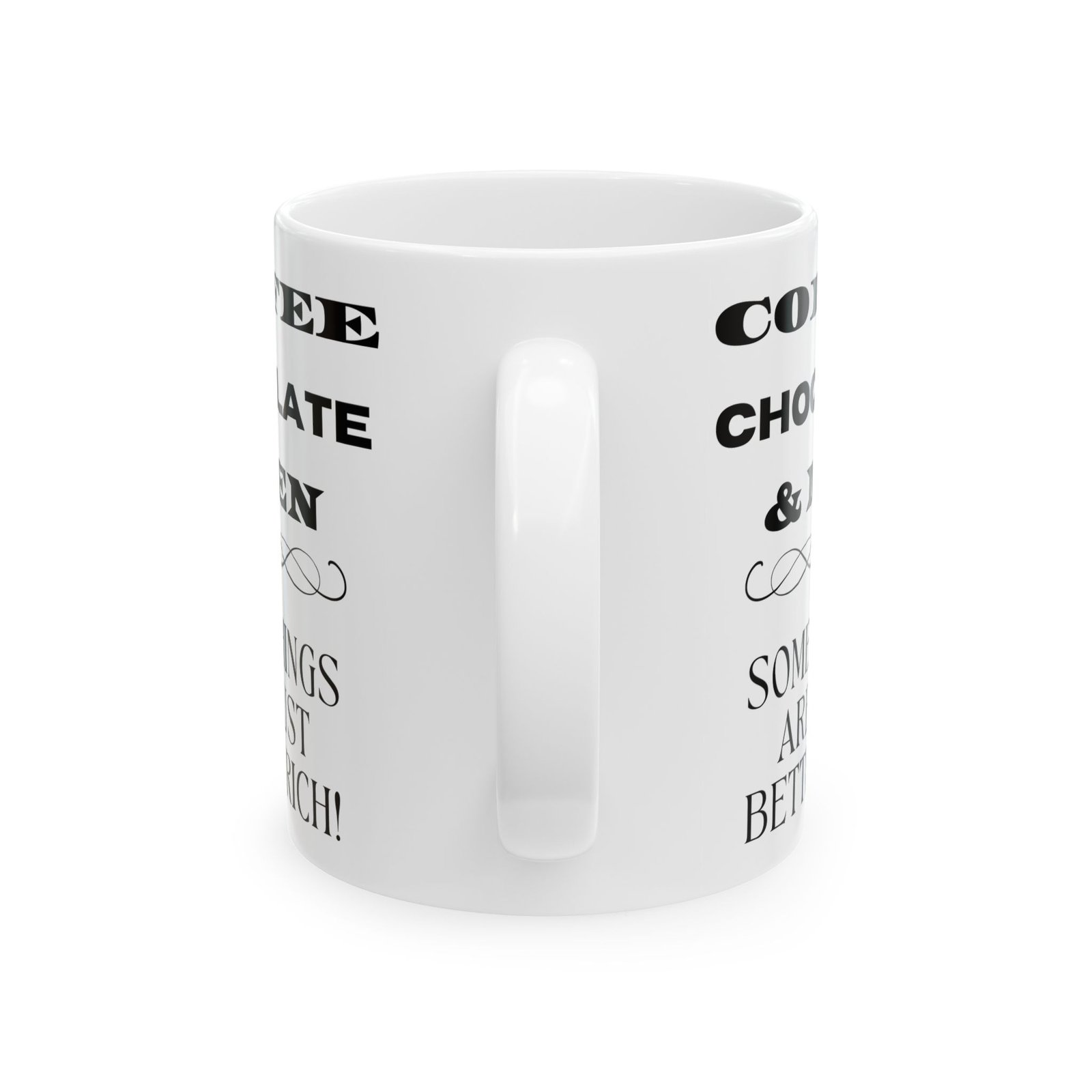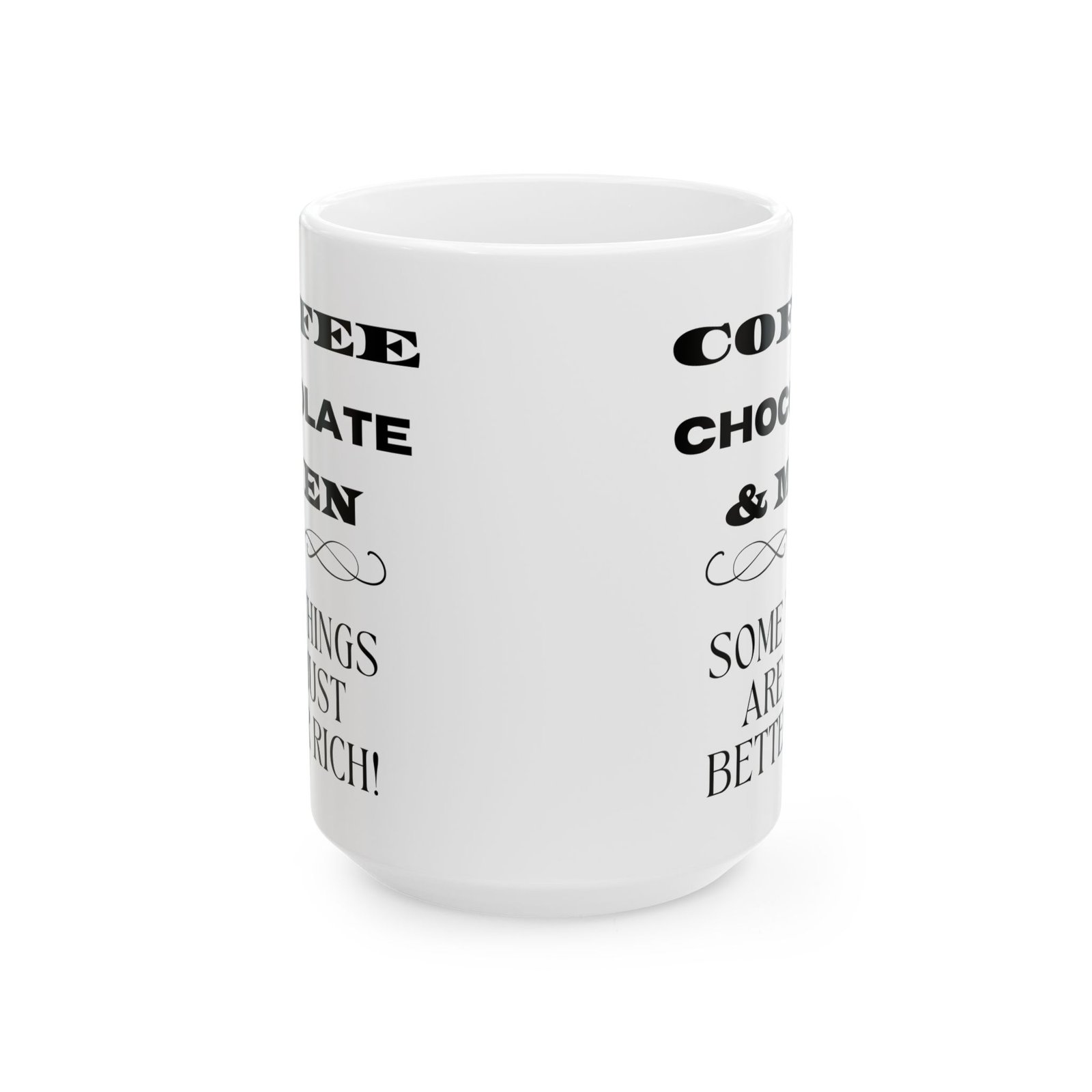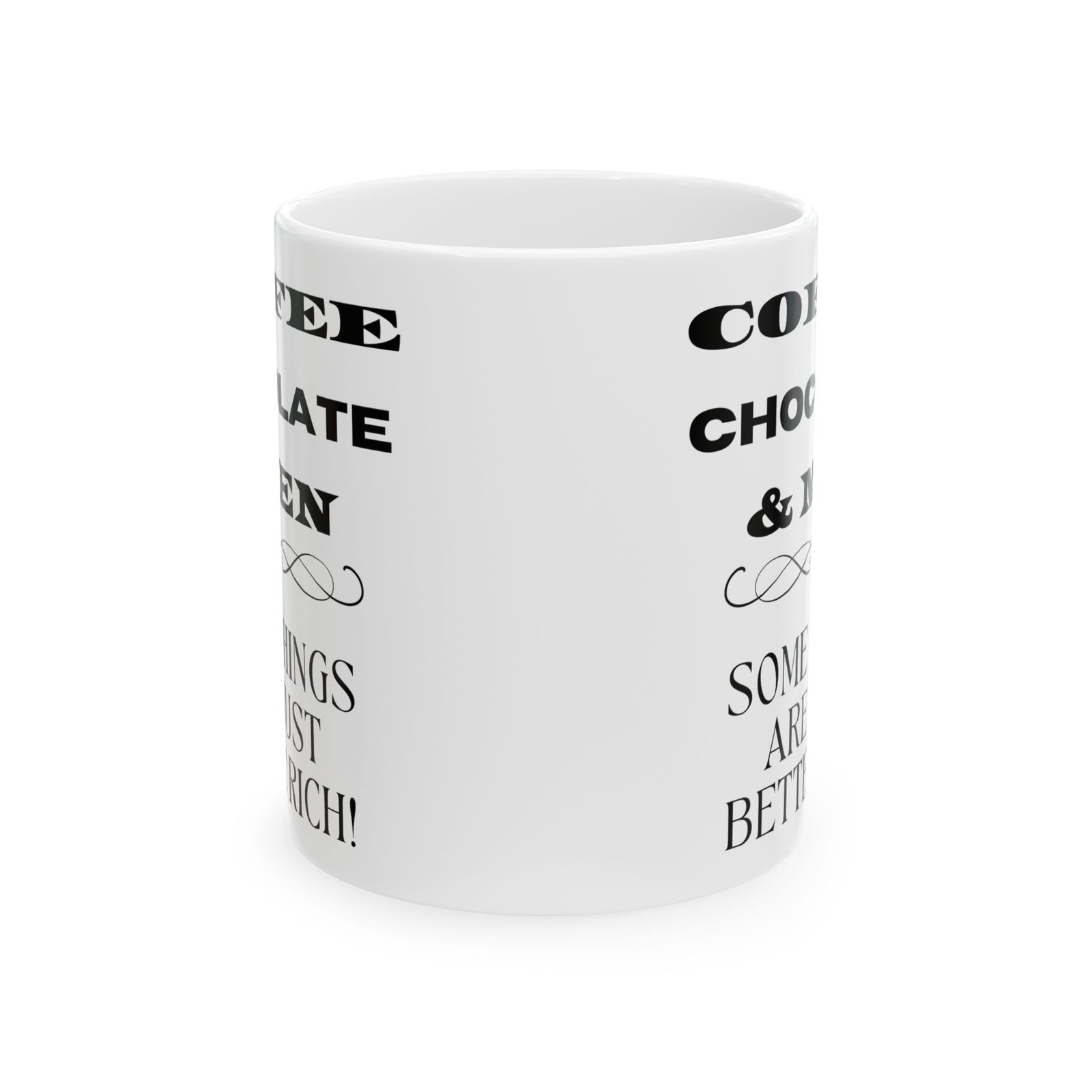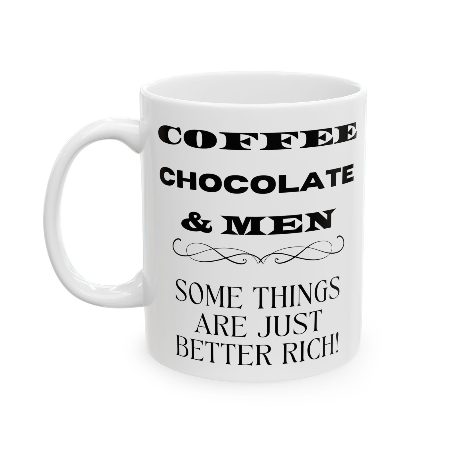 Start your day with a laugh (and maybe a little luxury) with this witty coffee mug! Featuring the sassy phrase, “Coffee, Chocolate & Men… Some Things Are Just Better Rich!” it’s the perfect blend of humor and style for your morning routine. Available in both 11oz and 15oz sizes, this ceramic mug is built to last with a finish that’s both microwave and dishwasher safe. for coffee lovers with a taste for sarcasm, this mug makes a fabulous gift for birthdays, holidays, or just because – because who doesn’t need a little laugh with their coffee?
