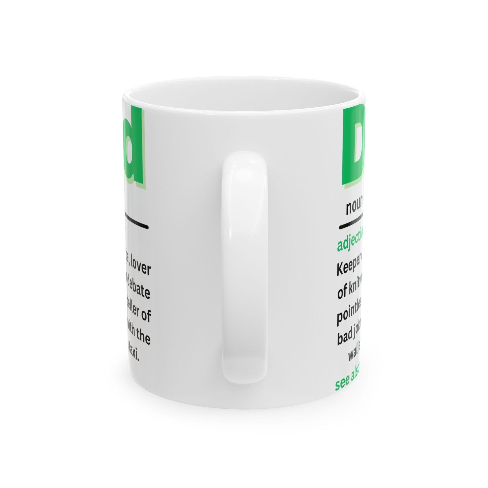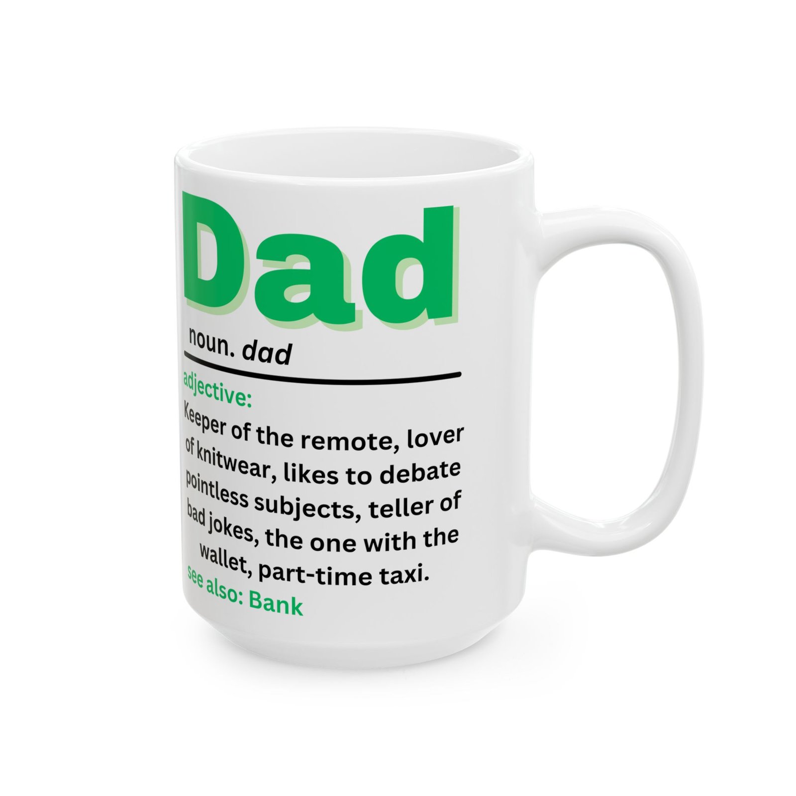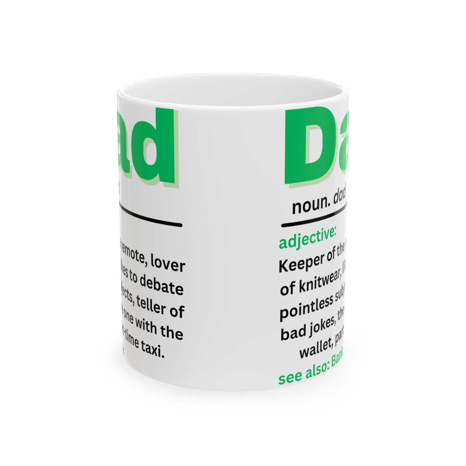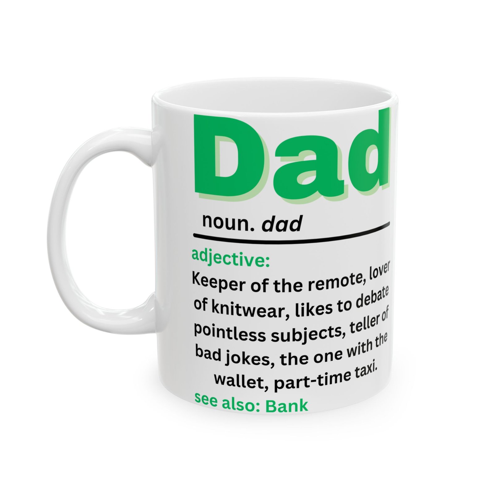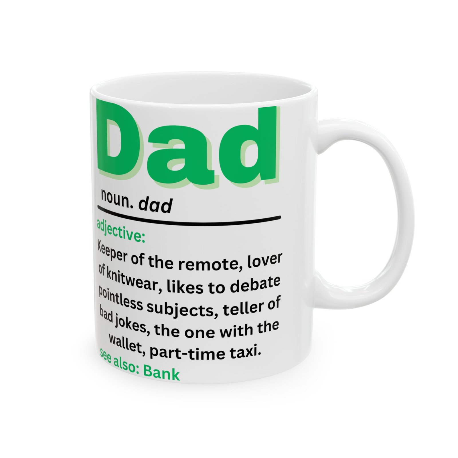 Celebrate all the classic dad traits with the Dad Definition Funny Mug! This hilarious mug features a playful definition of “dad” including “keeper of the remote,” “lover of knitwear,” and “teller of bad jokes”, plus a nod to his role as the family “bank” and “part-time taxi”. Printed in bold green lettering, this mug is the gift for dads who take pride in their quirks. Available in both 11 oz and 15 oz sizes, this ceramic mug is microwave and dishwasher safe, so dad can easily enjoy his favorite drink without any hassle. Whether you’re looking for a Father’s Day gift, birthday present, or just want to show dad some love, this mug is sure to become his new go-to!