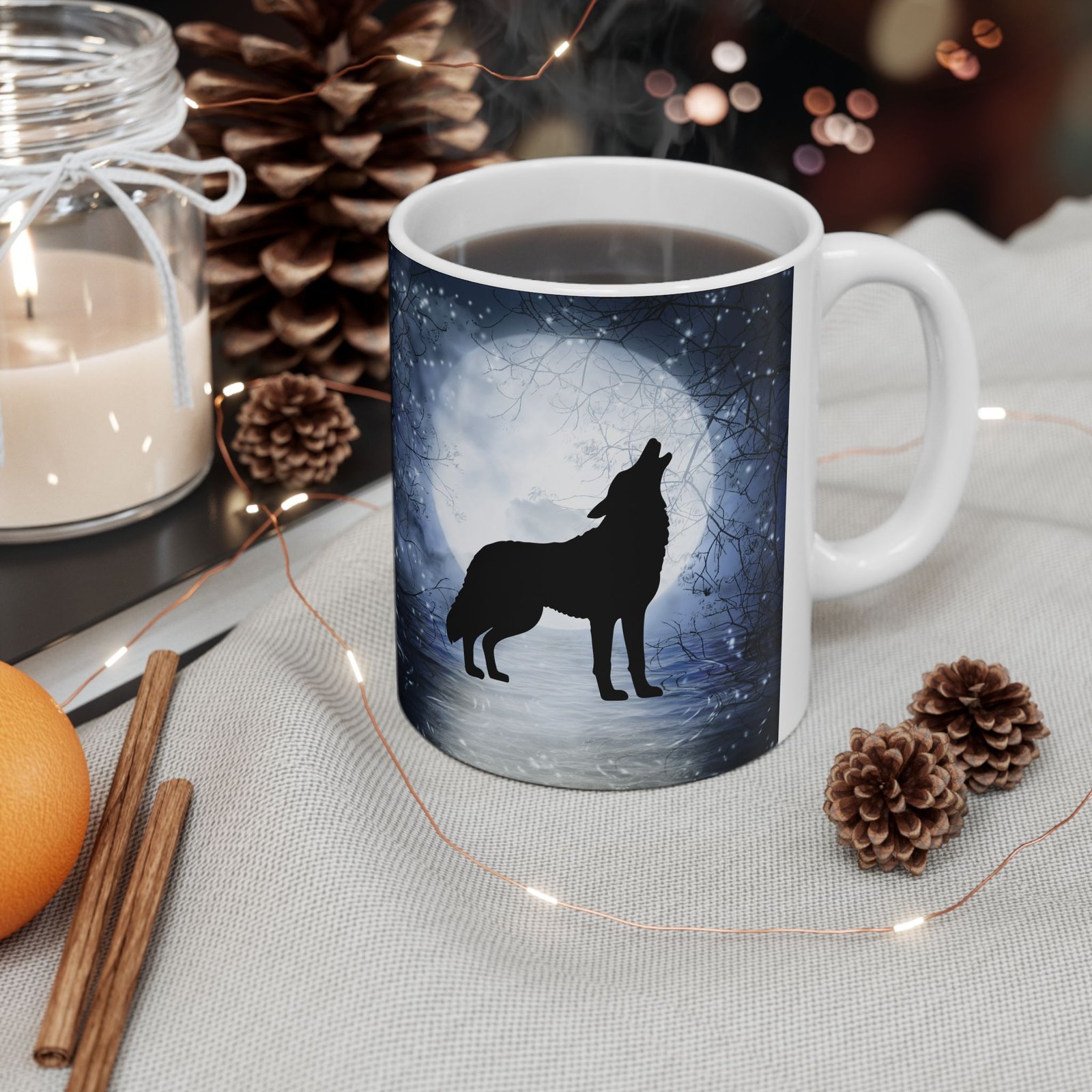 Featuring a powerful silhouette of a wolf howling beneath a glowing full moon, this mug is perfect for nature lovers and those who are captivated by the wild.