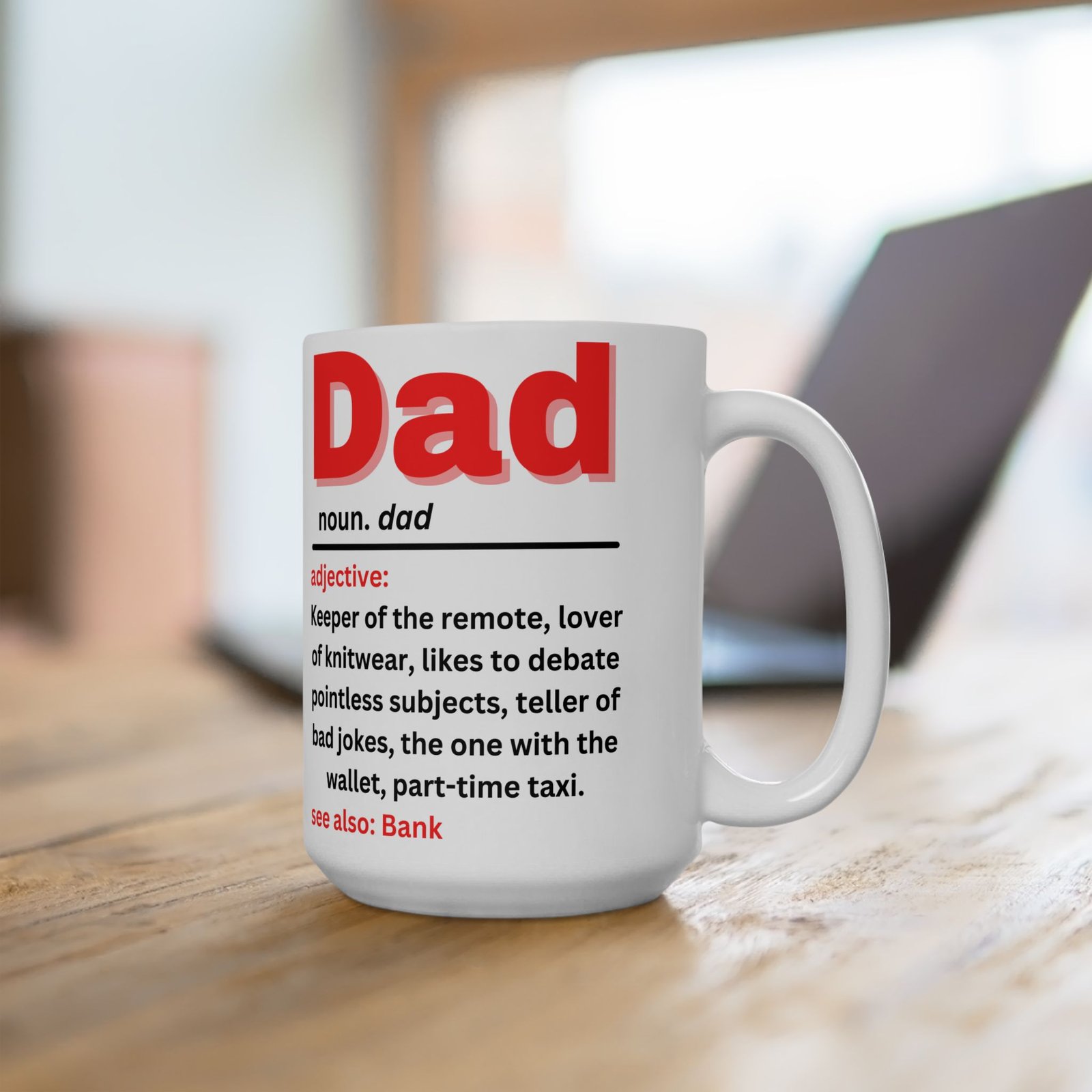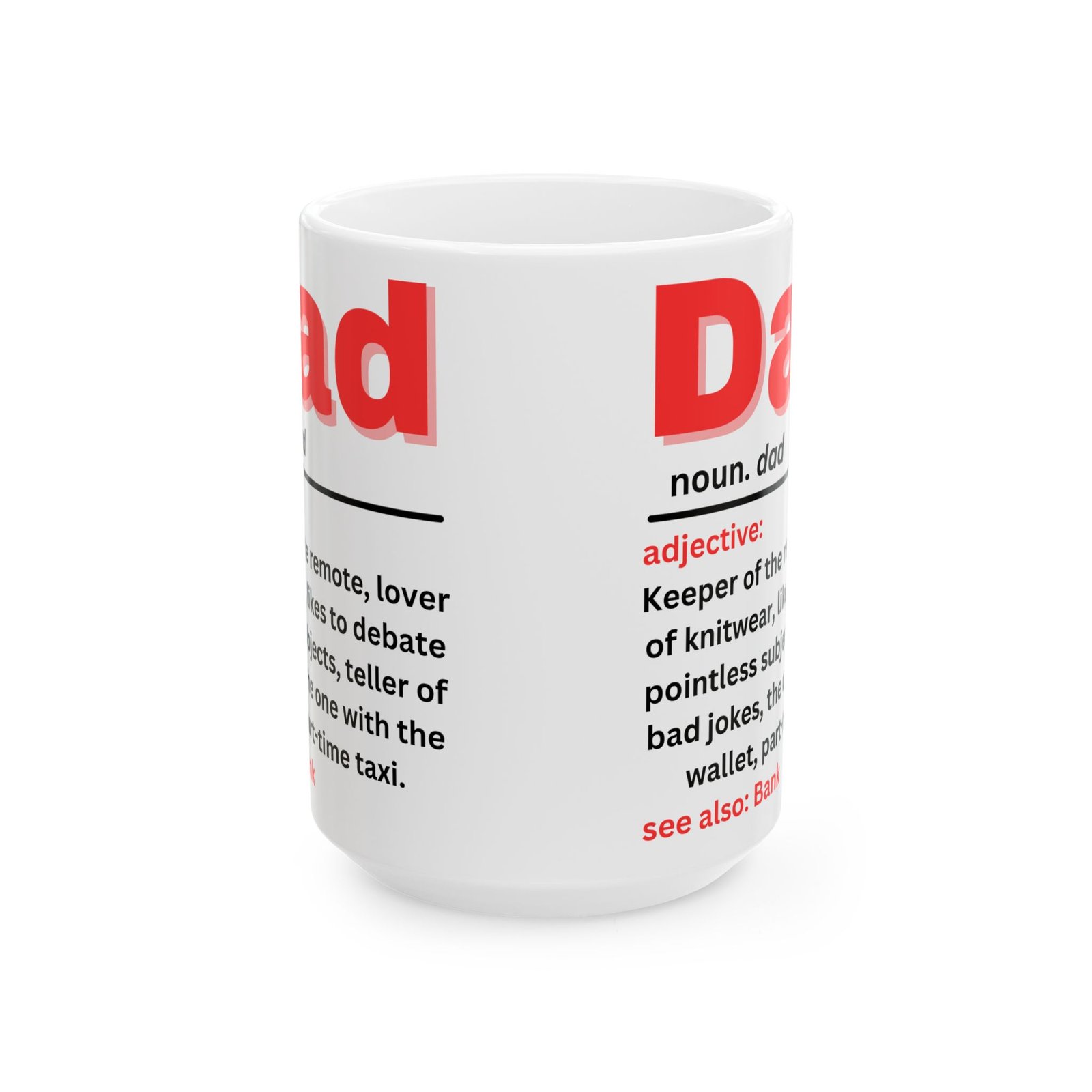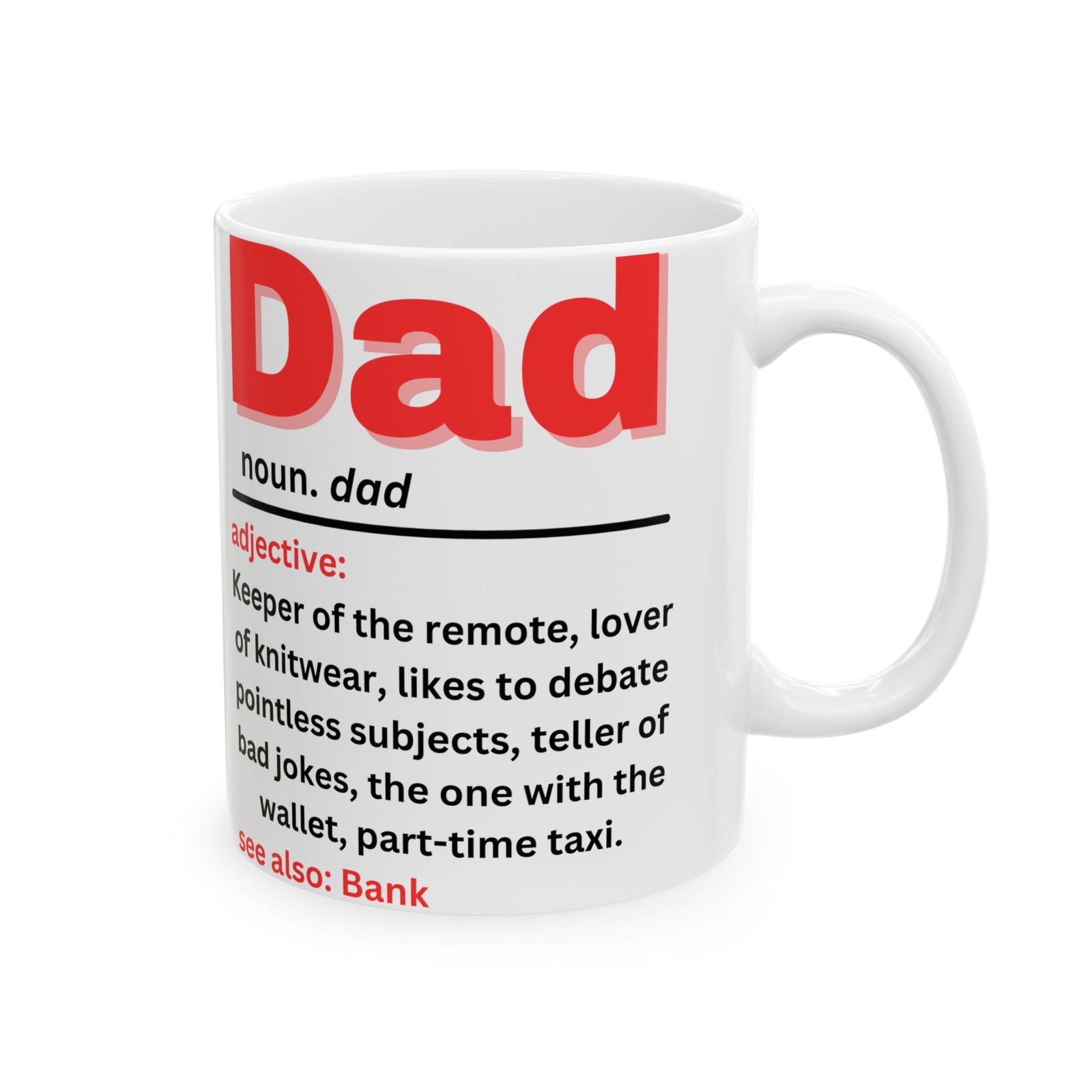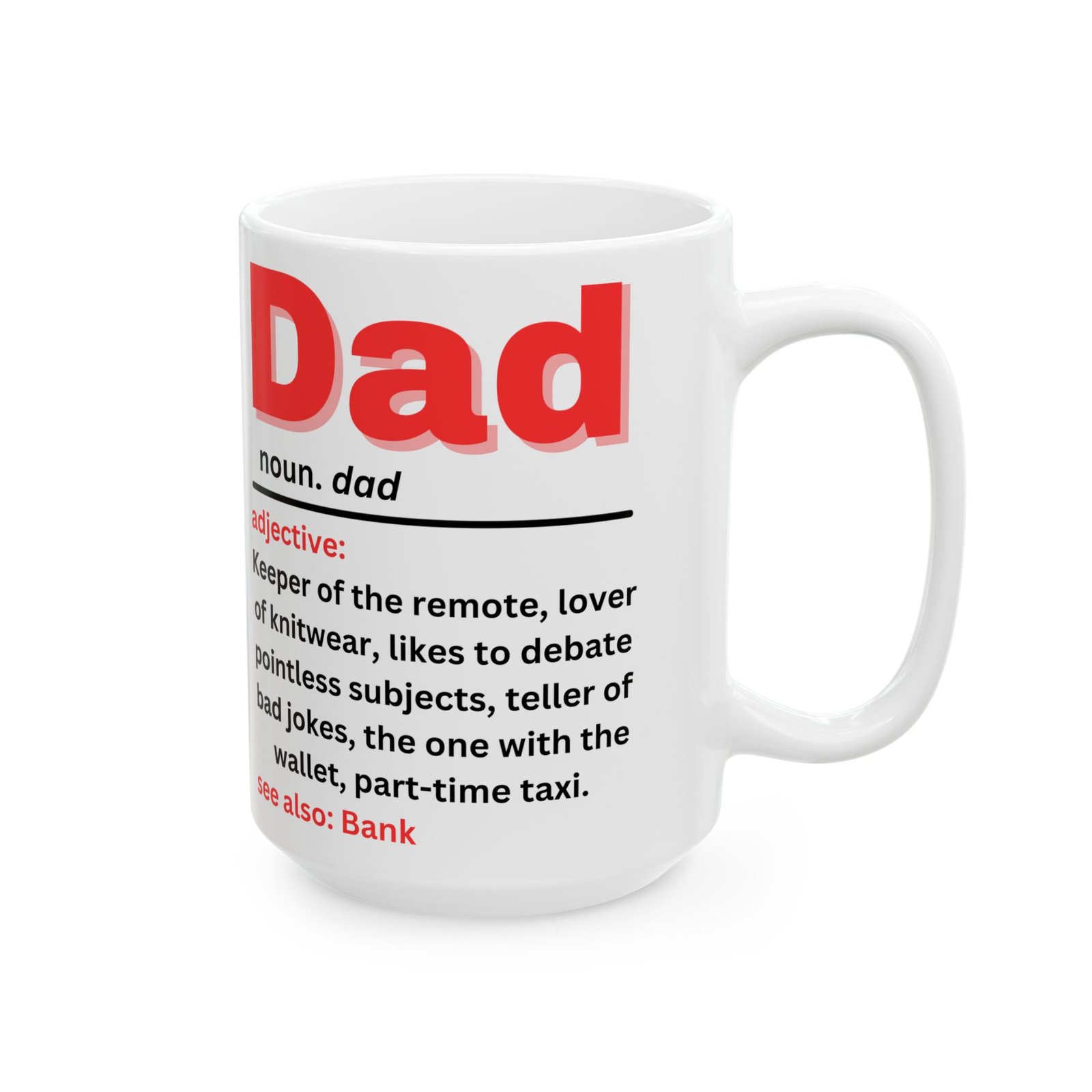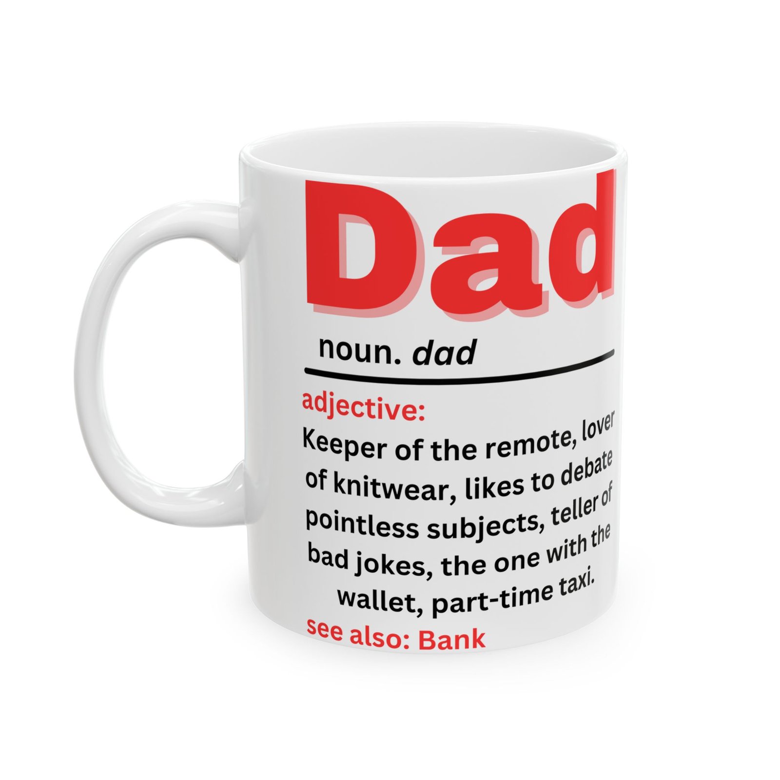 Celebrate the quirks and charm of fatherhood with this Funny Dad Definition Mug. Featuring the humorous definition of “Dad” in bold red lettering: “Keeper of the remote, lover of knitwear, teller of bad jokes, part-time taxi,” this mug captures the essence of every dad. Whether he’s the king of bad jokes or the one with the wallet, this mug is a lighthearted reminder of all the ways dads make life fun (and funny!). Made from durable ceramic, it’s available in both 11oz and 15oz sizes, and is the gift for Father’s Day, birthdays, or just because. Also see: Bank—because we all know Dad is always there when we need him!