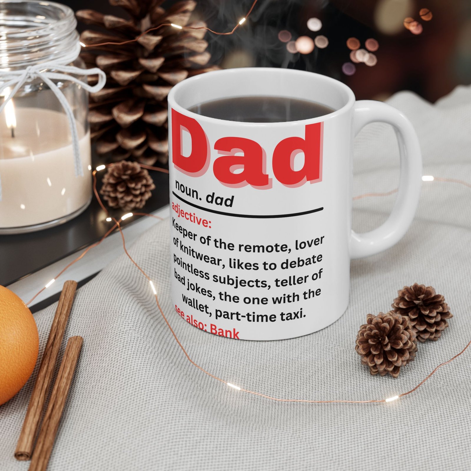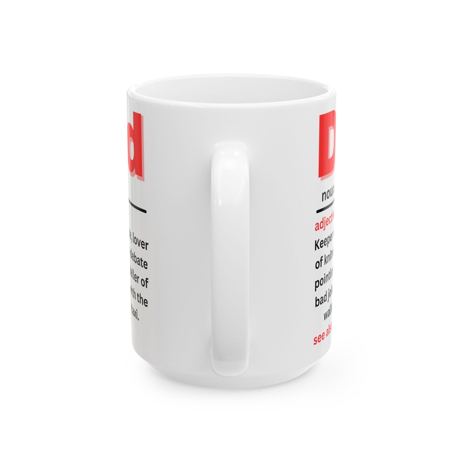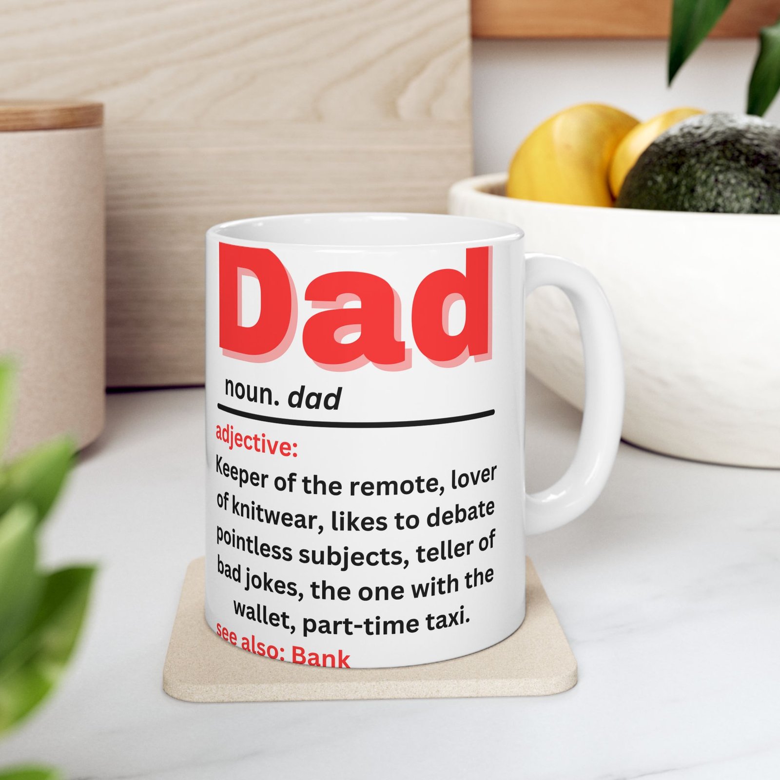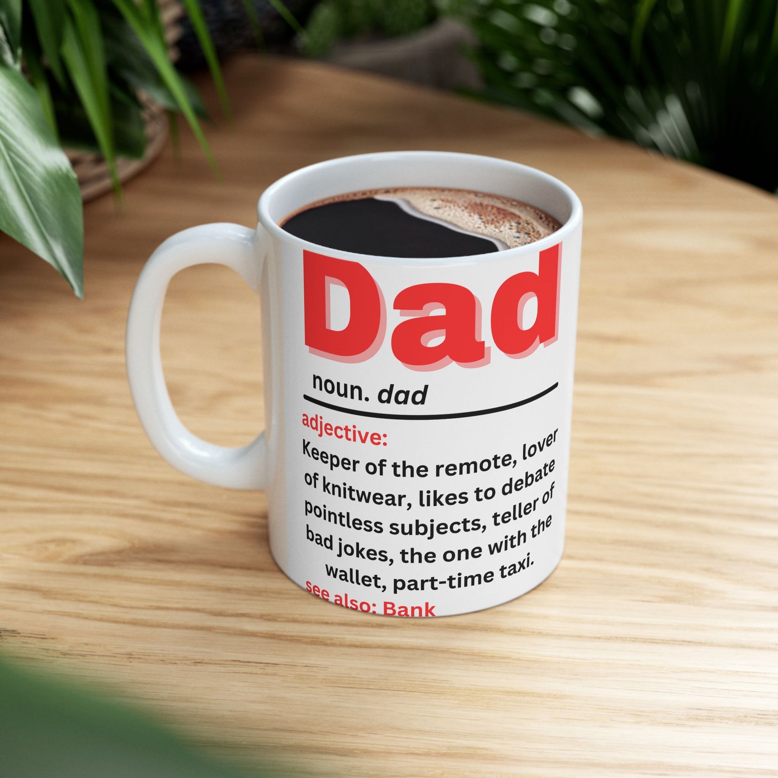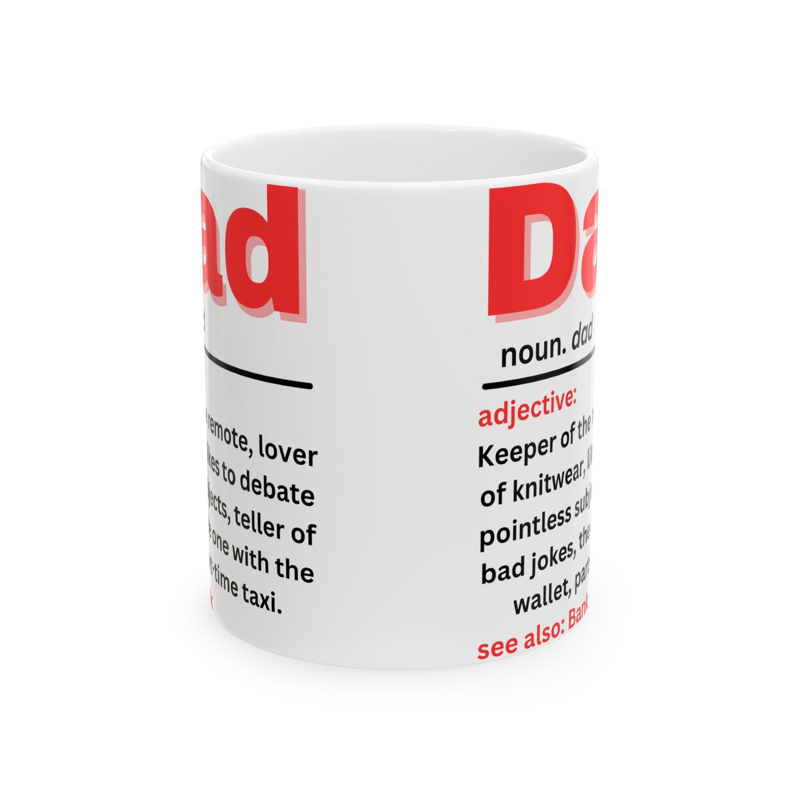 Celebrate the quirks and charm of fatherhood with this Funny Dad Definition Mug. Featuring the humorous definition of “Dad” in bold red lettering: “Keeper of the remote, lover of knitwear, teller of bad jokes, part-time taxi,” this mug captures the essence of every dad. Whether he’s the king of bad jokes or the one with the wallet, this mug is a lighthearted reminder of all the ways dads make life fun (and funny!). Made from durable ceramic, it’s available in both 11oz and 15oz sizes, and is the gift for Father’s Day, birthdays, or just because. Also see: Bank—because we all know Dad is always there when we need him!