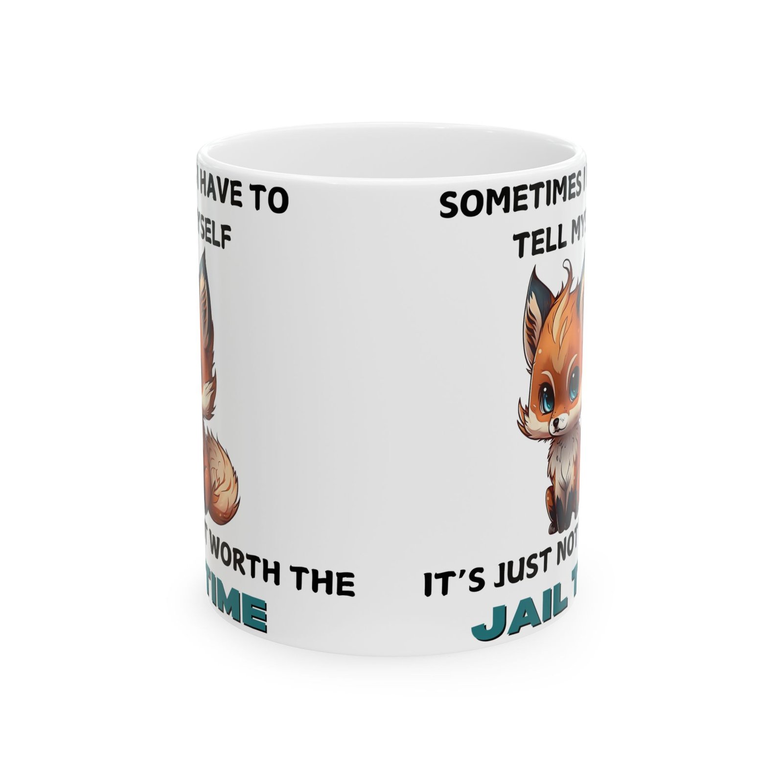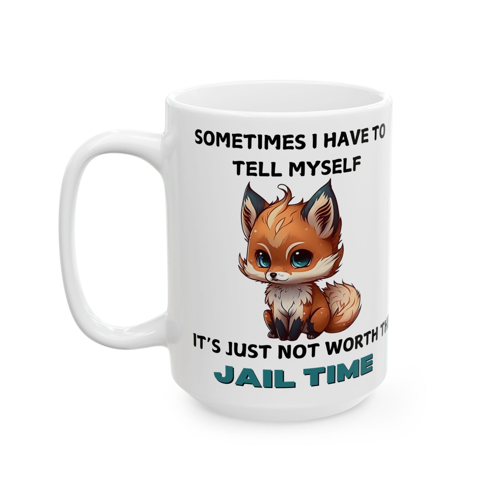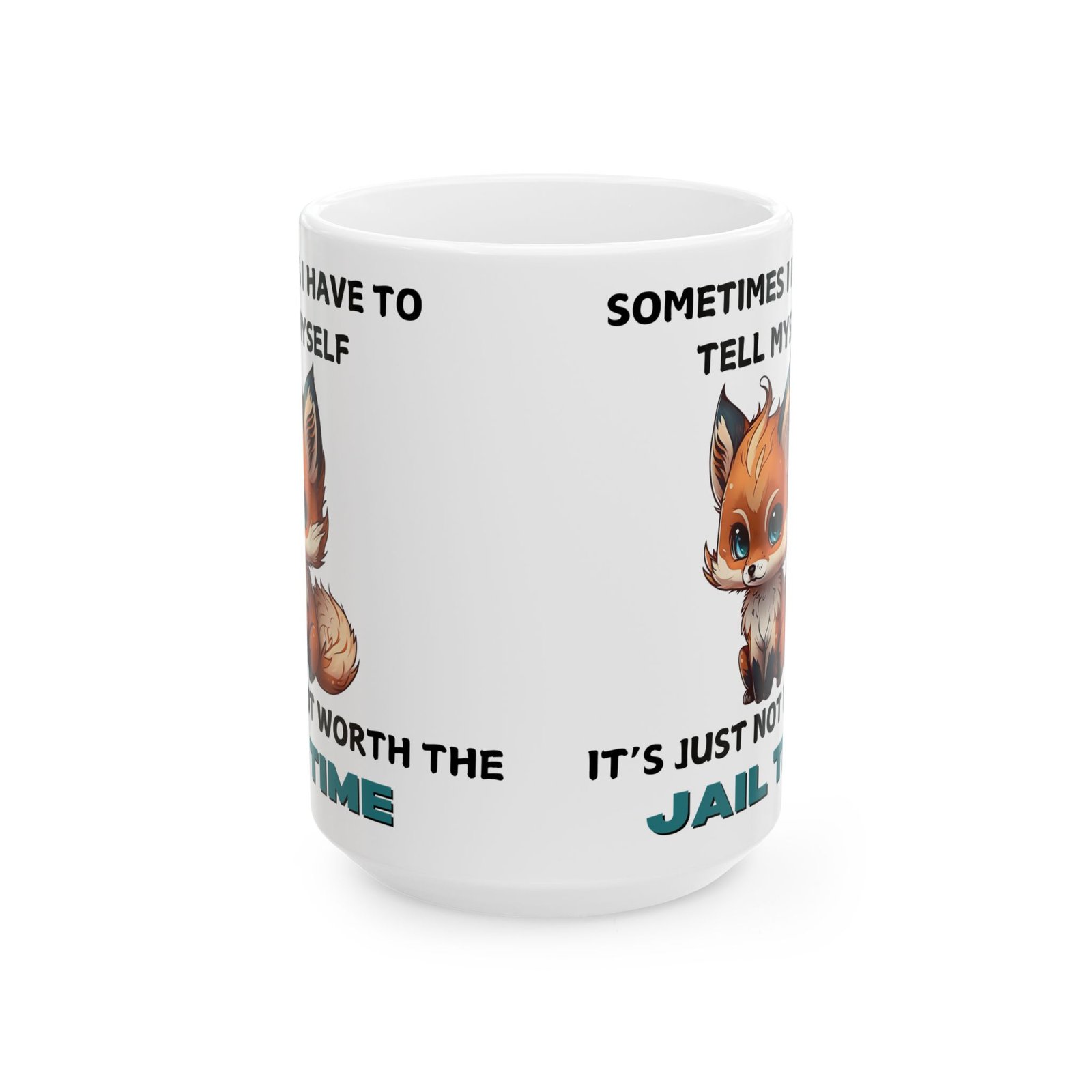 Brighten up your day with a touch of humor and relatable wisdom with our “Sometimes I Have to Tell Myself, It’s Just Not Worth the Jail Time” mug. Featuring a charming, cartoon-style fox with an adorably frustrated expression, this mug is for those moments when patience runs thin and sass takes over. Made from ceramic and available in 11oz and 15oz sizes, it’s great for your morning coffee, afternoon tea, or any beverage that needs a splash of personality.