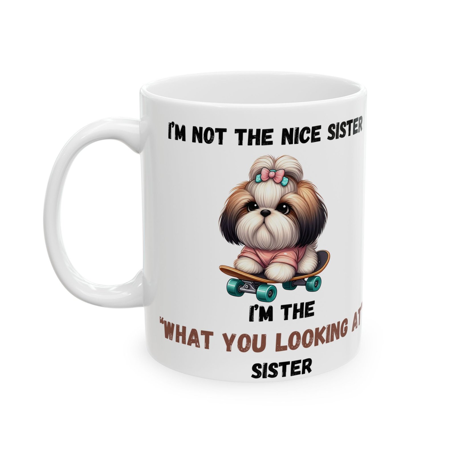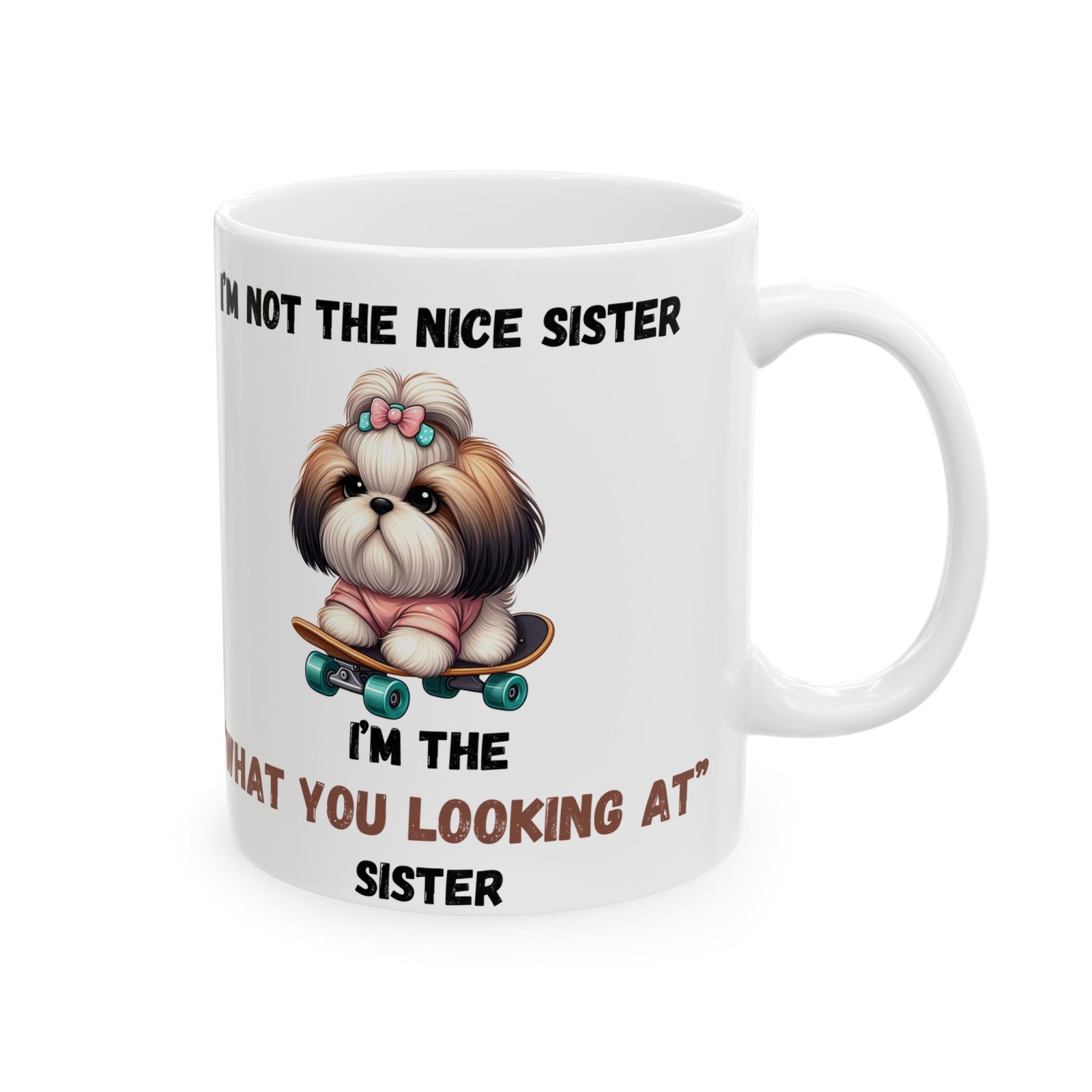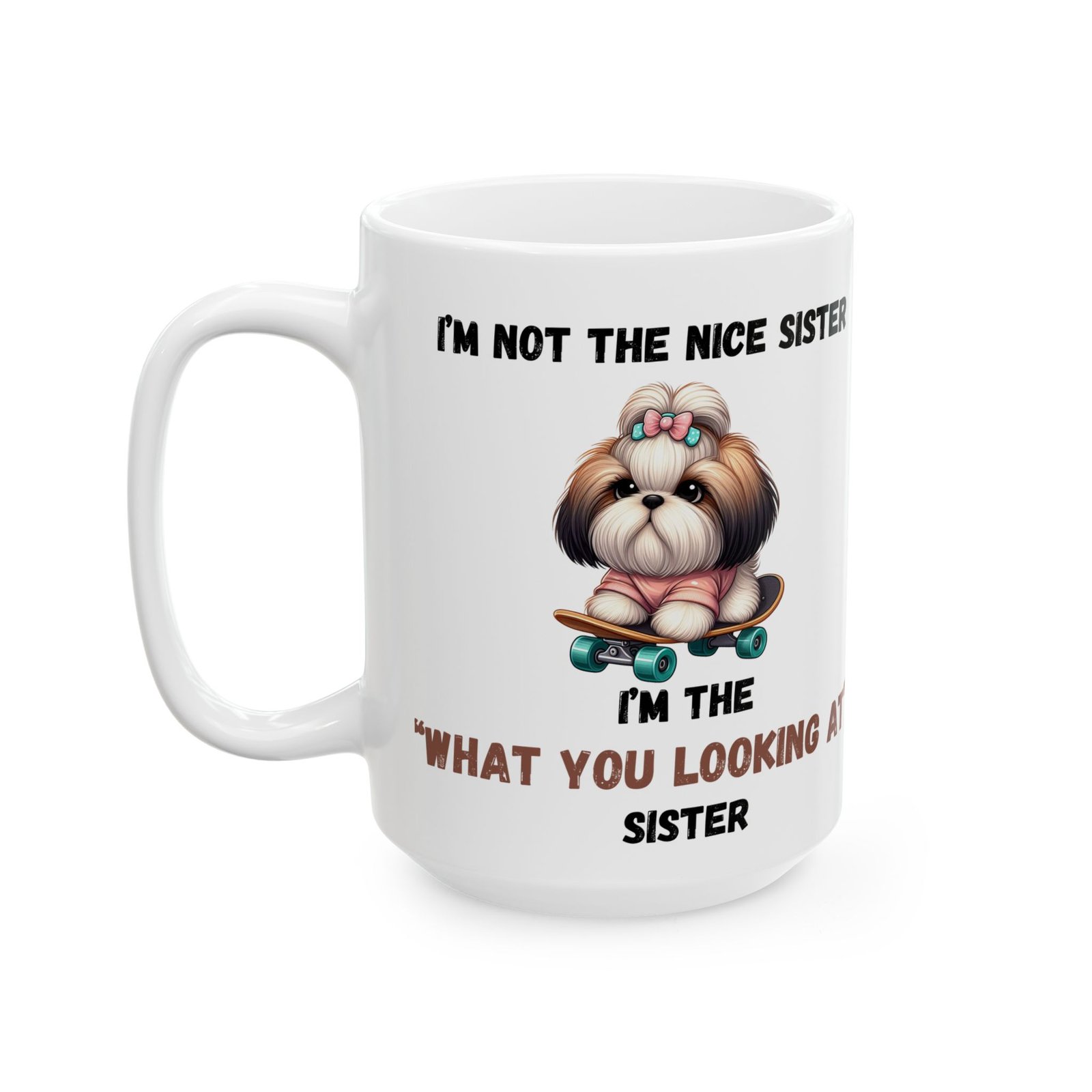 Show off your bold, sassy side with the “I’m Not the Nice Sister, I’m the ‘What You Looking At’ Sister” mug. for the sister with attitude, this mug features an adorable dog with a stern expression, riding a skateboard for an extra touch of cool. Whether it’s for your morning brew or your afternoon tea, this mug is a fun way to express your unique personality. Available in both 11oz and 15oz sizes, it’s made from ceramic and is both microwave and dishwasher safe for easy use.