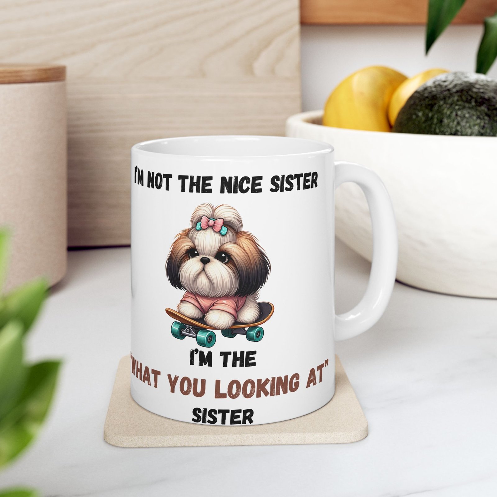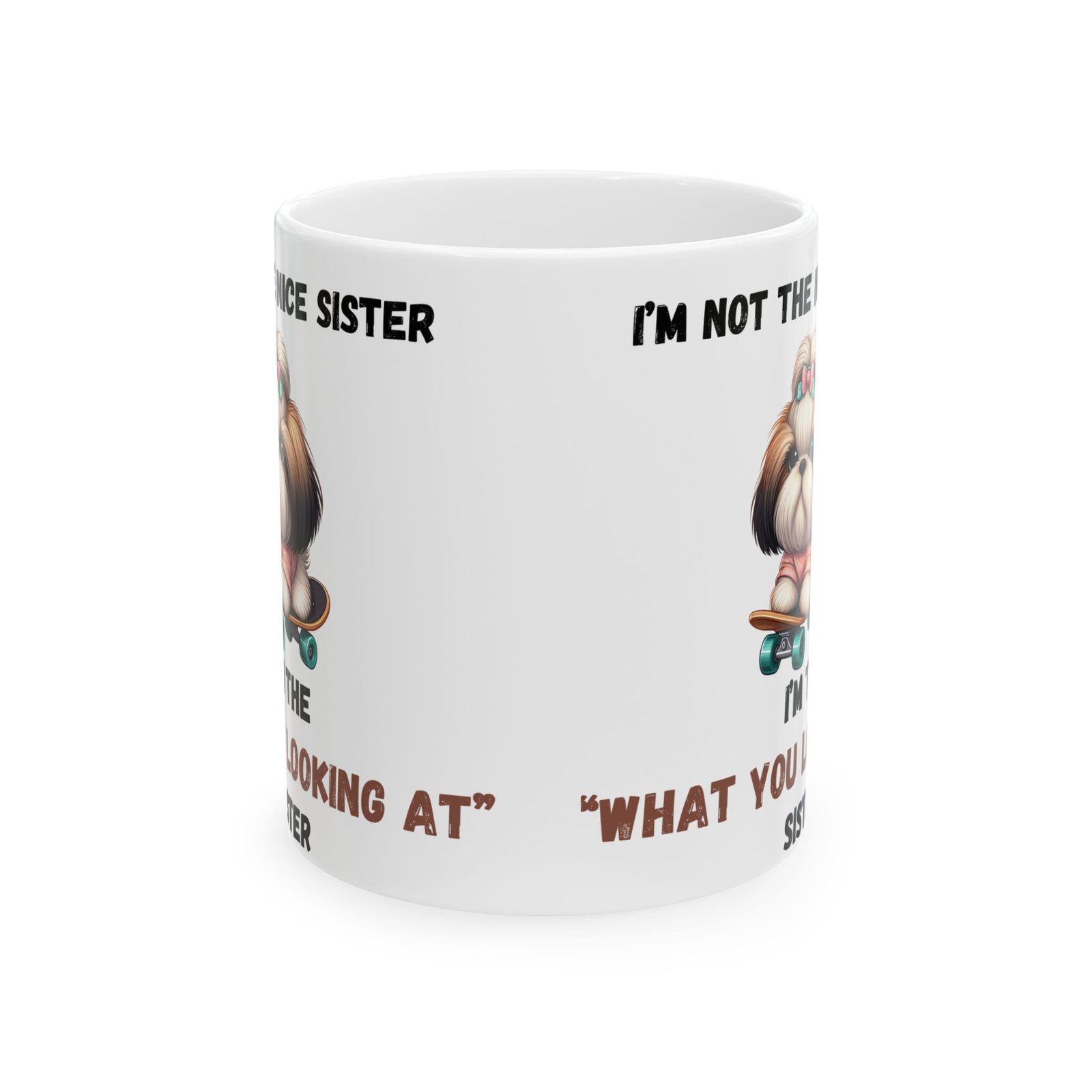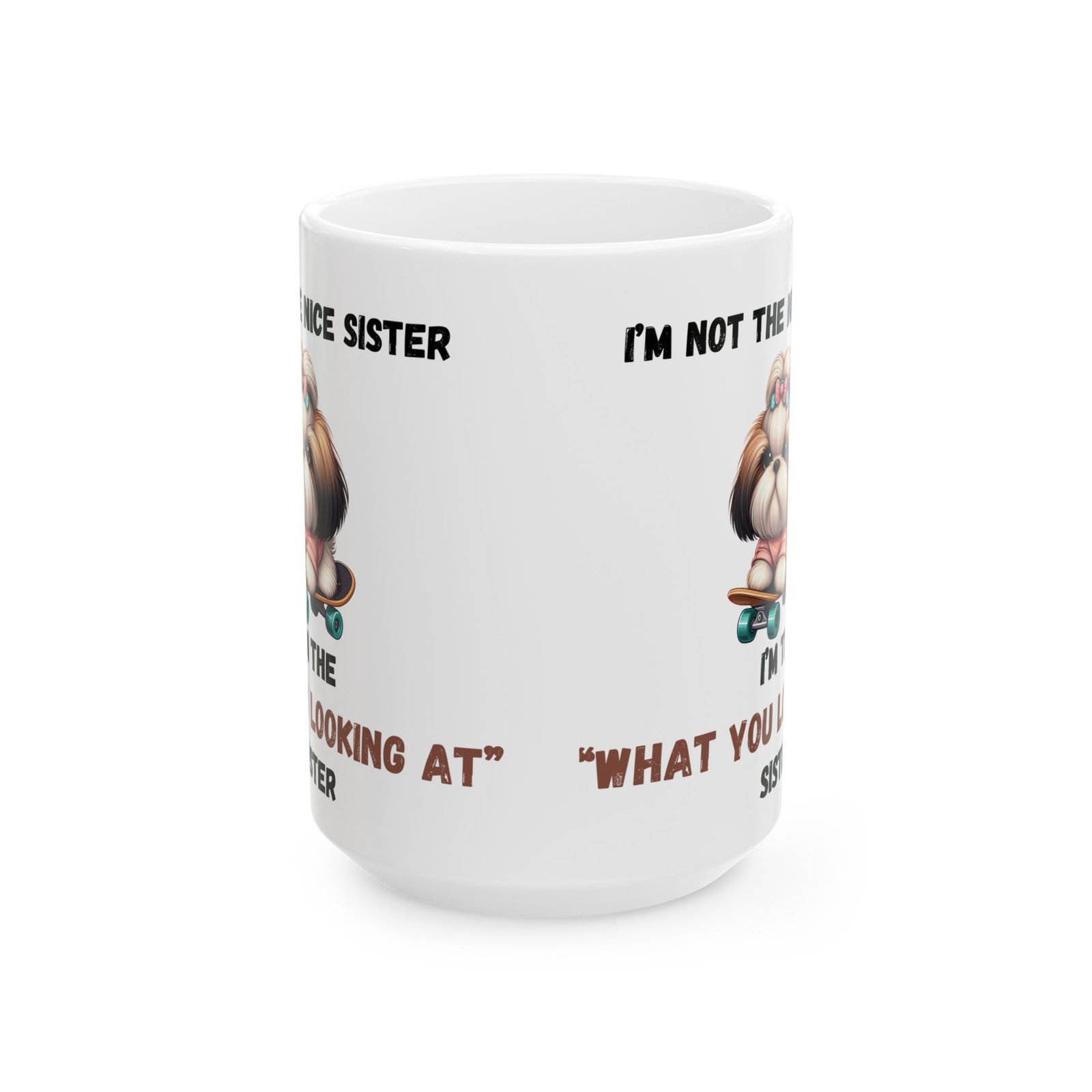 Show off your bold, sassy side with the “I’m Not the Nice Sister, I’m the ‘What You Looking At’ Sister” mug. for the sister with attitude, this mug features an adorable dog with a stern expression, riding a skateboard for an extra touch of cool. Whether it’s for your morning brew or your afternoon tea, this mug is a fun way to express your unique personality. Available in both 11oz and 15oz sizes, it’s made from ceramic and is both microwave and dishwasher safe for easy use.