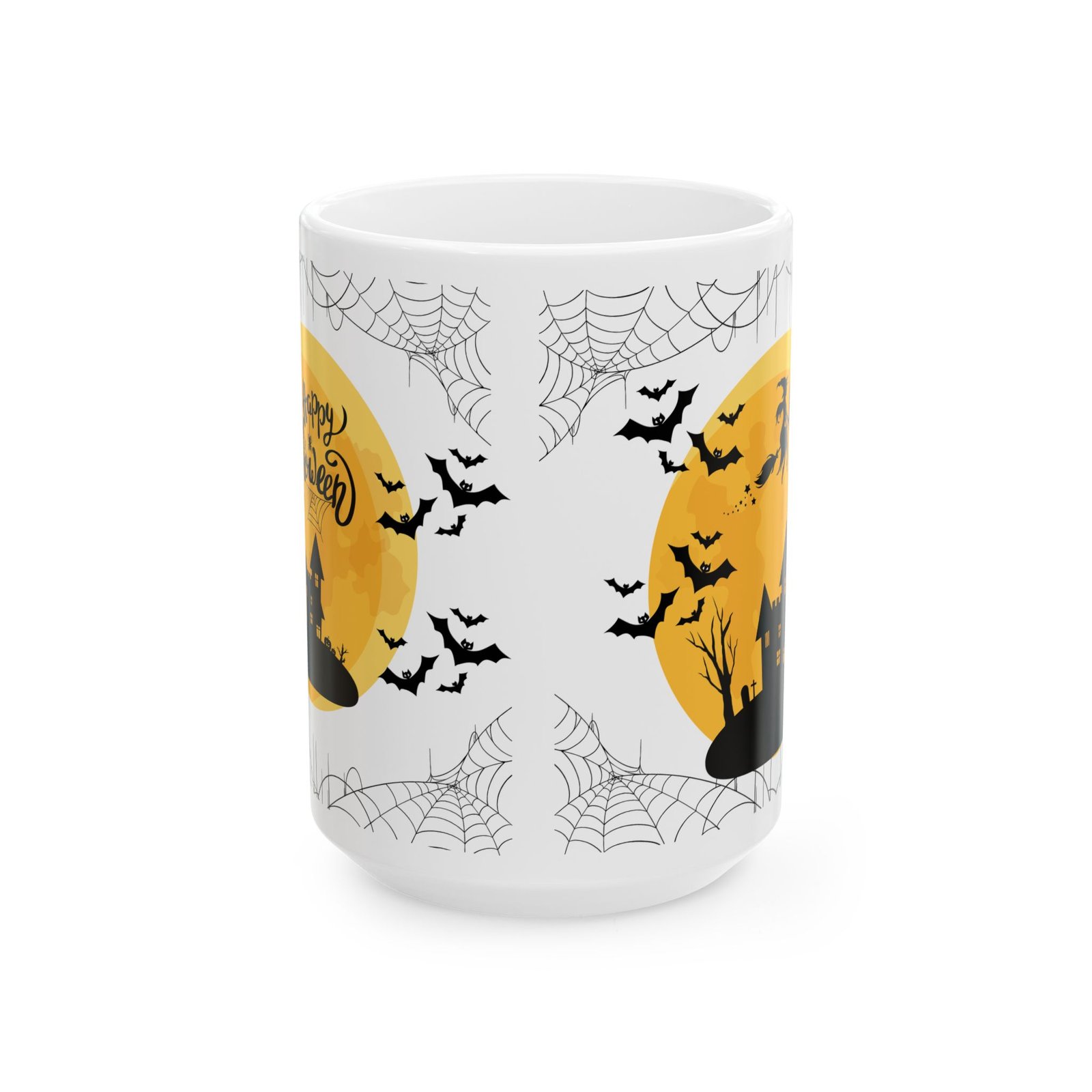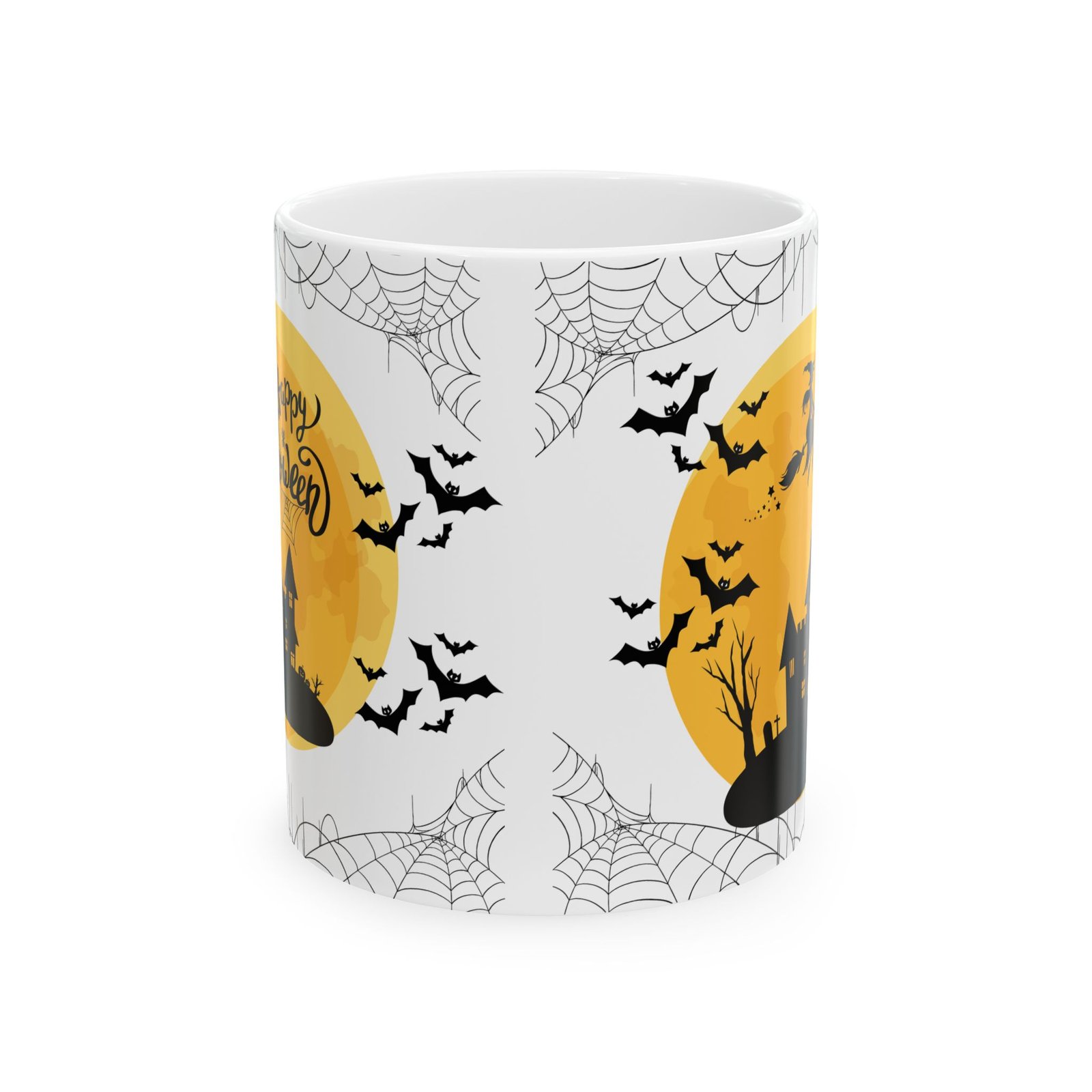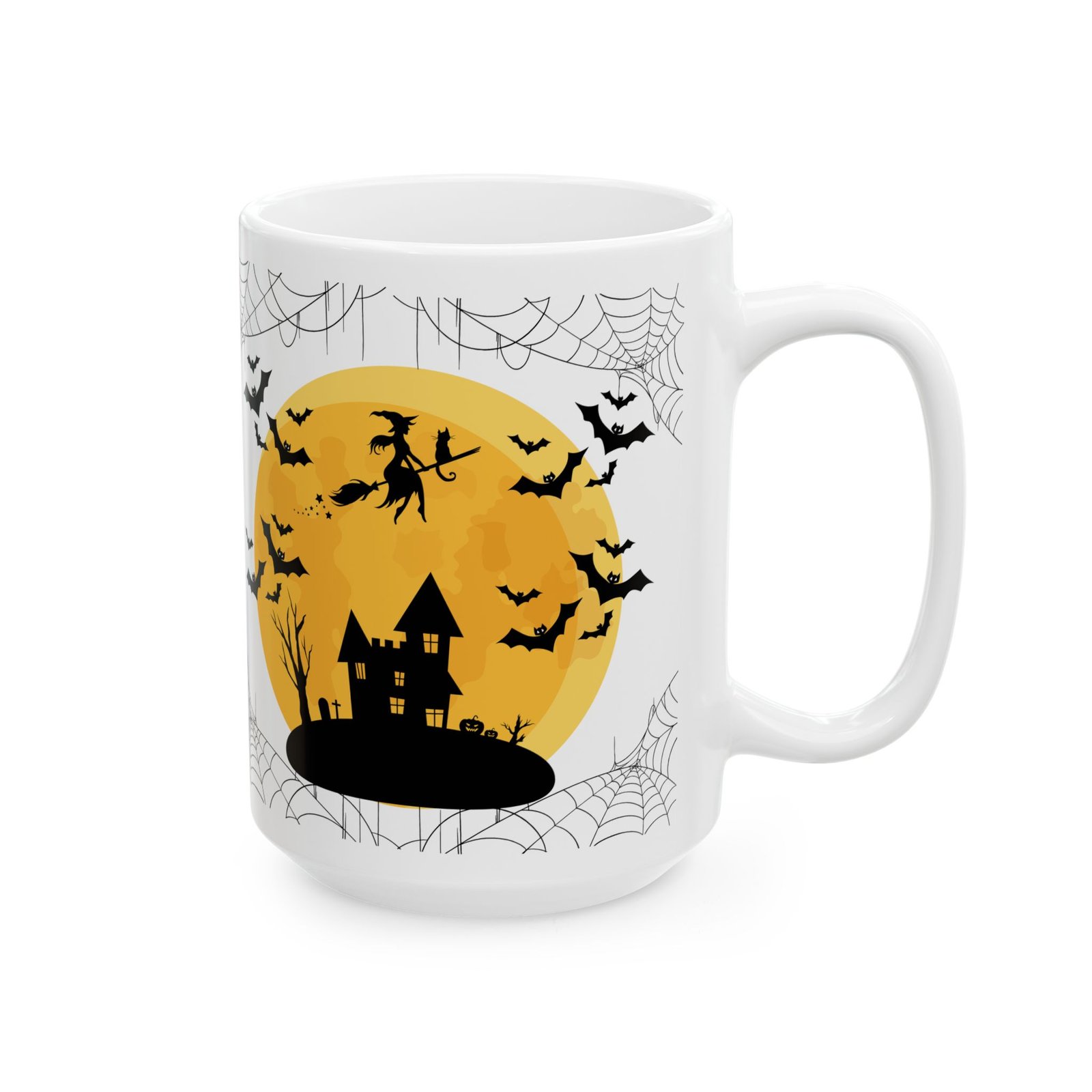 Get into the Halloween spirit with this “Happy Halloween” Mug, featuring a spooky design complete with bats, a haunted house, a witch on her broom, and a creepy spider’s web! Perfect for sipping your favorite brew on chilly autumn mornings or during a Halloween movie marathon, this 11oz white ceramic mug adds a touch of eerie fun to your kitchen or office.