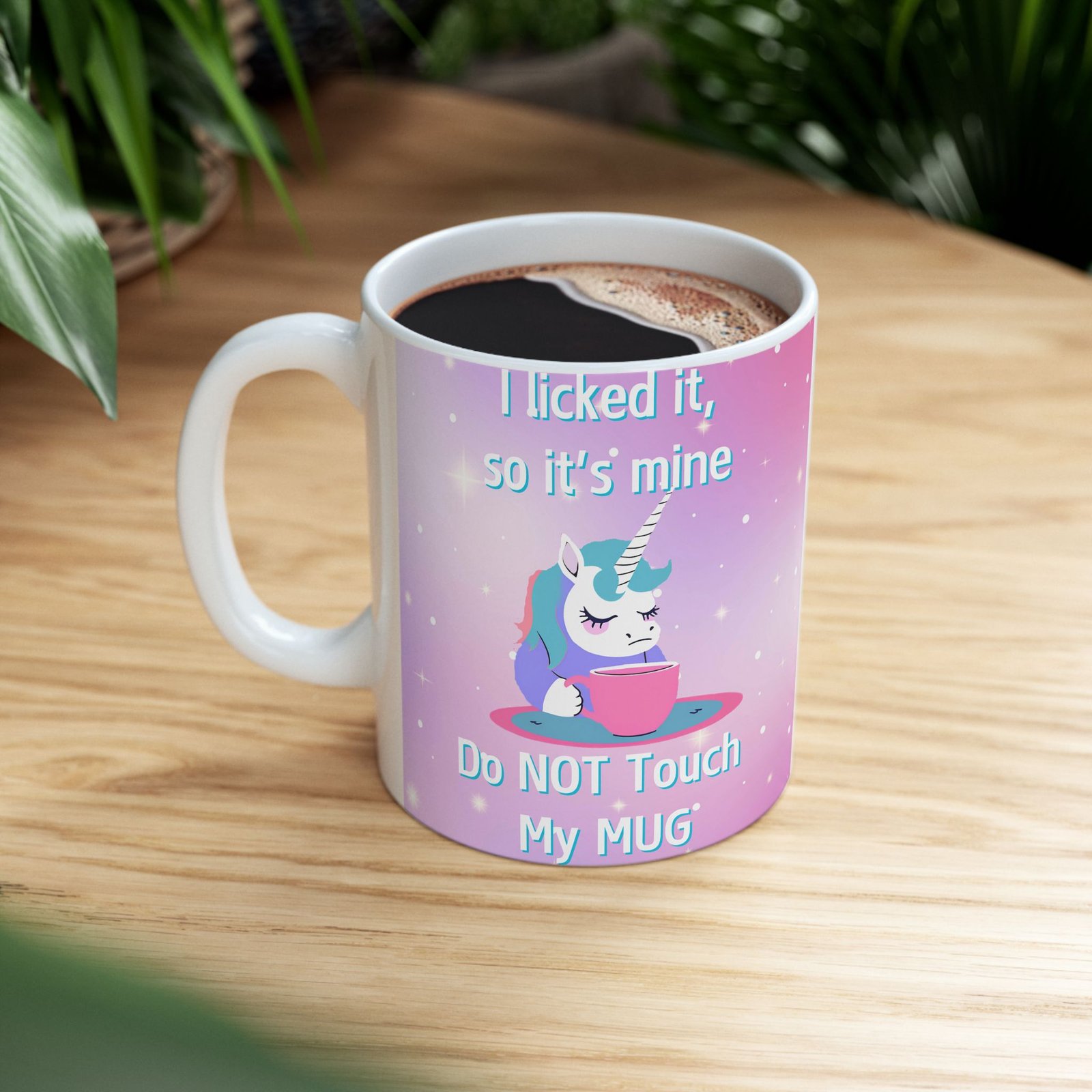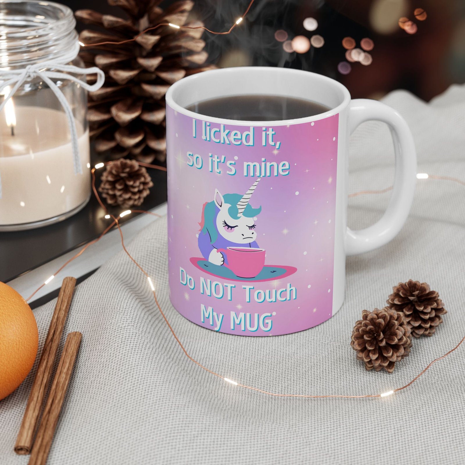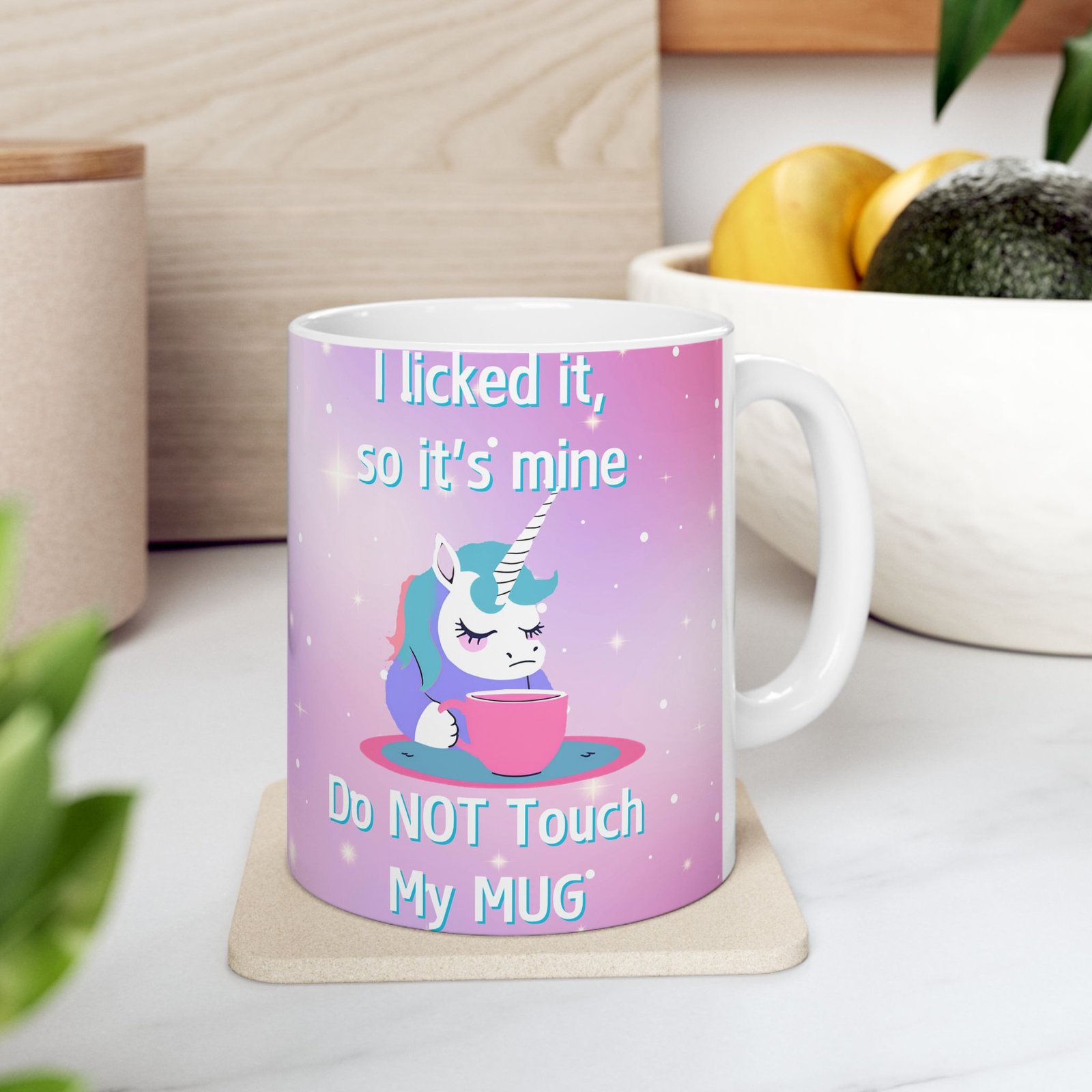 Add some sass to your coffee breaks with the “I Licked It So It’s Mine” mug! Featuring a delightful unicorn sipping from a mug, surrounded by pastel colors, this mug is the perfect blend of pretty and assertive. Ideal for anyone who loves a bit of humor with their daily dose of caffeine, it’s a fun way to let everyone know to keep their hands off your mug. Made from durable ceramic, this whimsical yet practical mug is microwave and dishwasher safe, making it as easy to care for as it is fun to use.