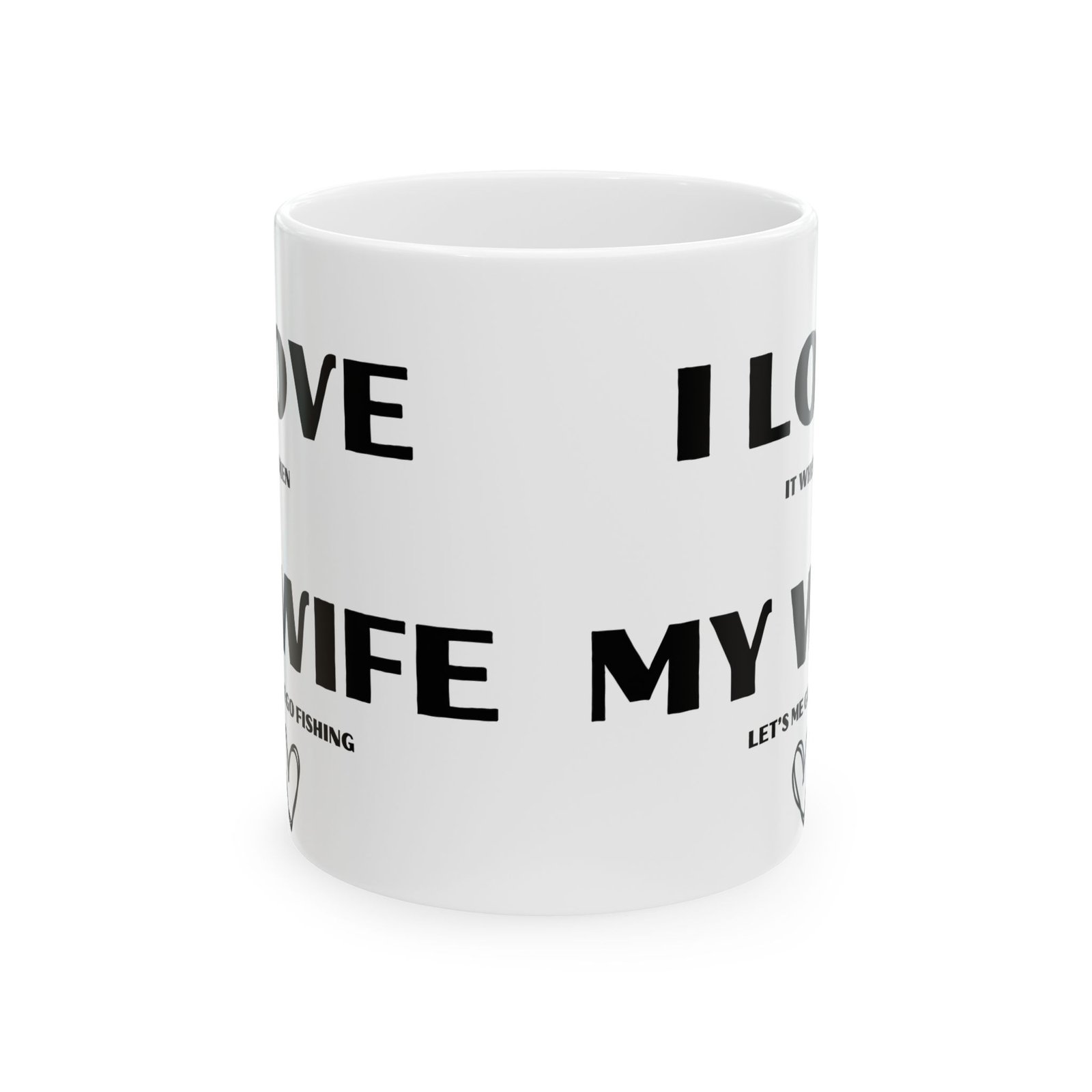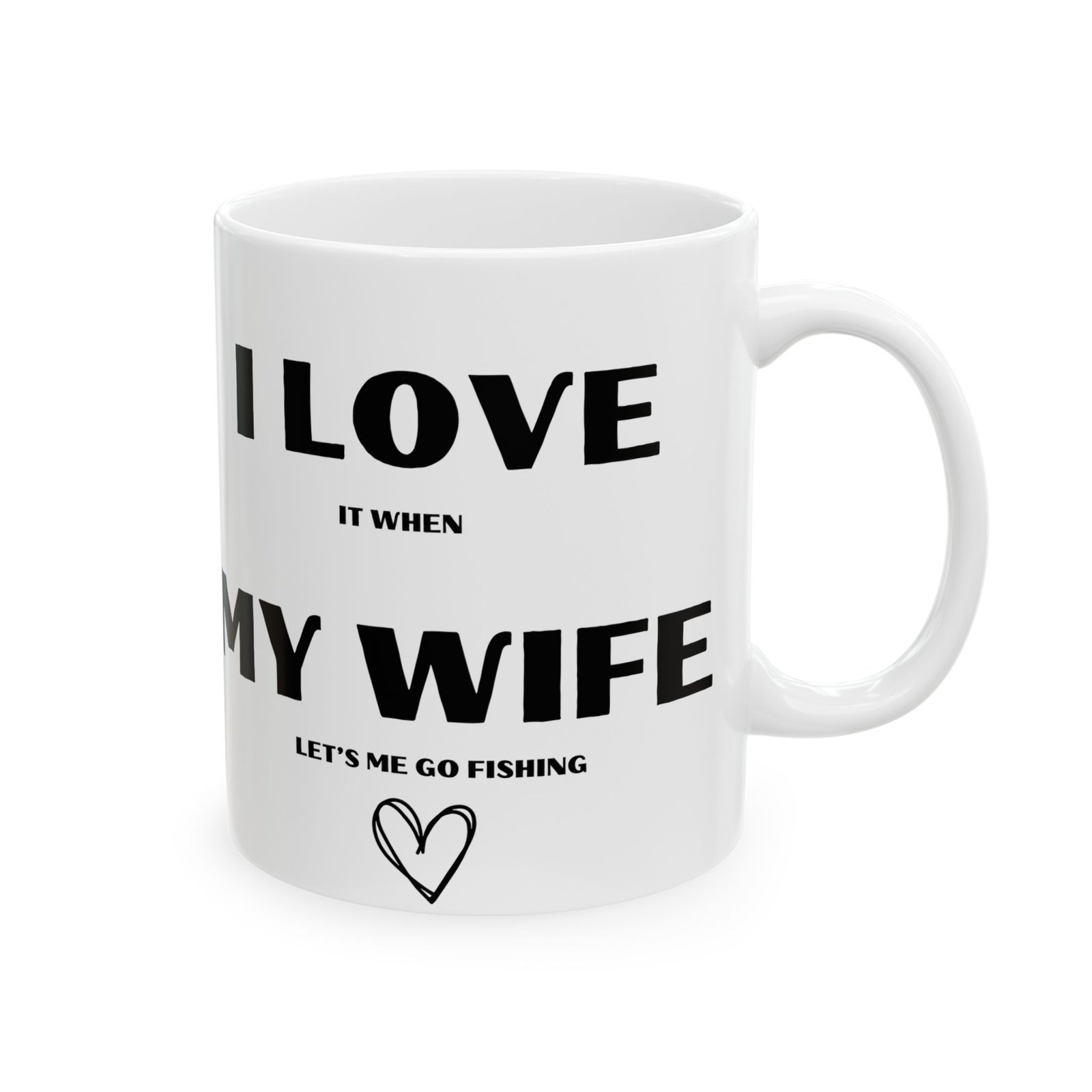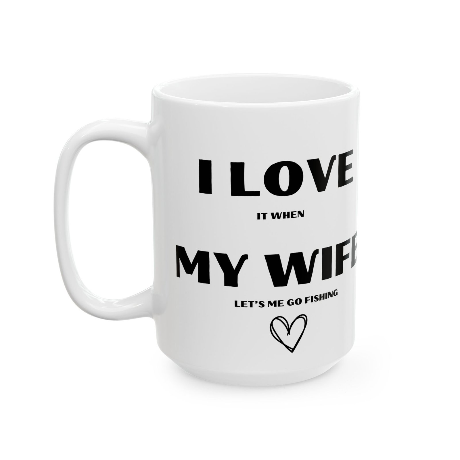 Fishing fans will love this funny and quirky mug that says, “I love it when my wife lets me go fishing.”