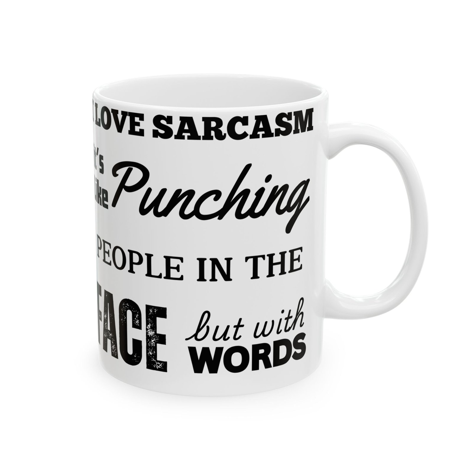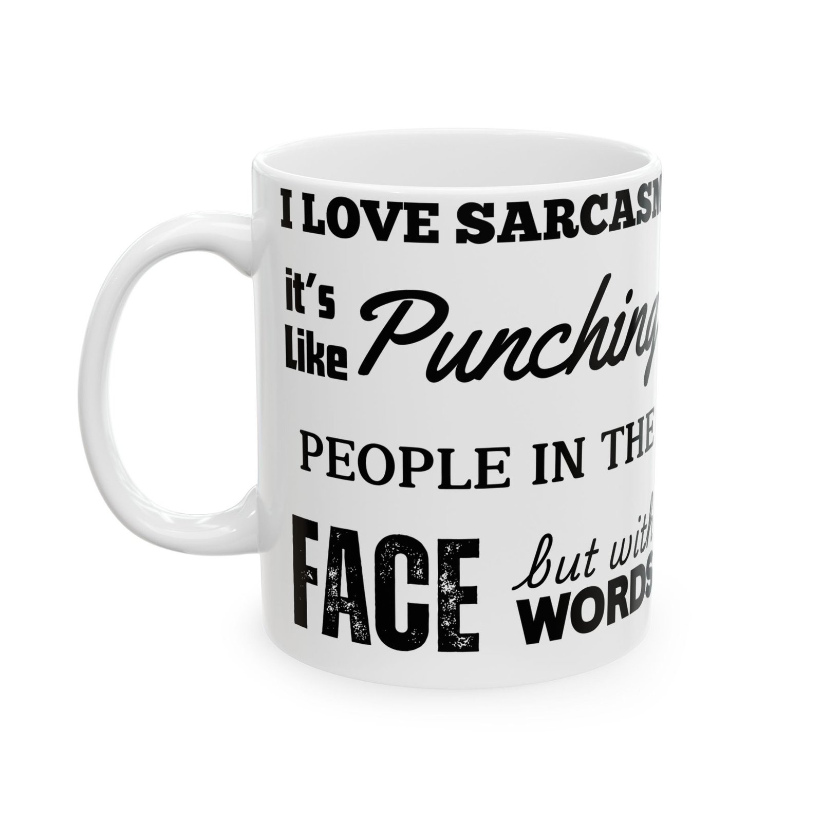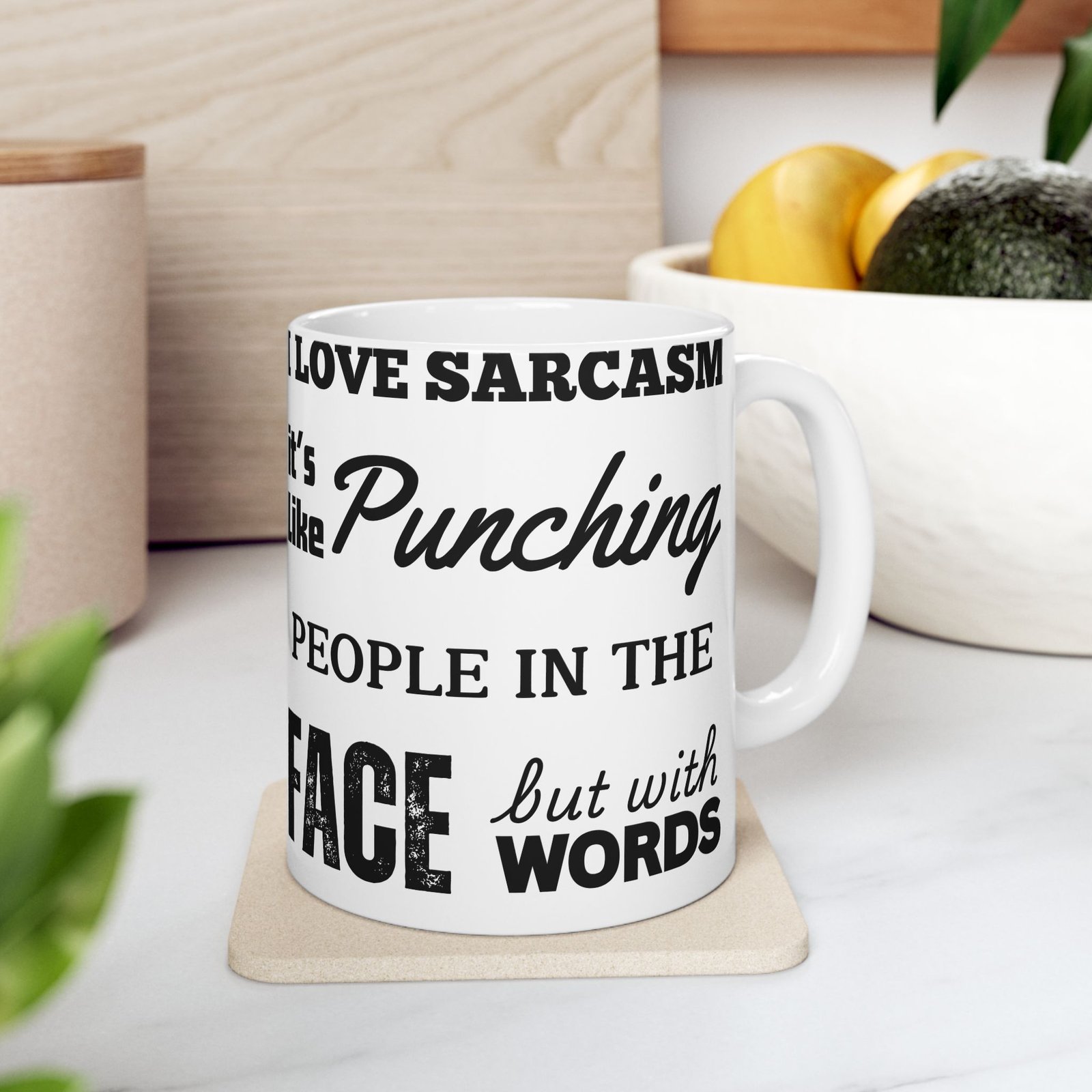 If sarcasm is your second language, this “I Love Sarcasm” mug is for you! Featuring the hilarious quote “It’s Like Punching People in the Face but with Words,” this mug is the perfect way to start your day with a laugh. Whether it’s for your daily cup of coffee or tea, or as a funny gift for someone who loves sarcasm, this high-quality ceramic mug is sure to make an impression. Microwave and dishwasher safe, it’s as practical as it is entertaining.
