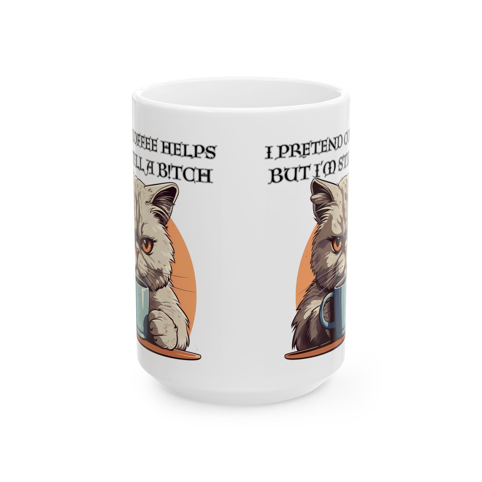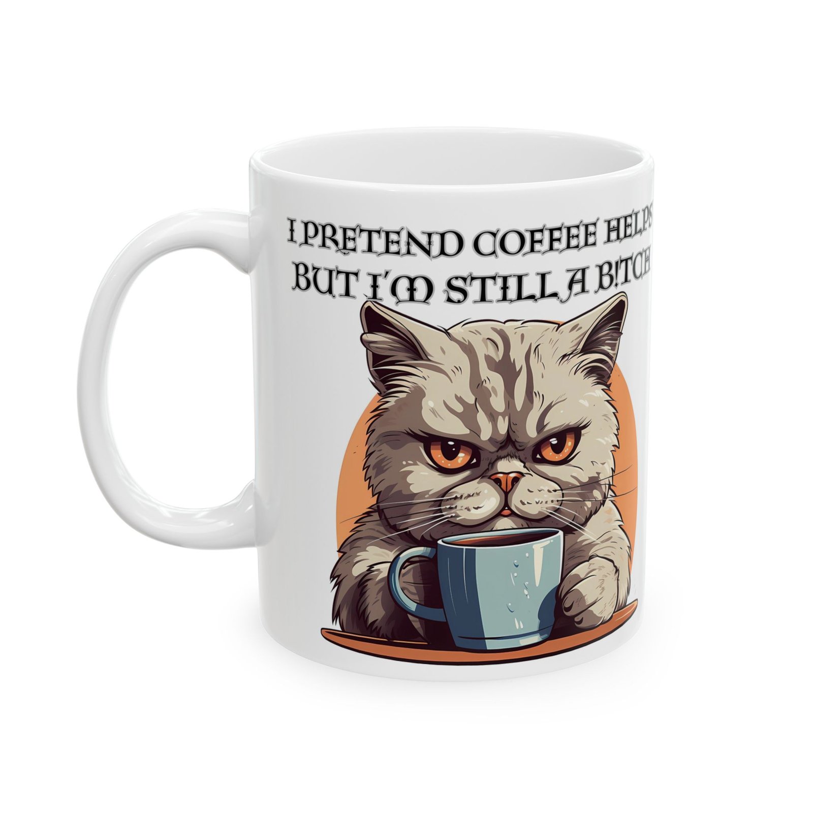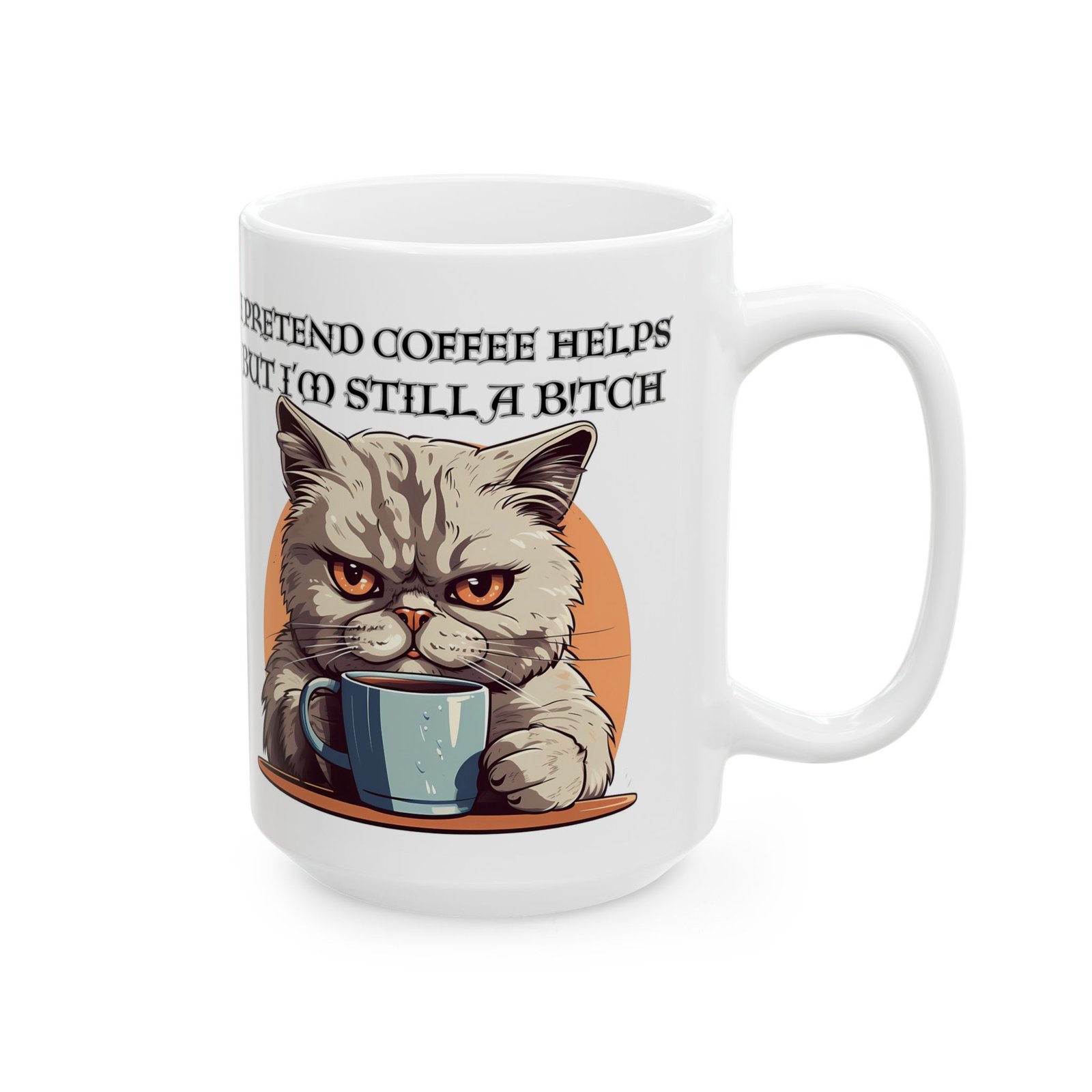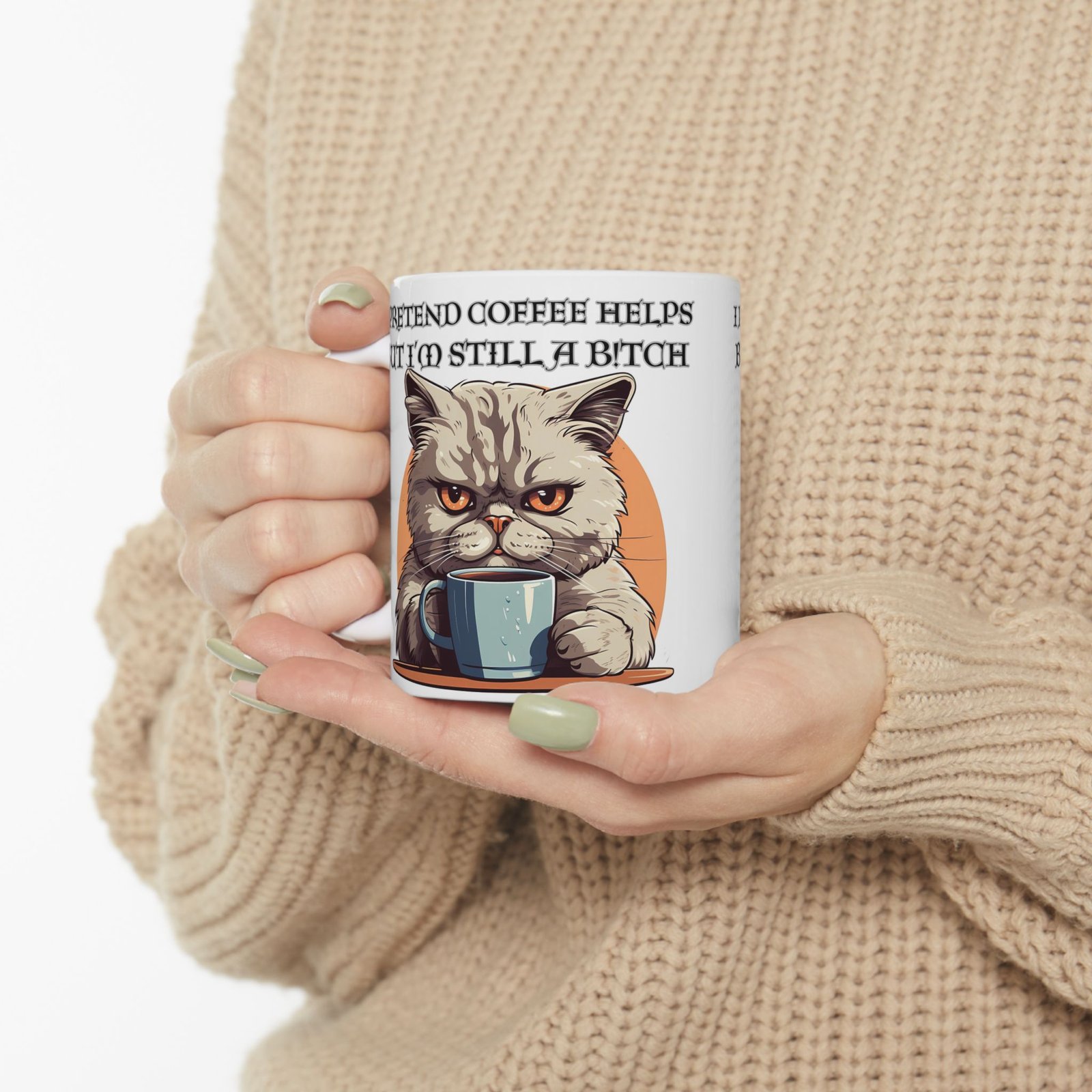 Express your unapologetic, sassy side with this hilarious “I Pretend Coffee Helps But I’m Still a B!TCH” mug featuring a grumpy cat illustration. Whether you’re using it at work or at home, this mug is sure to get laughs and nods of agreement from those who know you best. Made from durable ceramic with a smooth, glossy finish, it’s for daily use and safe for the microwave and dishwasher. Treat yourself or gift it to someone who shares your humorous take on life and mornings this mug is guaranteed to make any coffee break more entertaining.