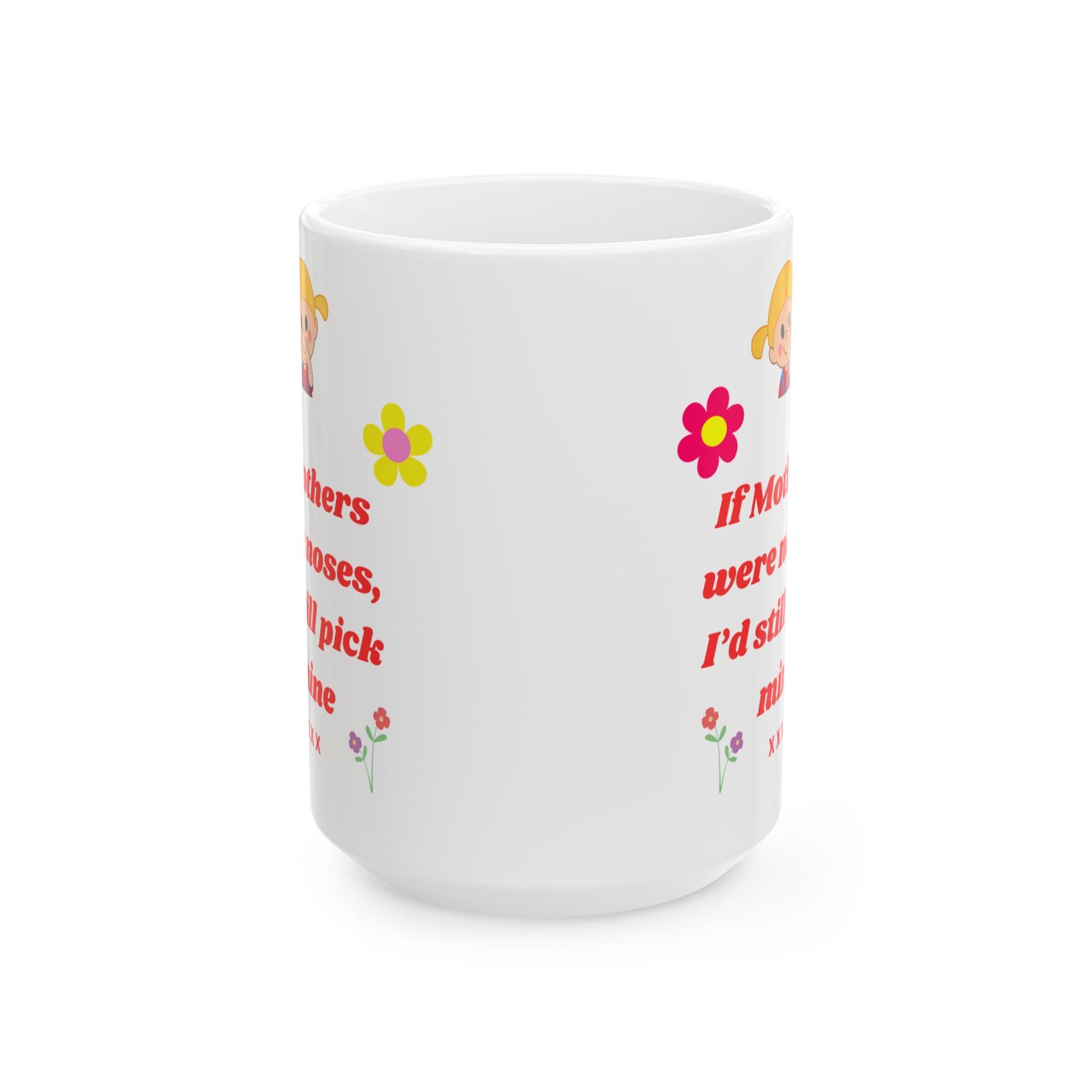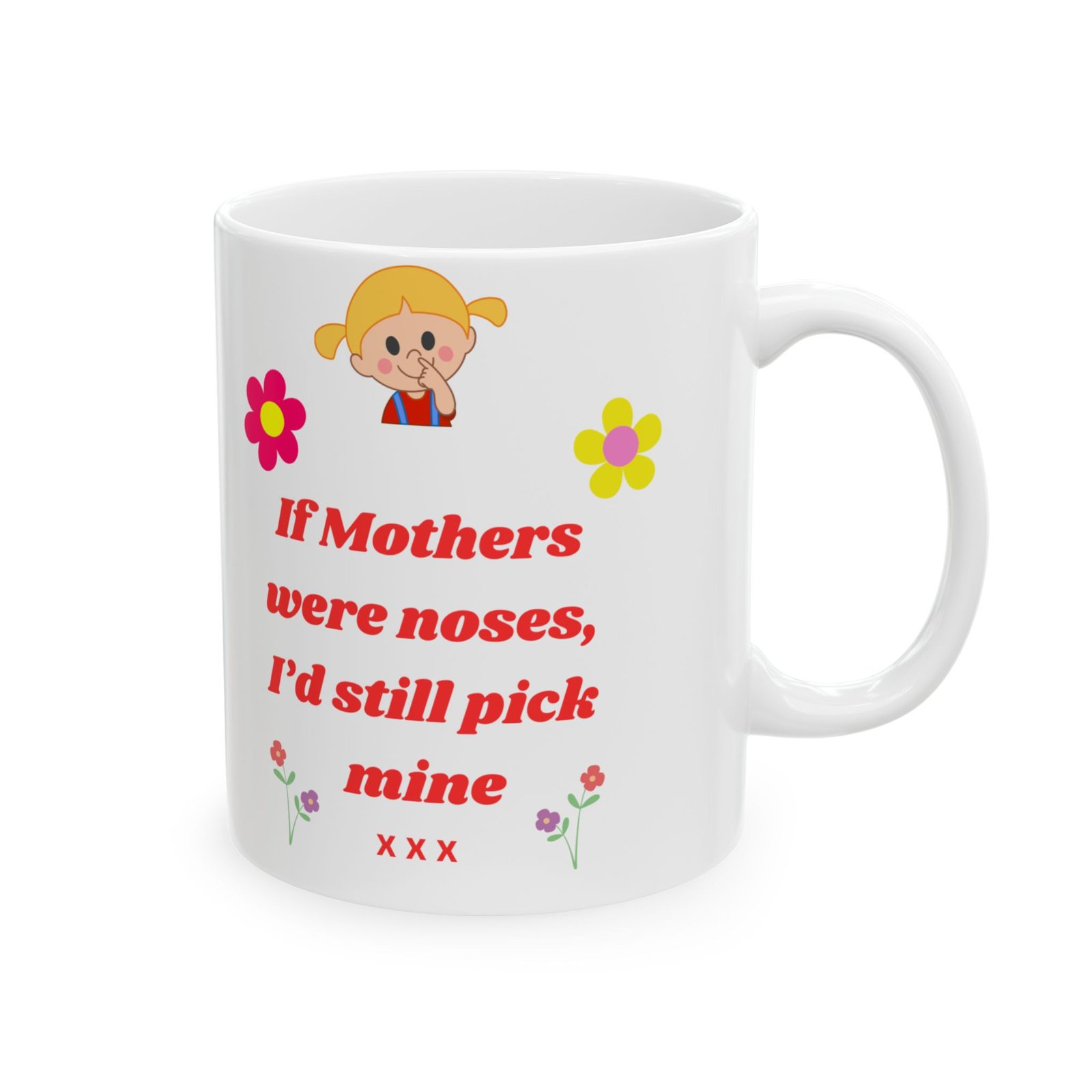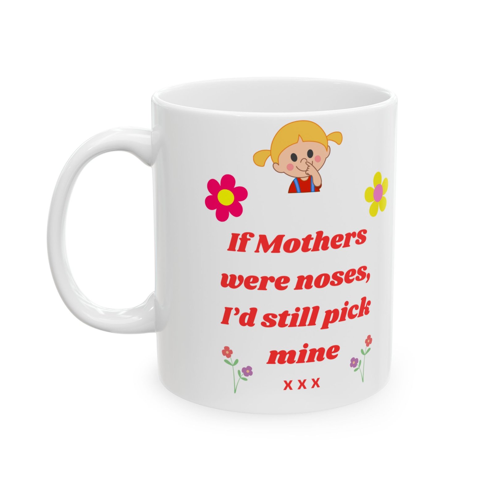 Featuring the playful message, “If Mothers Were Noses, I’d Still Pick Mine,” along with a gorgeous floral design, this mug is both fun and heartfelt.