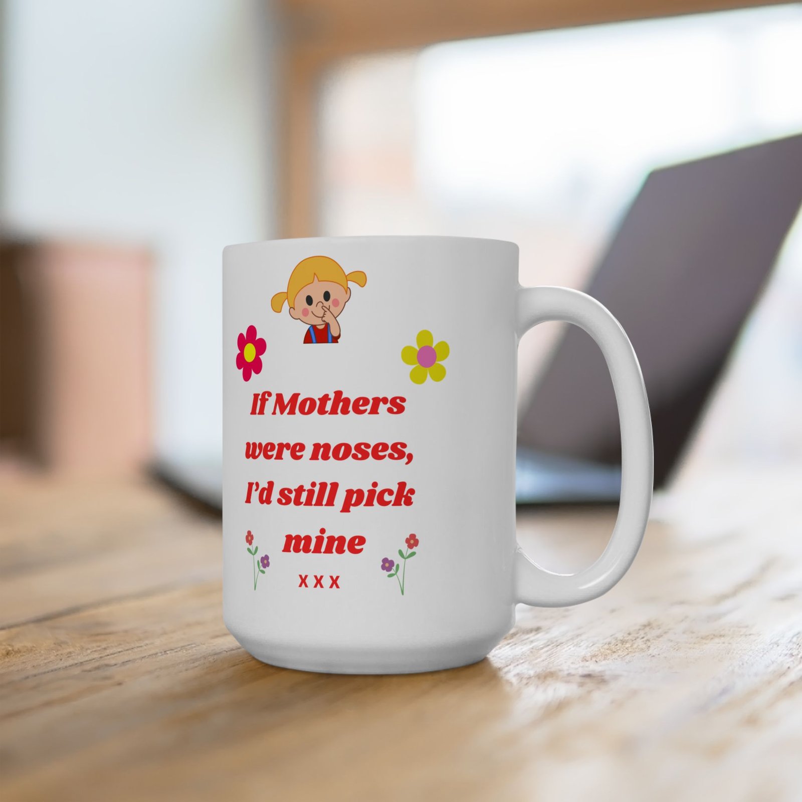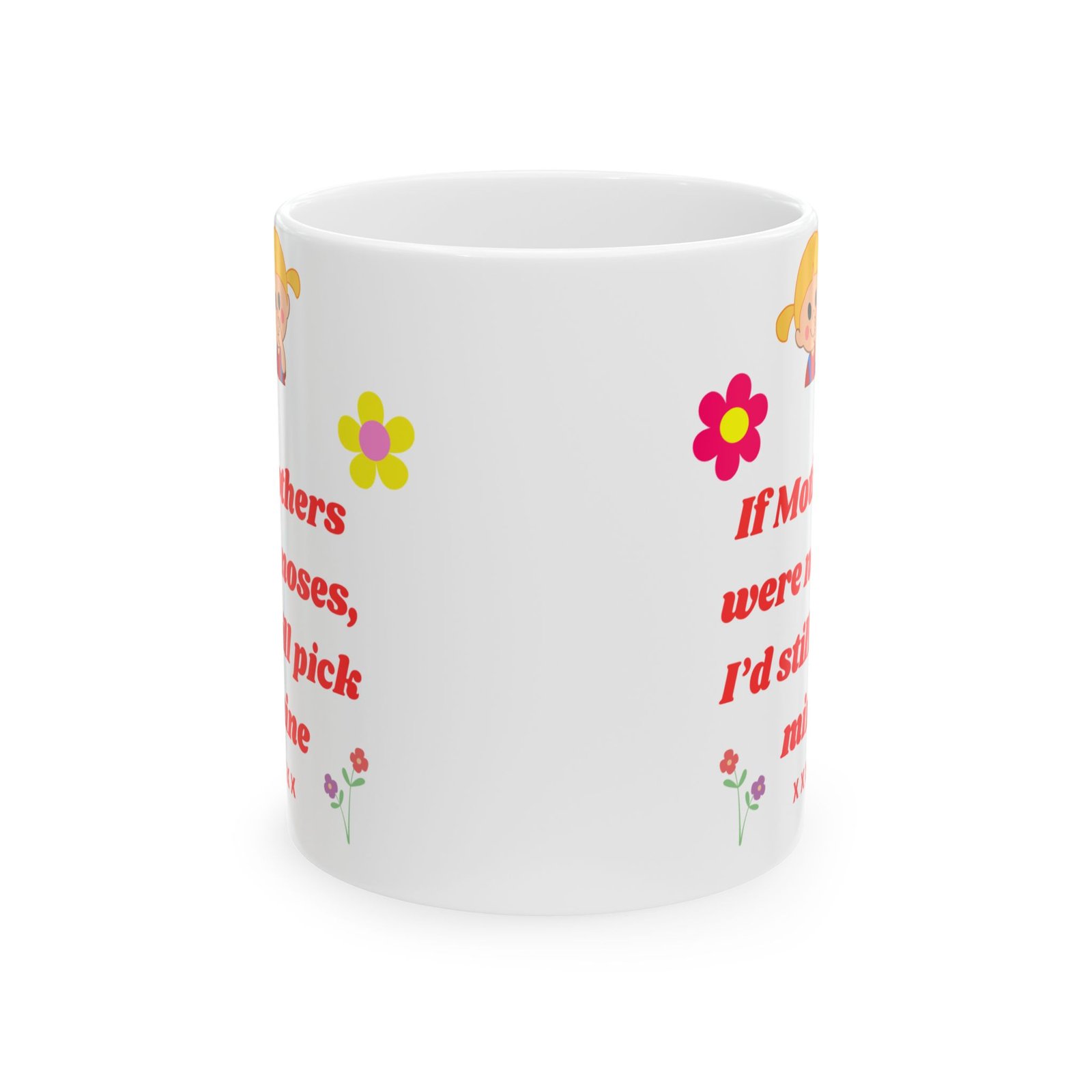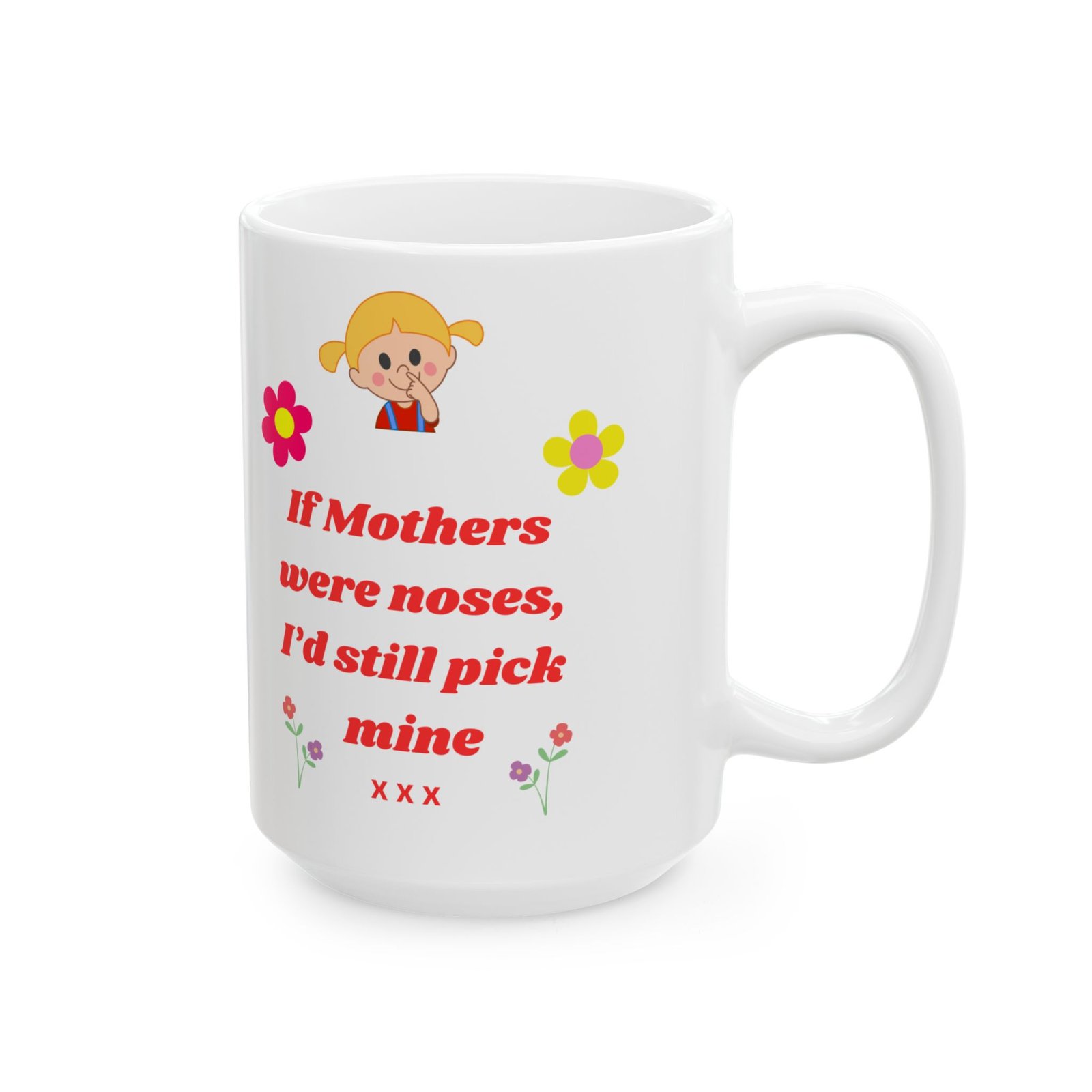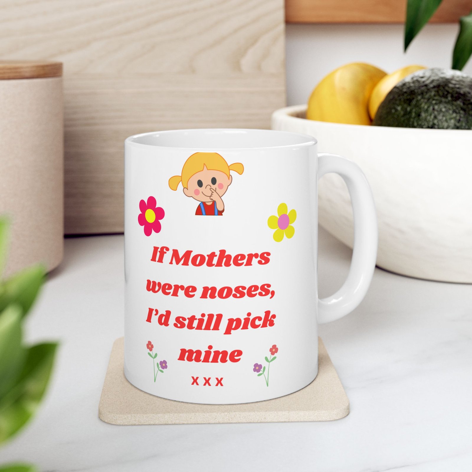 Featuring the playful message, “If Mothers Were Noses, I’d Still Pick Mine,” along with a gorgeous floral design, this mug is both fun and heartfelt.
