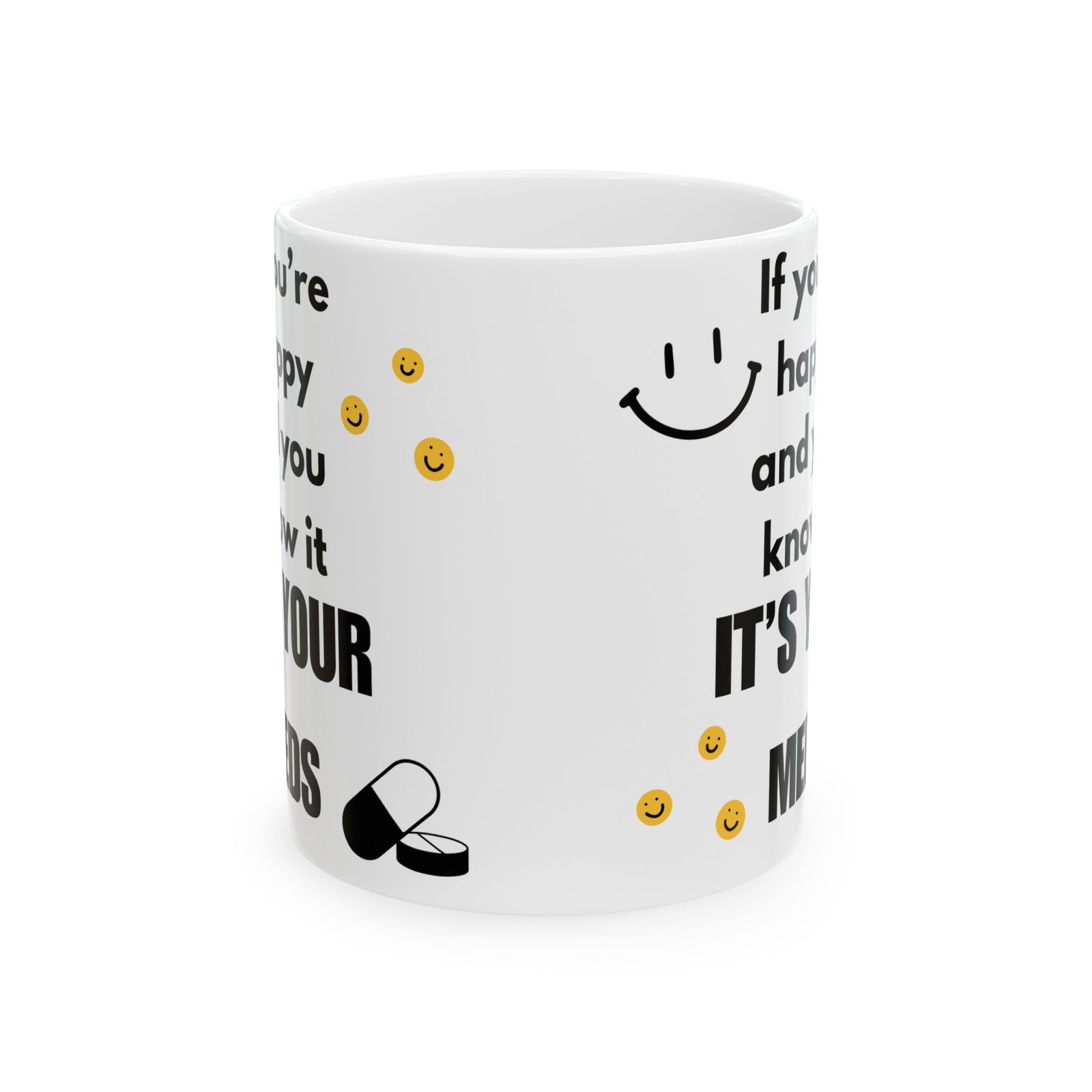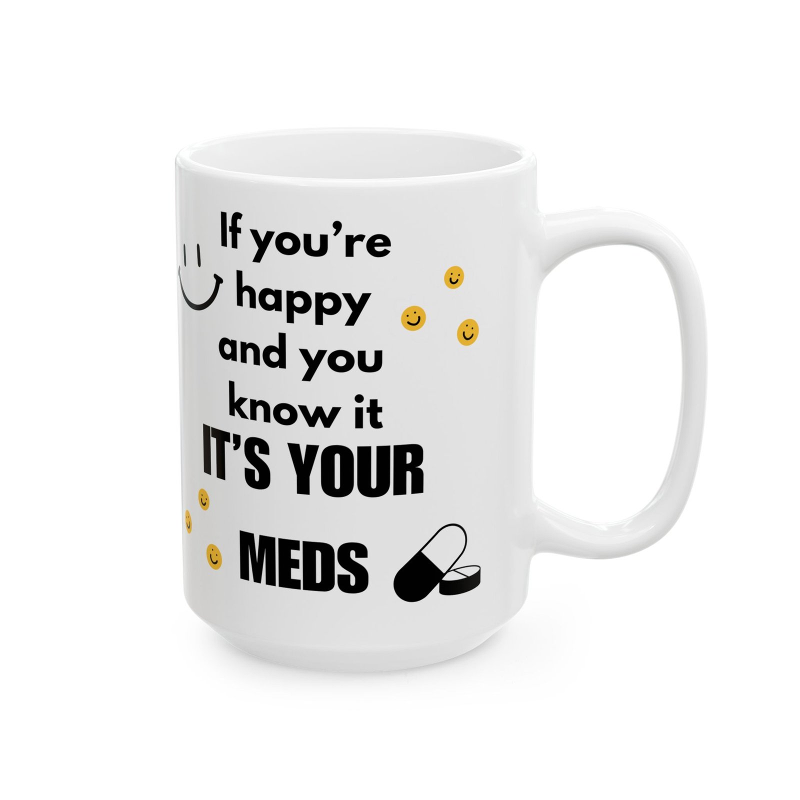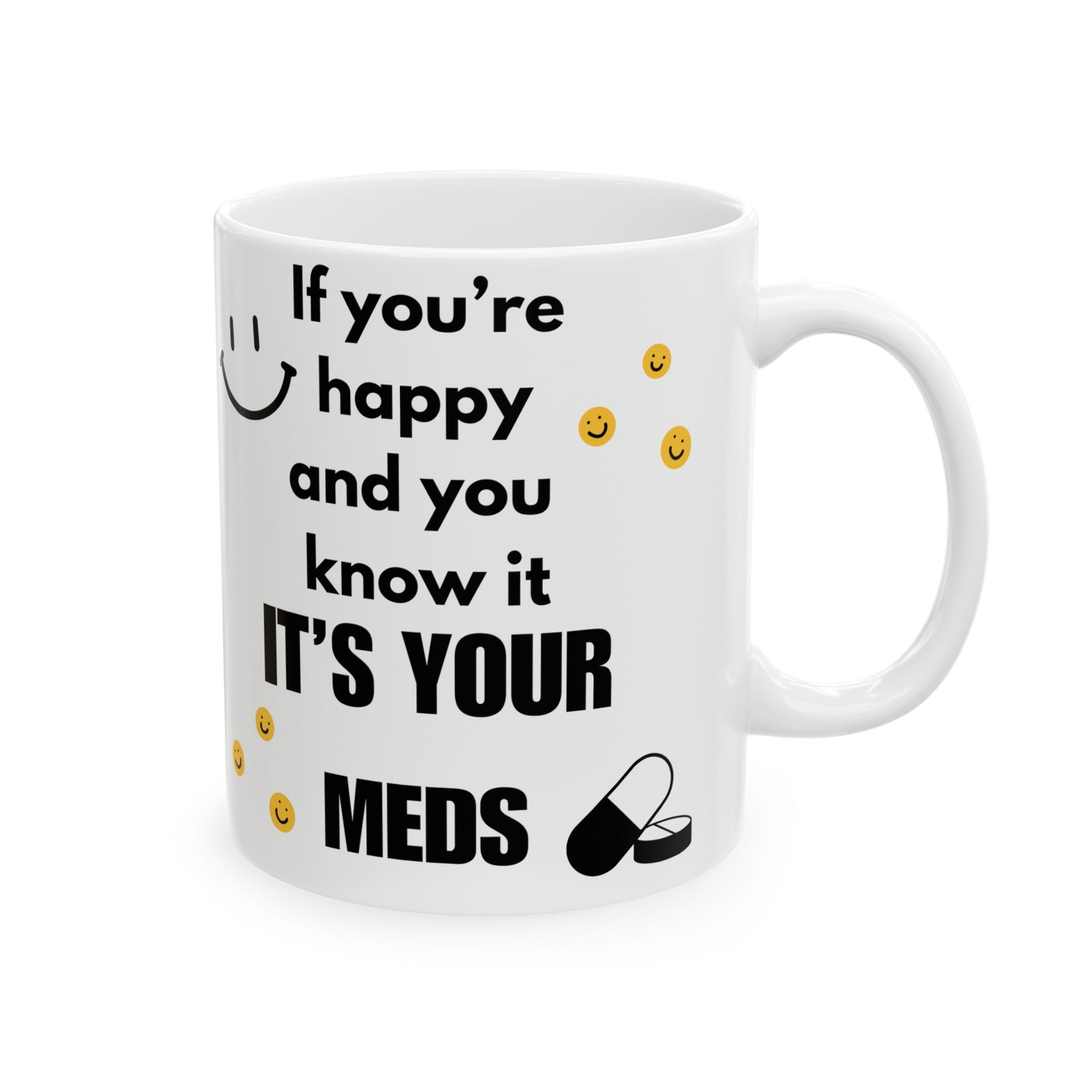 Brighten up your coffee break with a little humor! The “If You’re Happy and You Know It, It’s Your Meds” mug brings a funny twist to the classic song, combining light-hearted humor with mental health awareness. Featuring fun smiley faces and a witty message, it’s sure to bring a smile to anyone’s face. Whether you’re sipping coffee or tea, this durable ceramic mug available in 11 oz and 15 oz sizes offers both style and function. The print remains vibrant after washes, and it’s safe for both the microwave and dishwasher. It’s the gift for a friend, family member, or coworker who enjoys a good laugh and relatable humor!