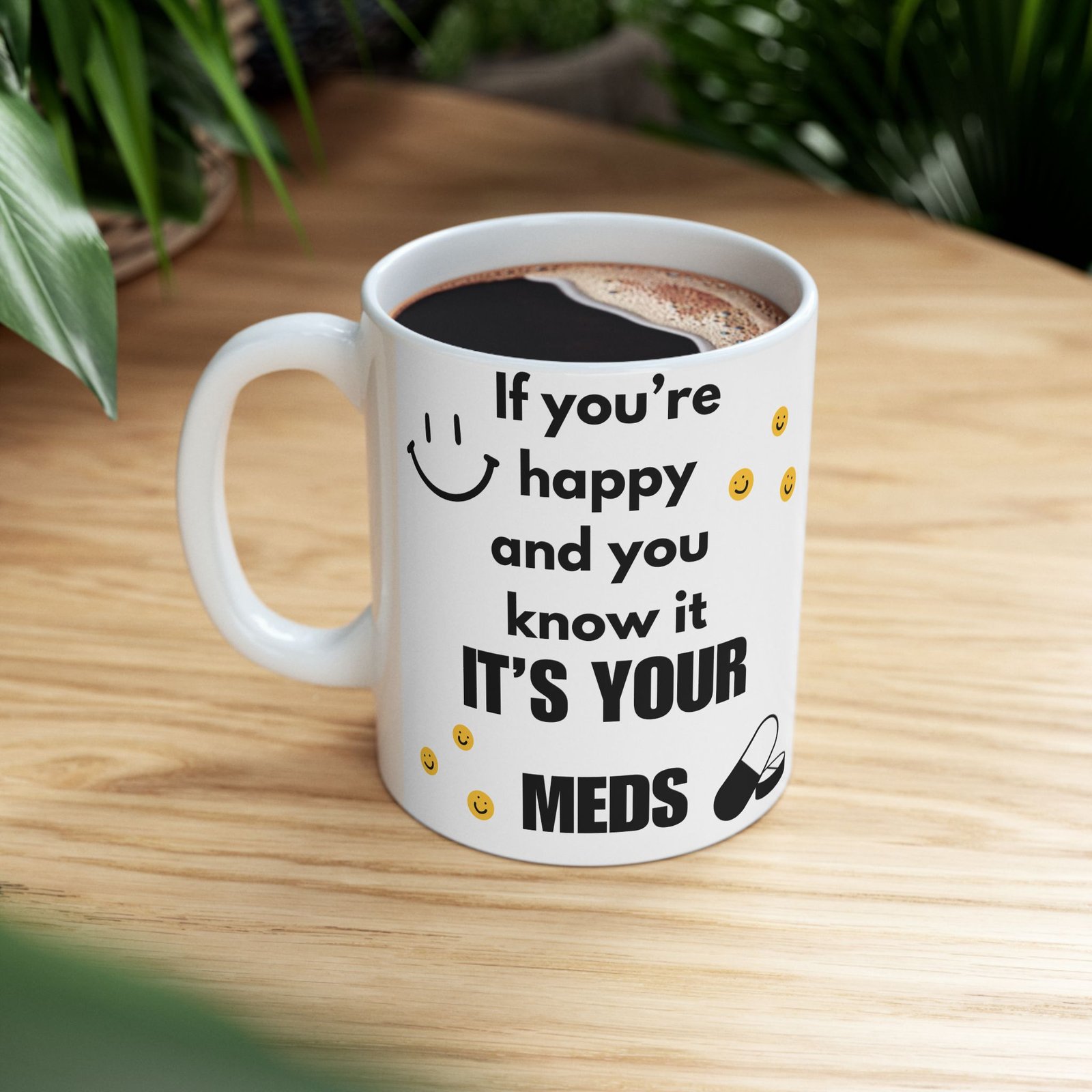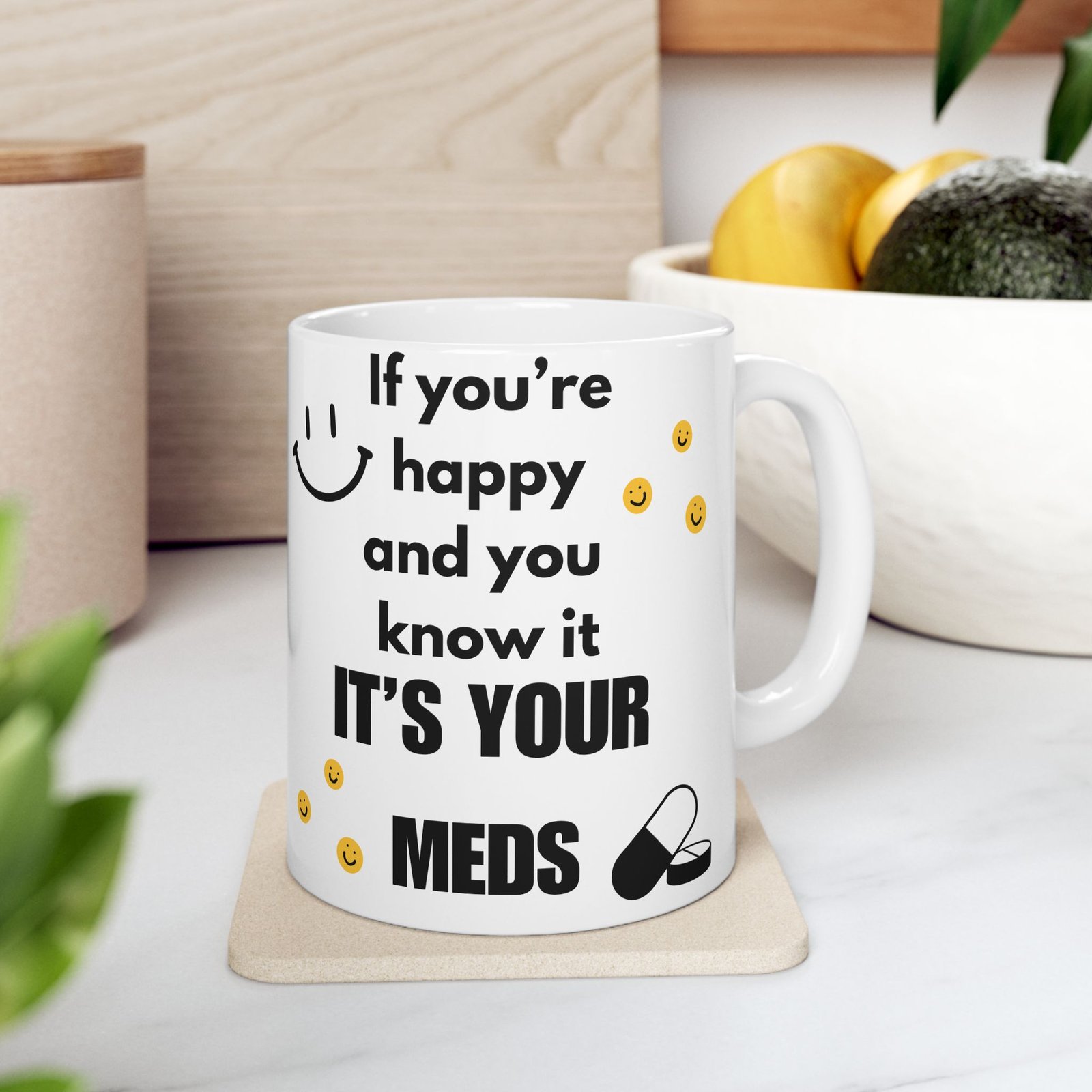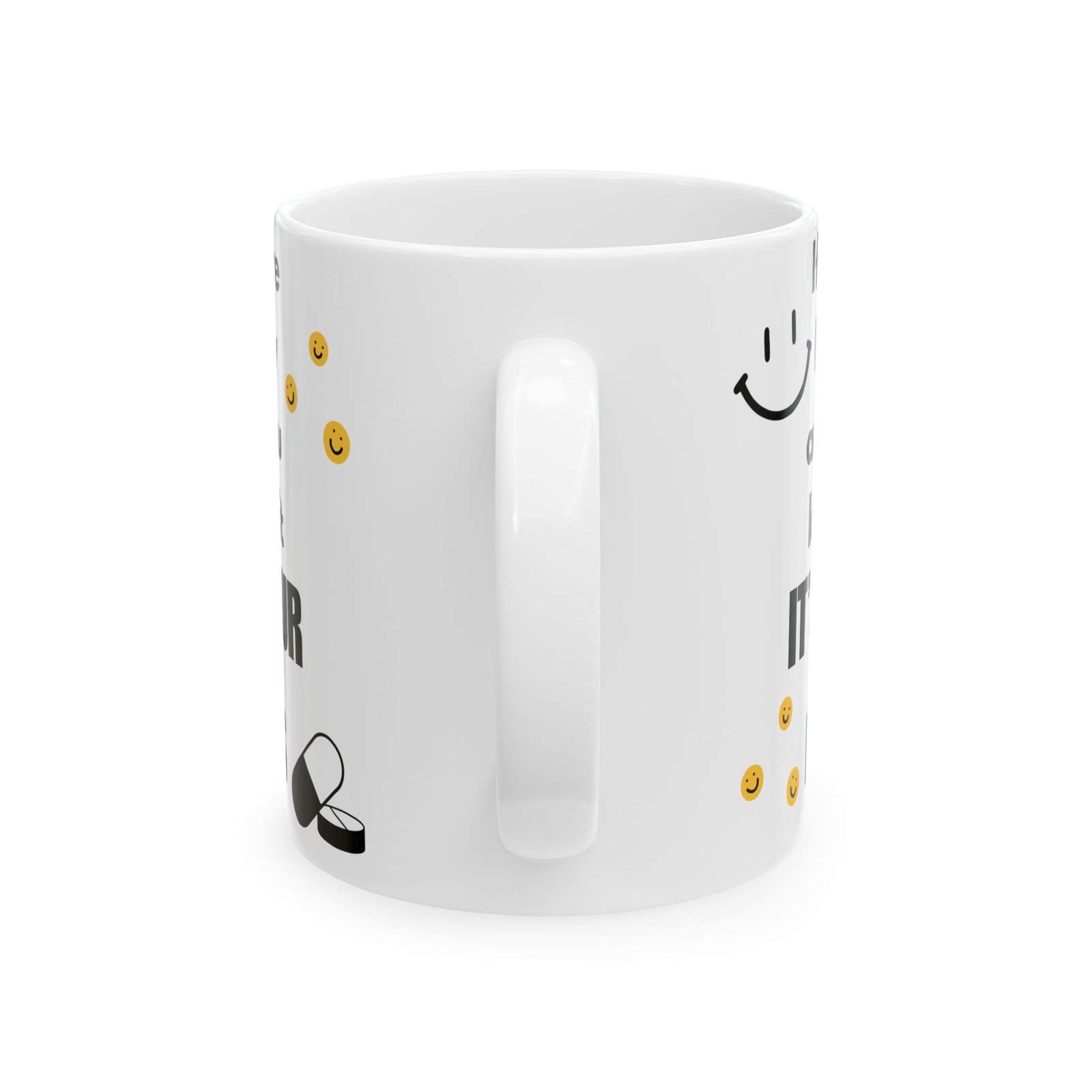 Brighten up your coffee break with a little humor! The “If You’re Happy and You Know It, It’s Your Meds” mug brings a funny twist to the classic song, combining light-hearted humor with mental health awareness. Featuring fun smiley faces and a witty message, it’s sure to bring a smile to anyone’s face. Whether you’re sipping coffee or tea, this durable ceramic mug available in 11 oz and 15 oz sizes offers both style and function. The print remains vibrant after washes, and it’s safe for both the microwave and dishwasher. It’s the gift for a friend, family member, or coworker who enjoys a good laugh and relatable humor!
