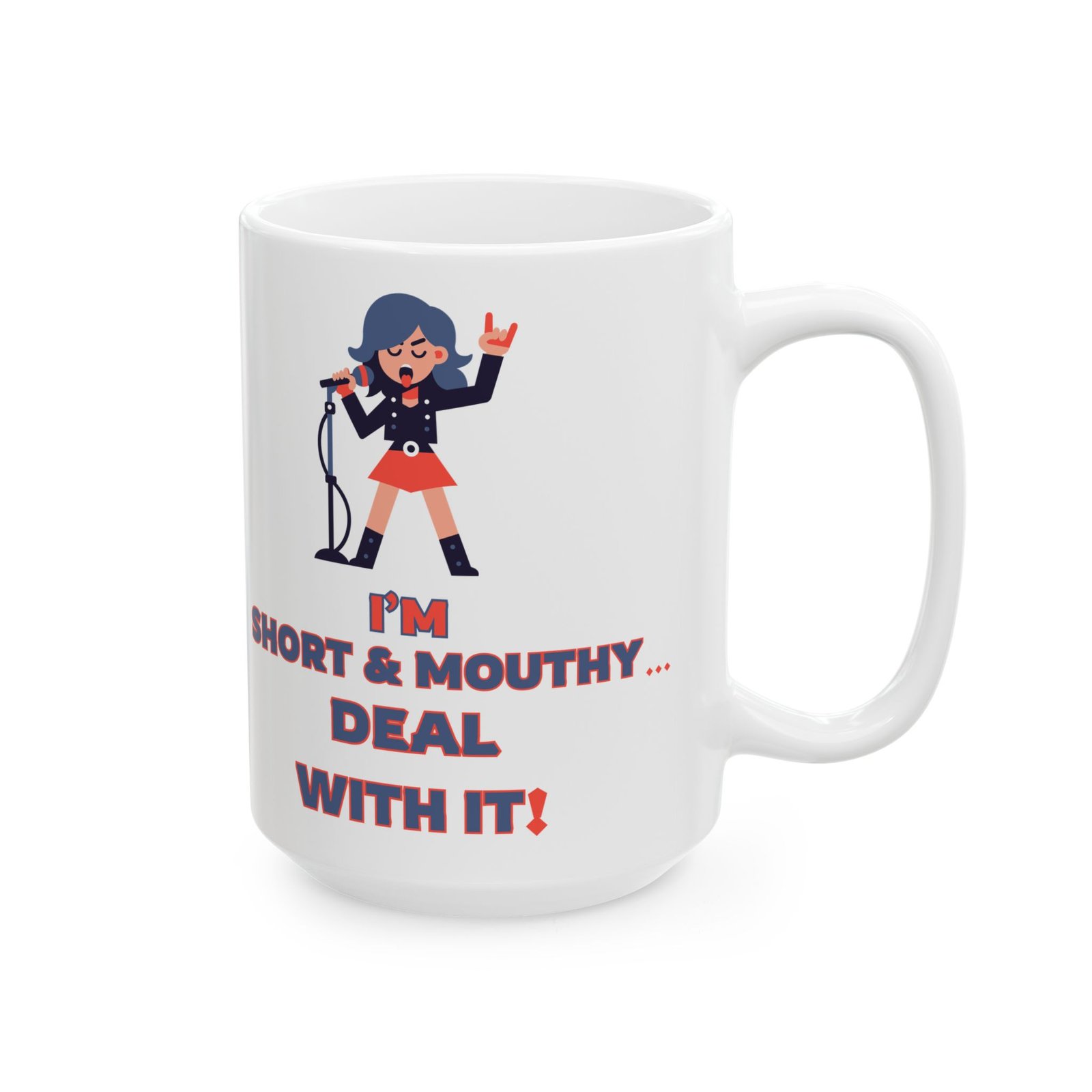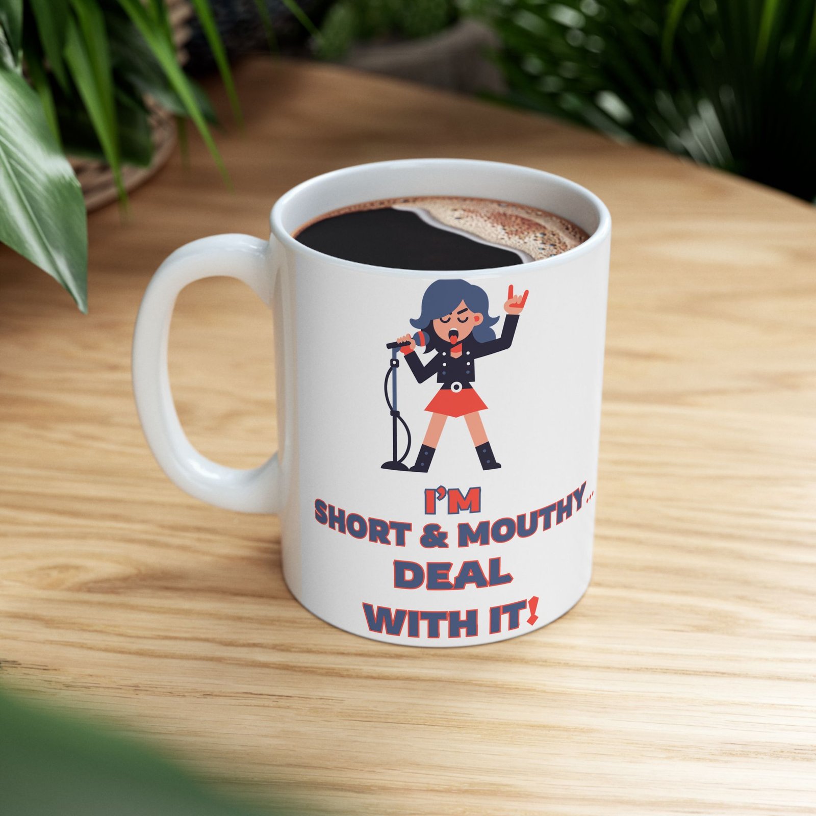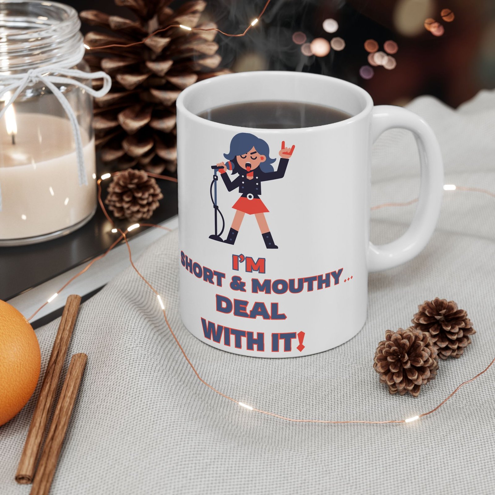 Embrace your sass with this fun and cheeky mug! Featuring the phrase “I’m Short & Mouthy… Deal with It!” alongside a playful image of a girl holding a microphone, this mug is ideal for anyone with a bold personality and a sharp sense of humor. Whether you’re grabbing your morning coffee or enjoying tea in the afternoon, this mug is available in both 11oz and 15oz sizes to suit your needs. Made from durable ceramic and printed with vibrant colors, it’s both microwave and dishwasher safe for easy use and care. Whether it’s for yourself or as a gift for a fellow firecracker, this mug is sure to bring a smile to anyone’s face!
