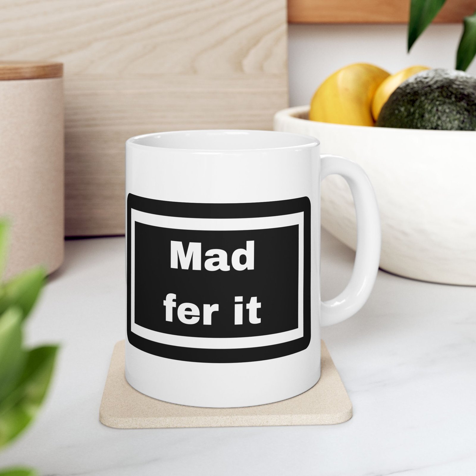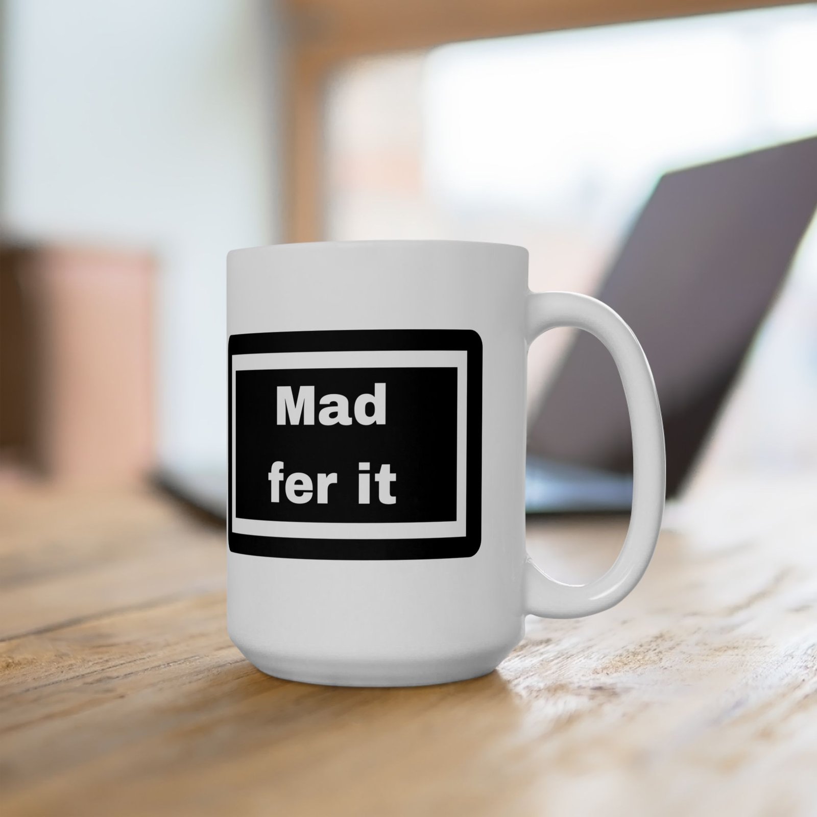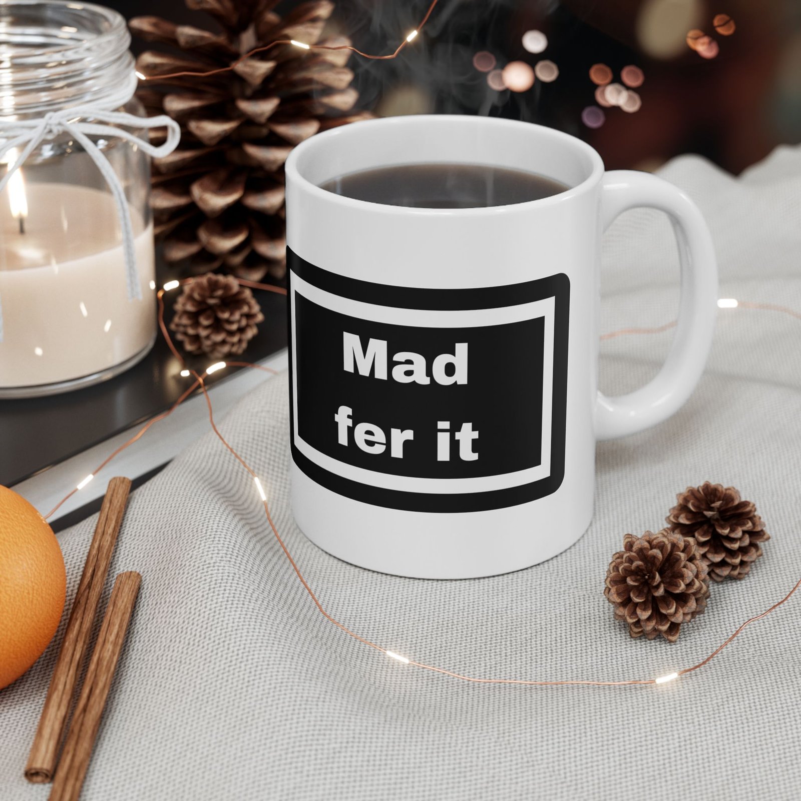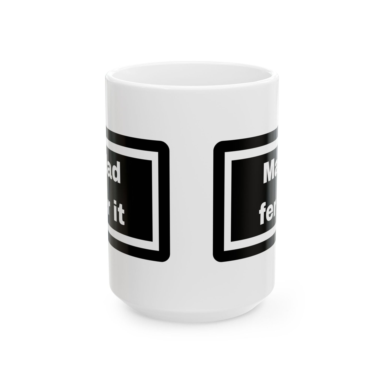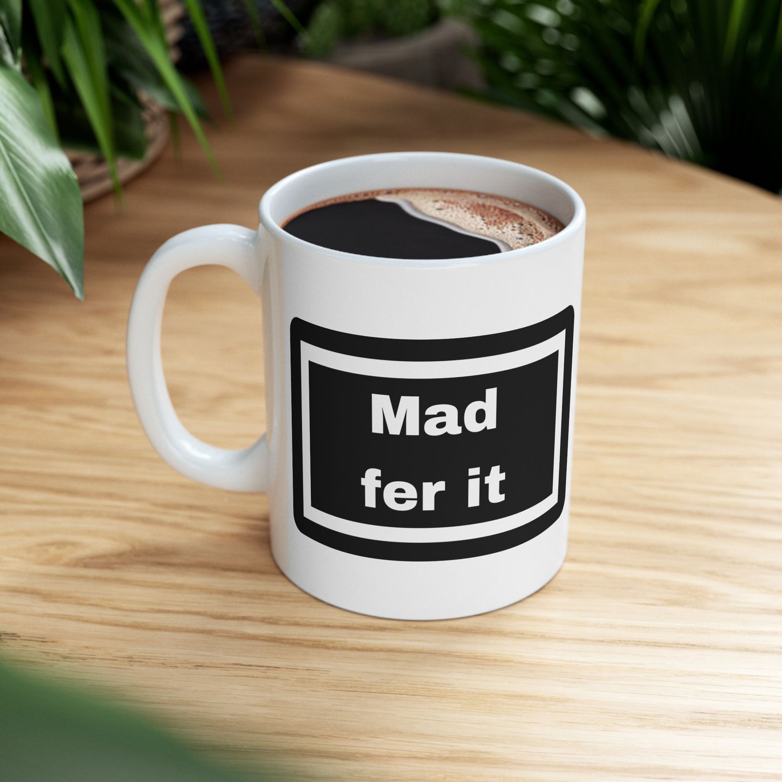 Channel your inner Mancunian with this “Mad Fer It” 11 oz ceramic mug, a tribute to the heart and soul of Manchester.