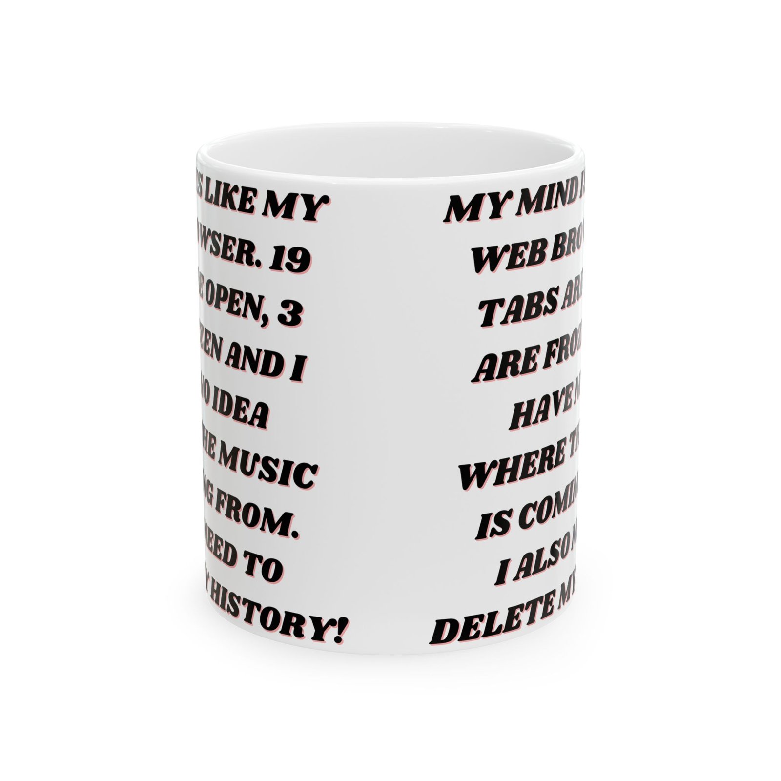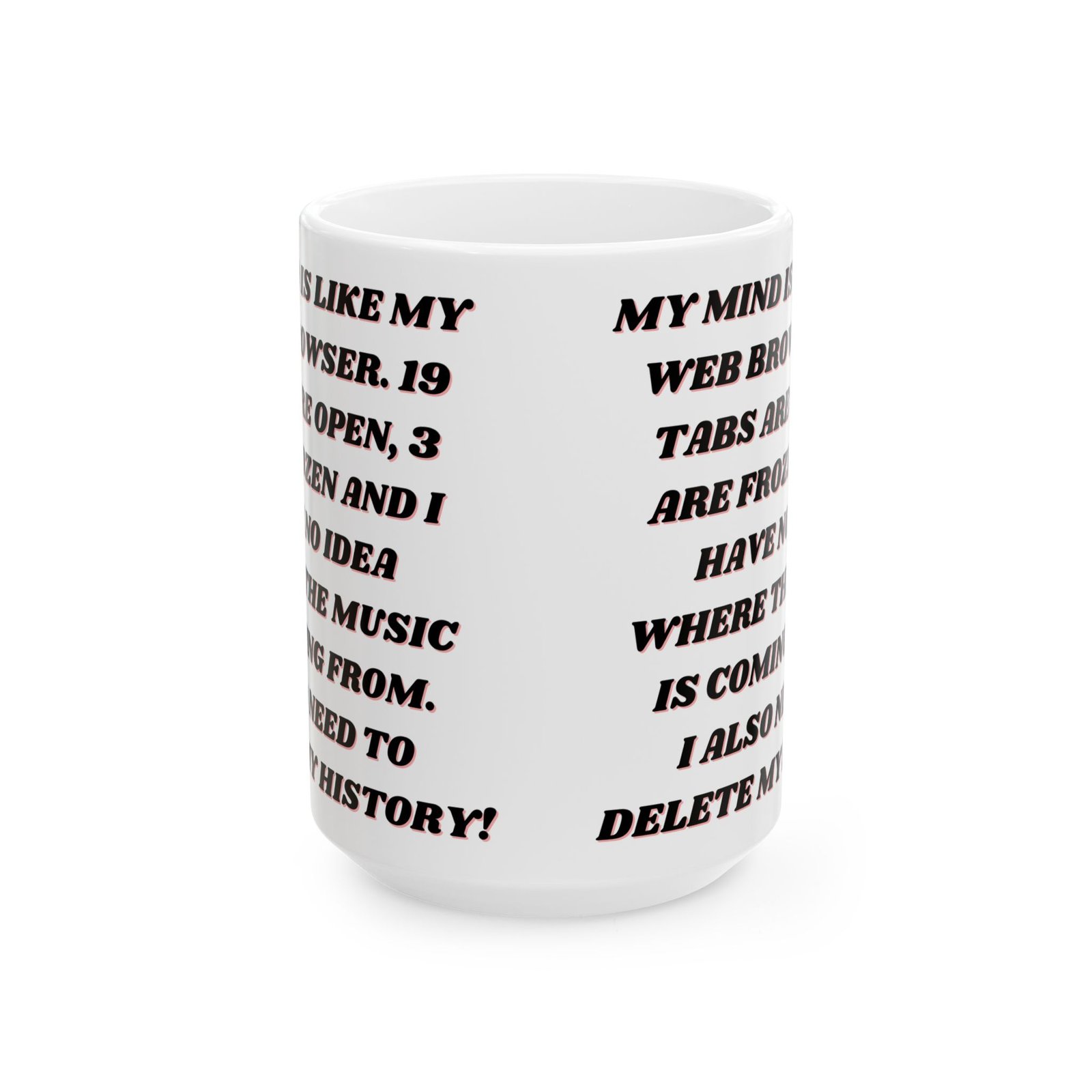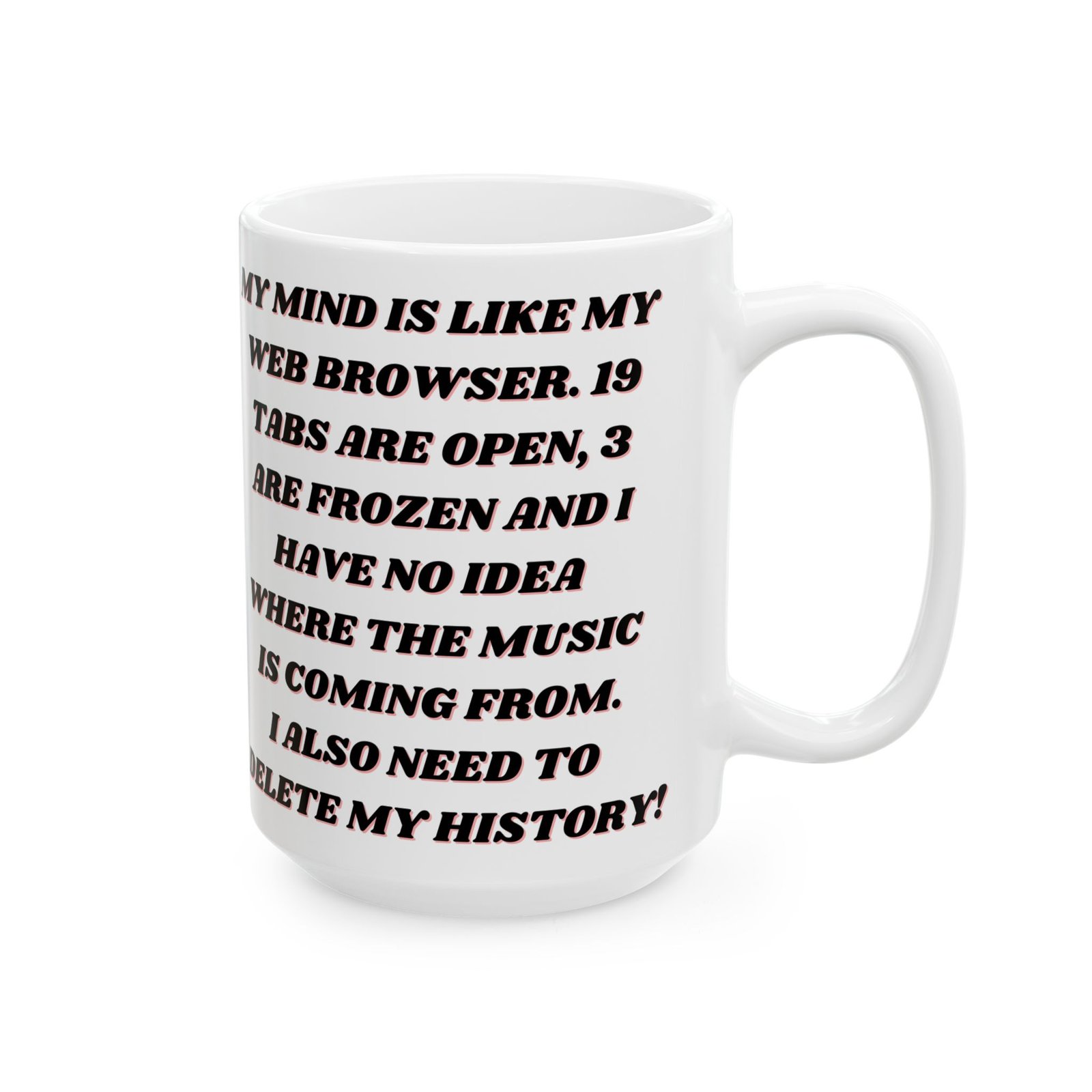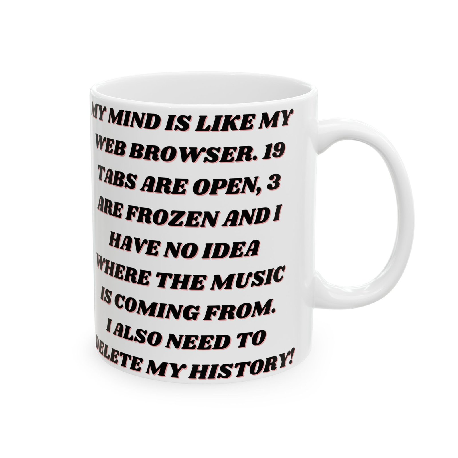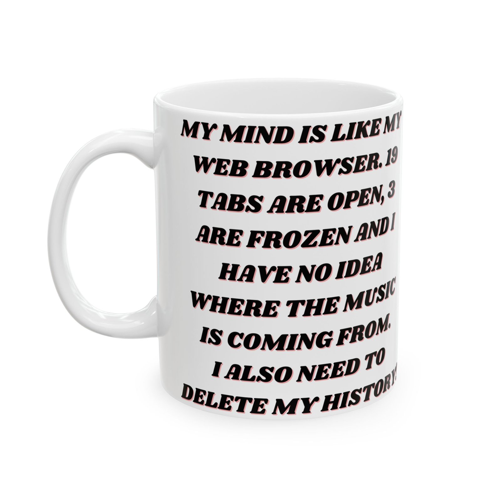 This mug brings humor to the experience of multitasking and mental clutter, reminding us it’s okay to laugh at our “browser tab” brains. Ideal for your home, office, or as a fun gift for anyone who understands the struggles of too many open tabs!