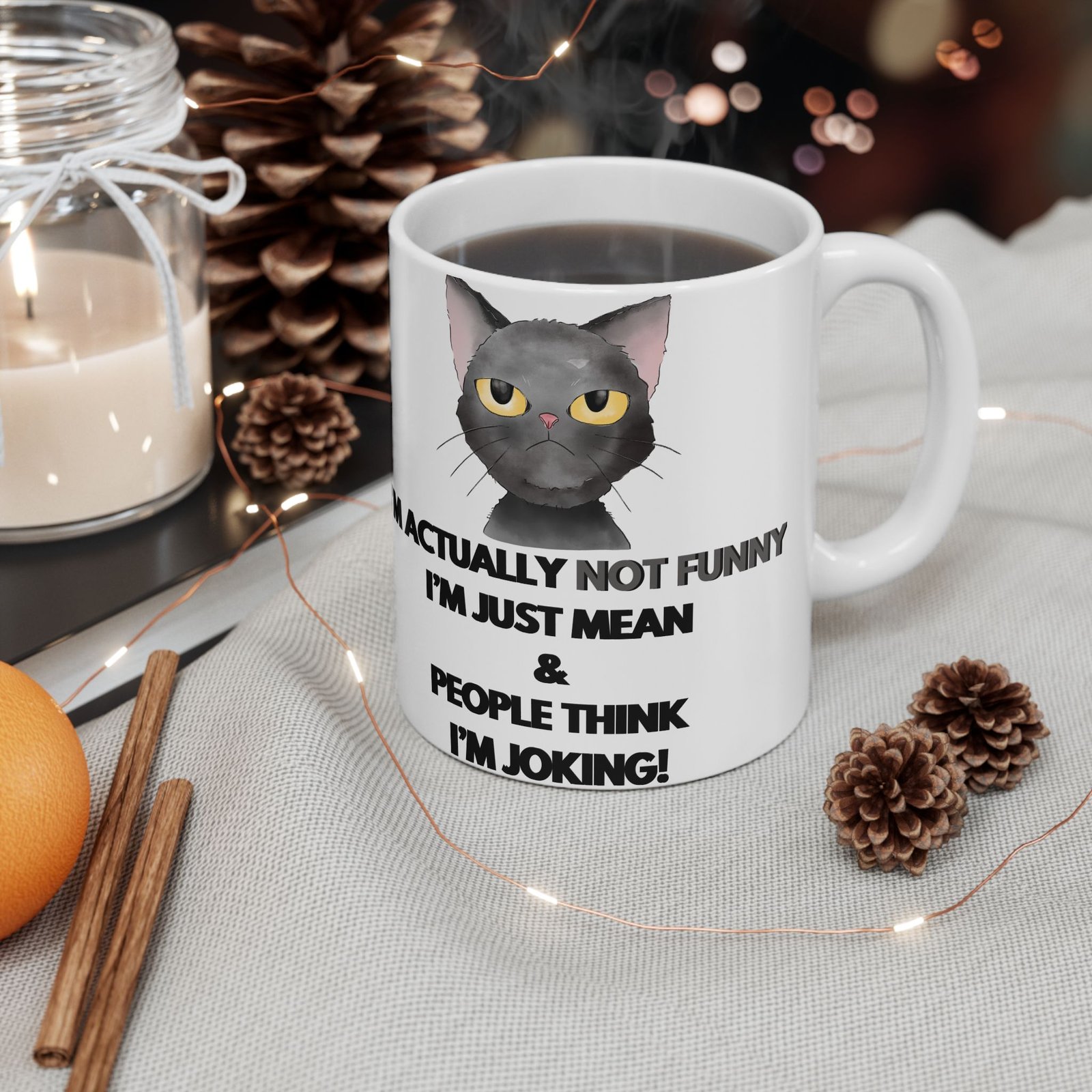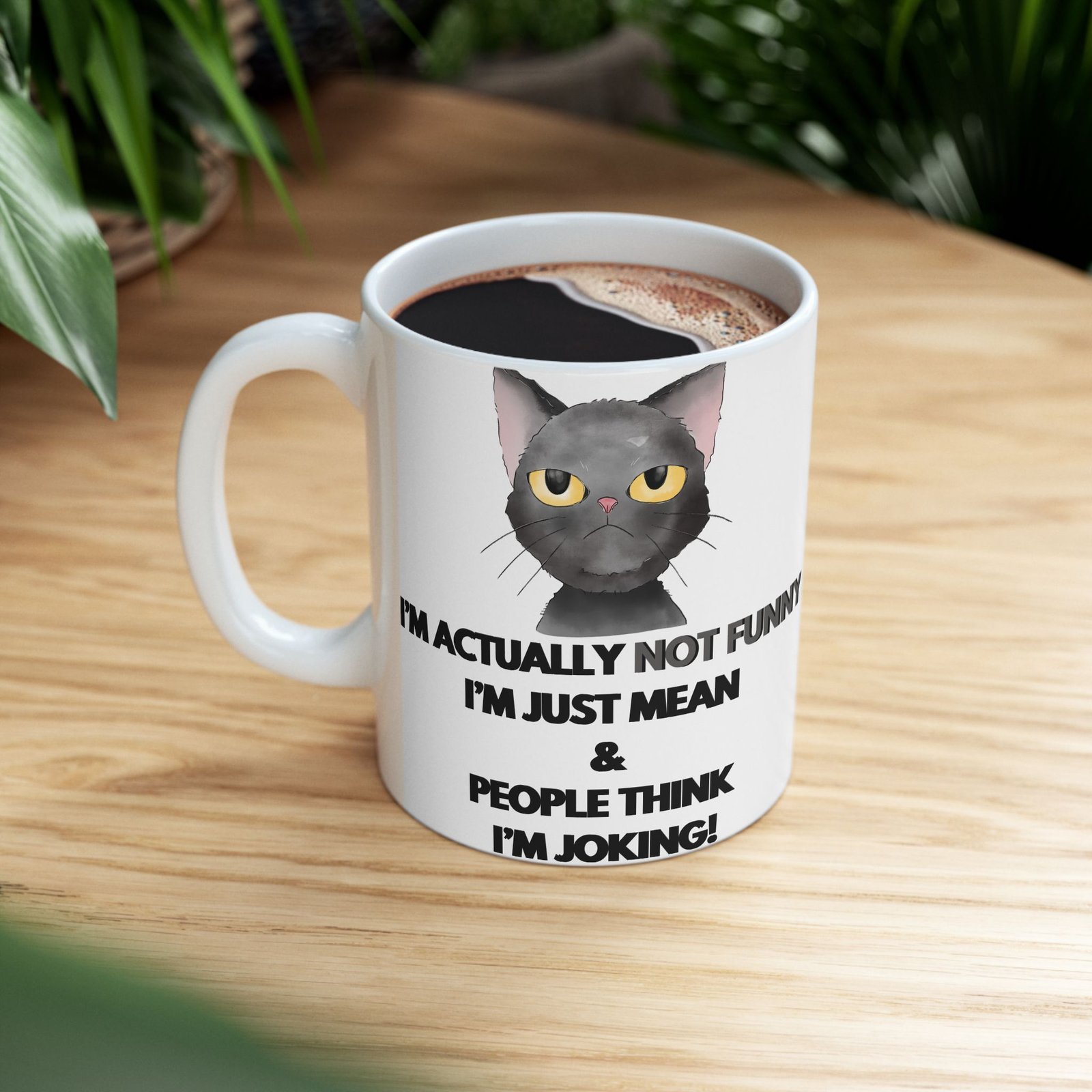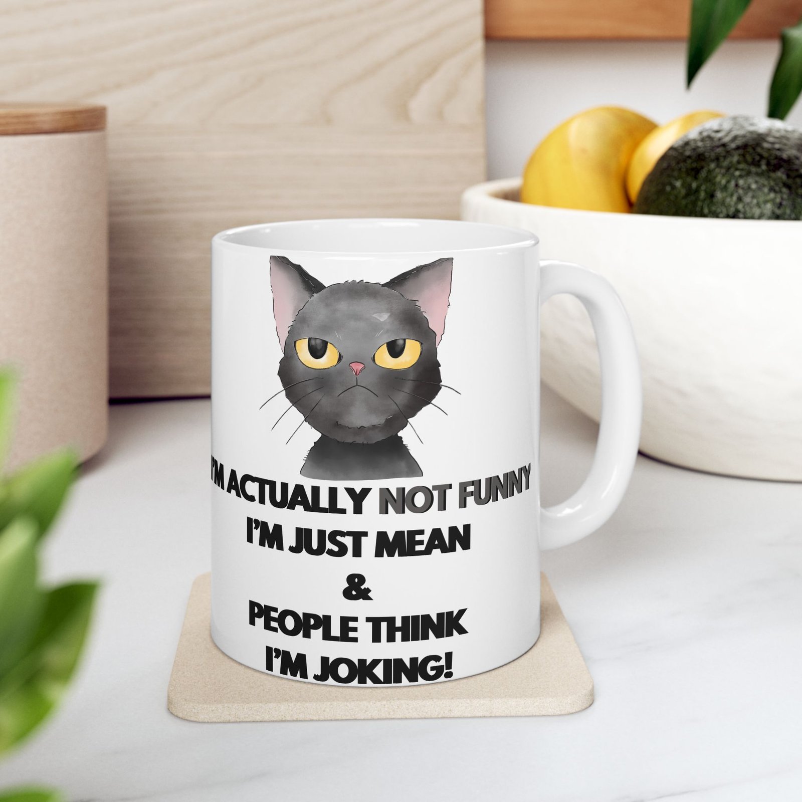 Sometimes, you’re not trying to be funny—you’re just being real, and this Not Funny, Just Mean Coffee Mug says it all! Featuring the bold phrase, “I’m Actually Not Funny, I’m Just Mean & People Think I’m Joking!” alongside a grumpy cat face, this mug is perfect for anyone who’s unapologetically sarcastic. Available in 11oz and 15oz, this mug is microwave and dishwasher safe, making it easy to use and clean. It’s the perfect gift for those with a biting sense of humor, whether at the office, home, or anywhere else. Great for sarcastic coworker gifts, funny office mugs, or just showing off your true self.