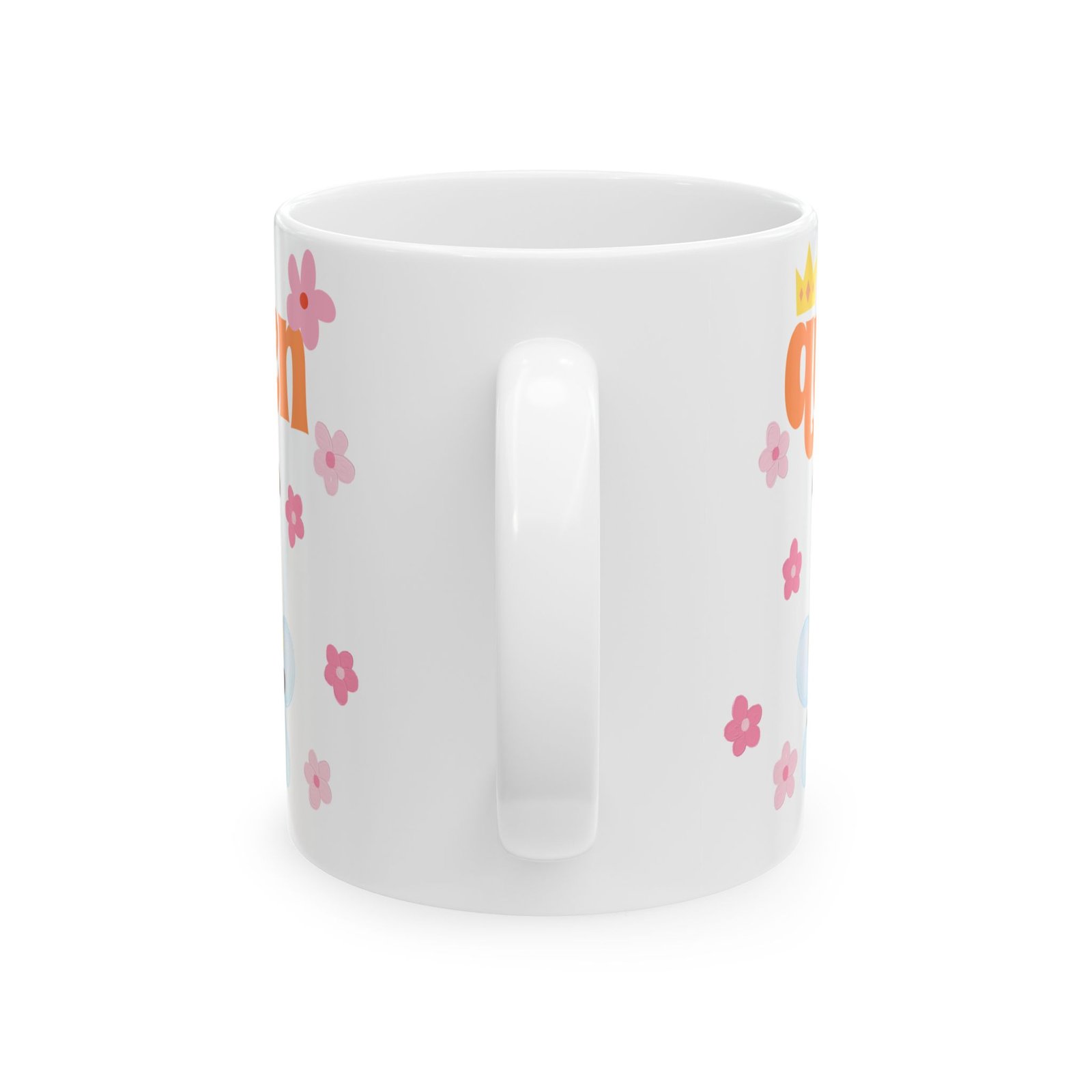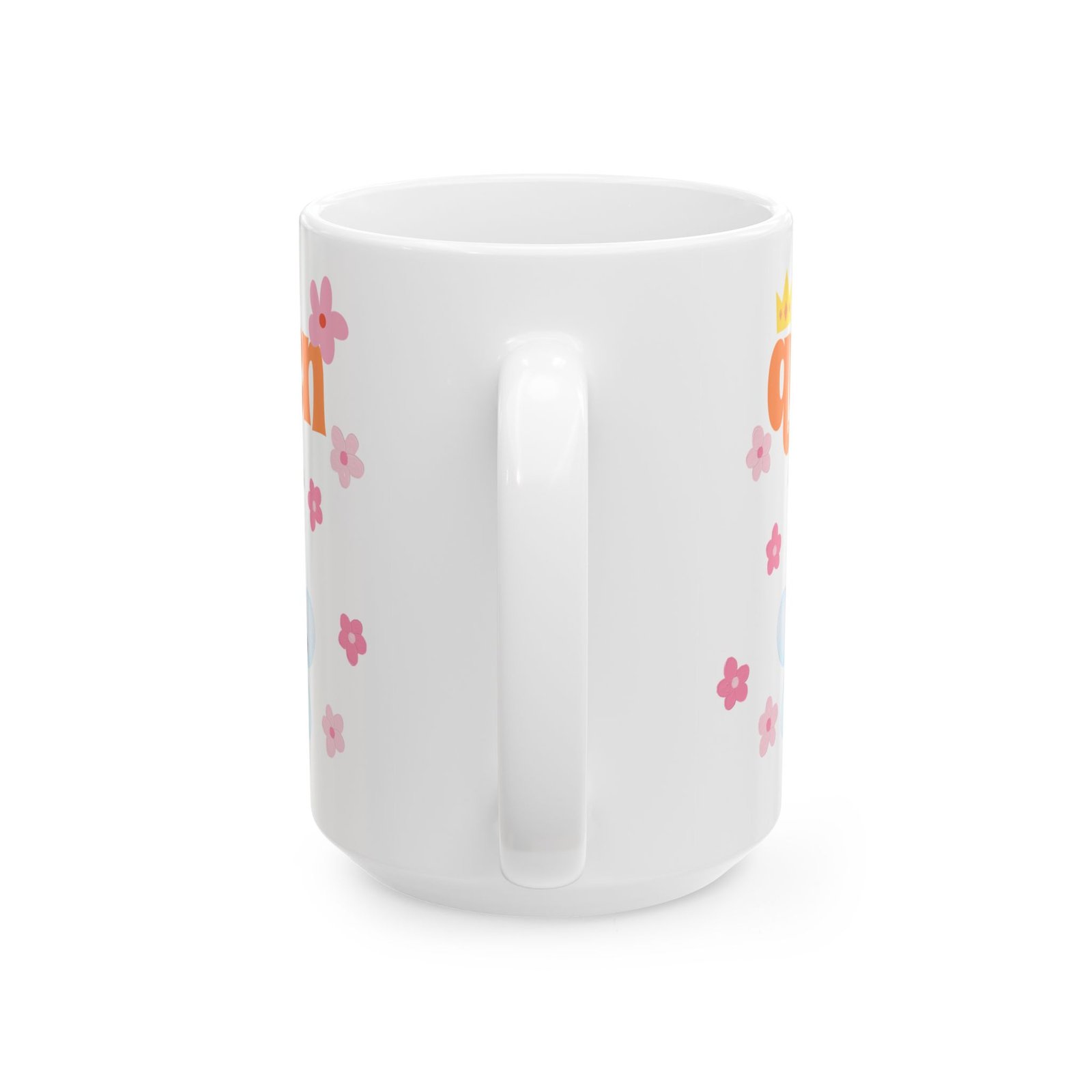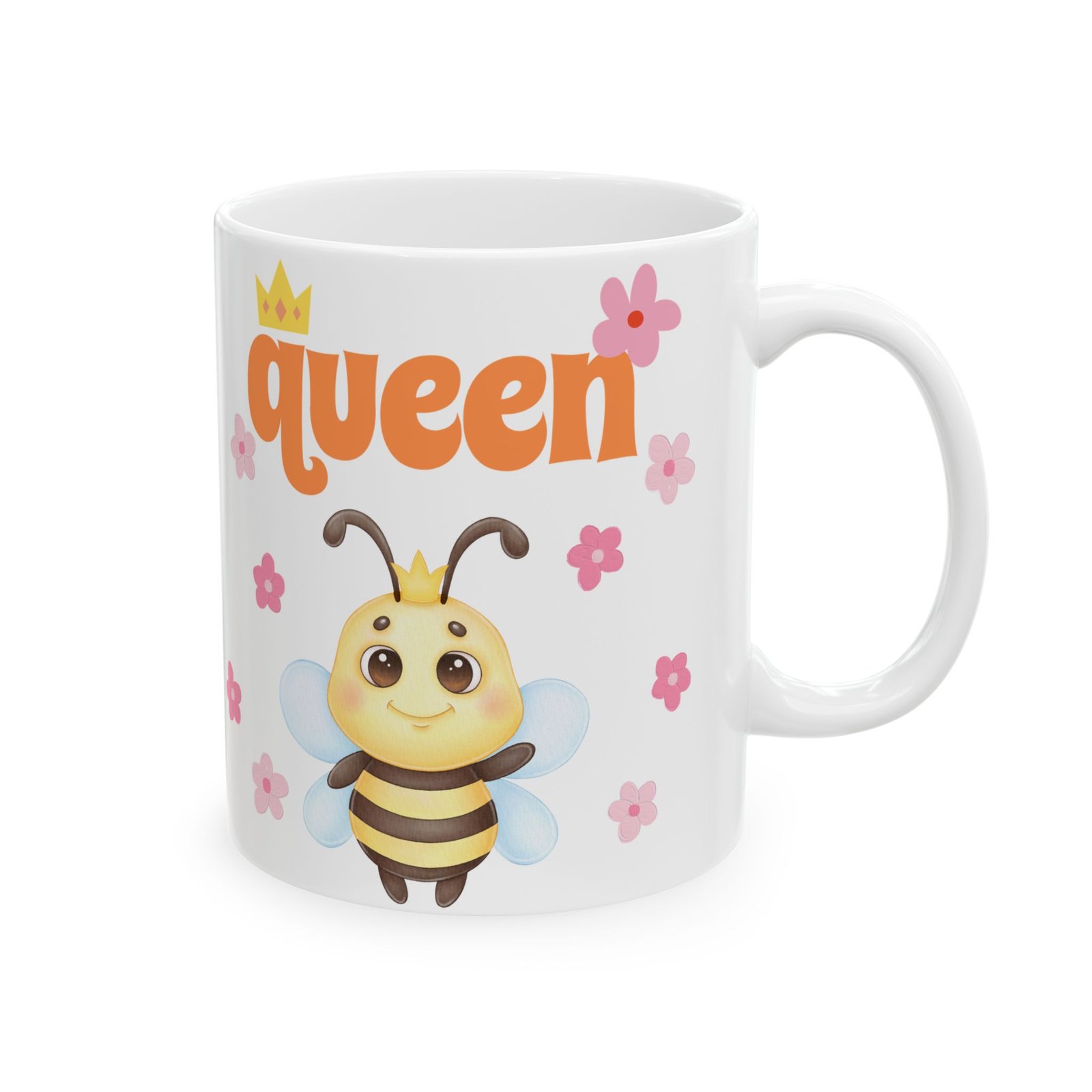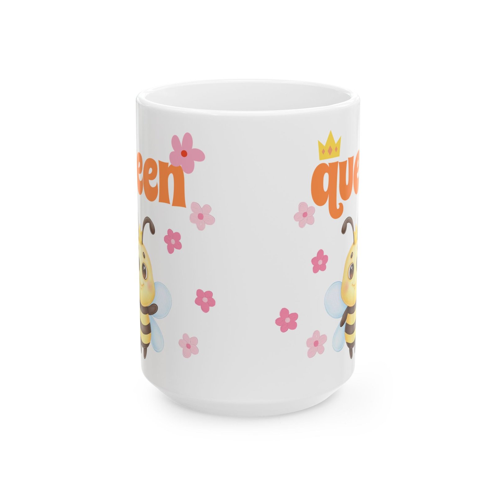 Available in both 11oz and 15oz sizes, this mug features a cute bee wearing a crown, surrounded by cheerful little flowers.