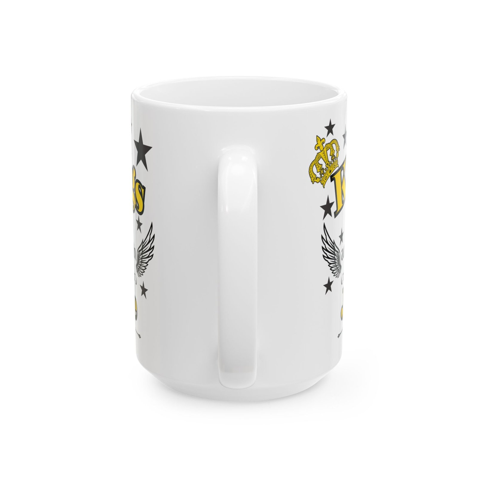 This sleek ceramic mug, available in 11oz or 15oz sizes, is perfect for the king in your life.