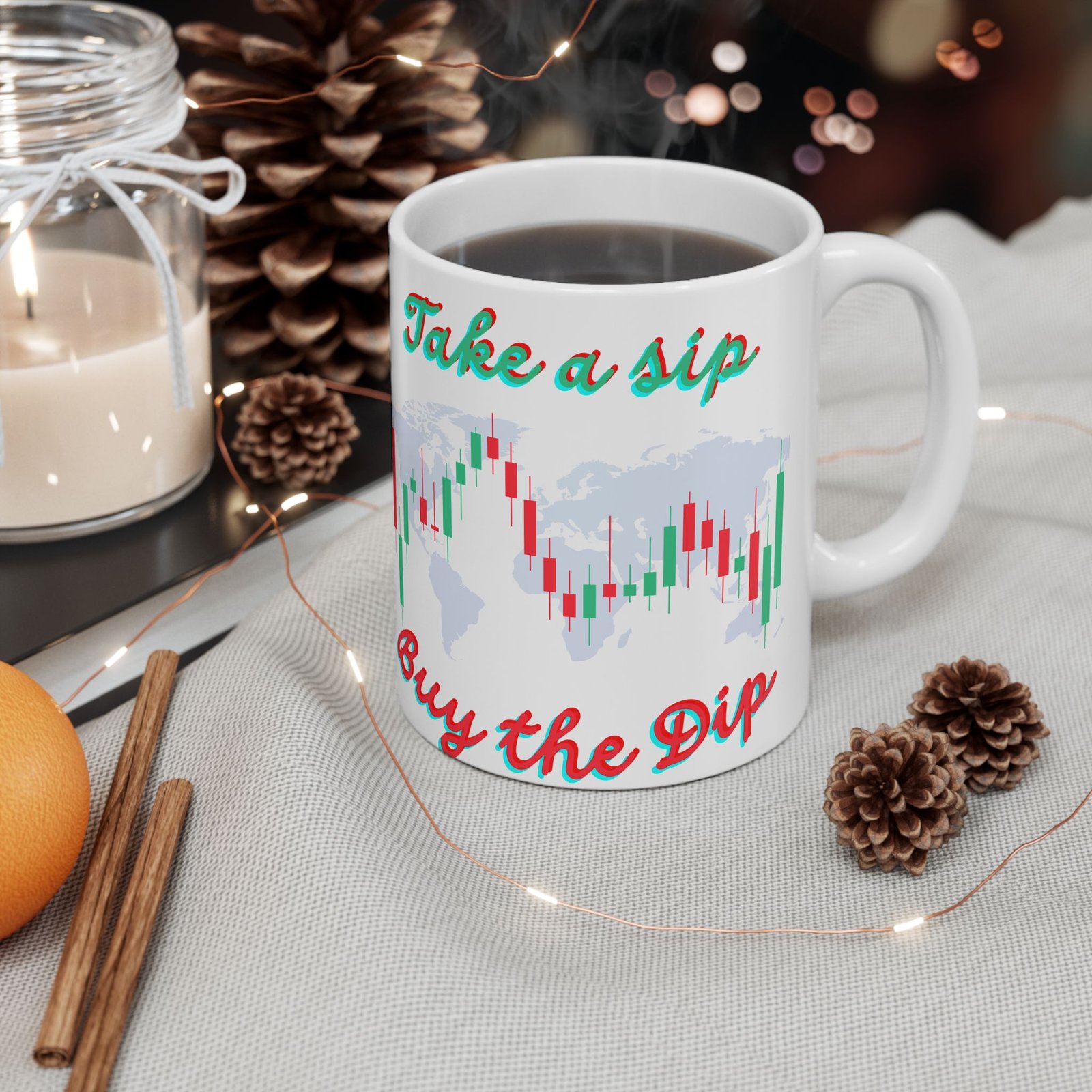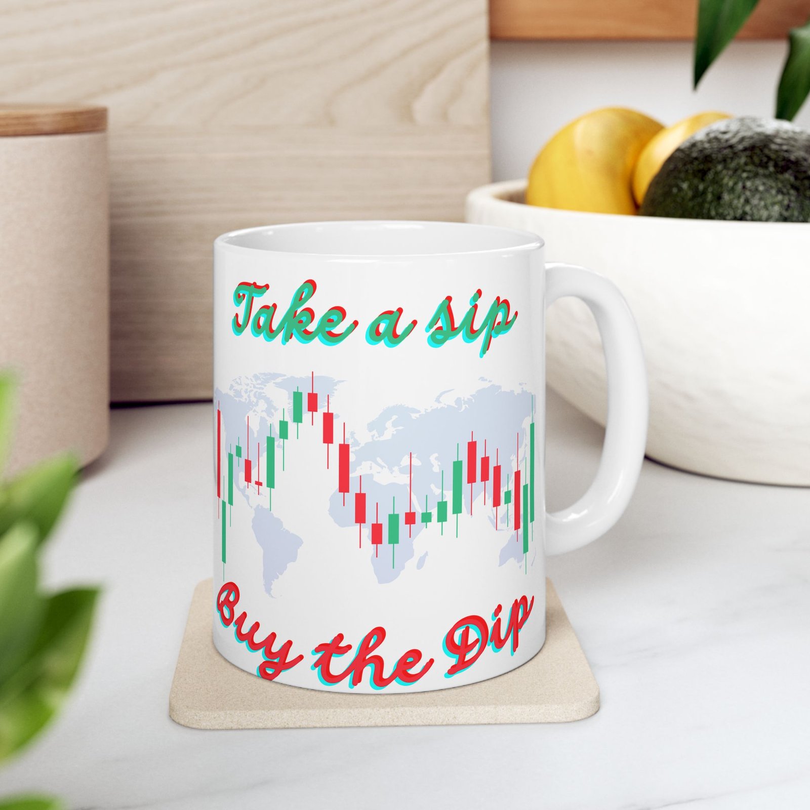 This “Take a Sip, Buy the Dip” cryptocurrency candles chart on elegant coffee mug adds a bit of humor to your morning coffee, making it a great gift for Bitcoin traders, crypto enthusiasts, and anyone who enjoys the world of cryptocurrency. Whether you’re tracking the latest crypto trends or just want to start the day on a high note, this mug serves up your favorite beverage with a side of inspiration. Available in both 11 oz and 15 oz sizes, this ceramic crypto mug is built to handle your morning caffeine dose or afternoon tea break with style and durability.