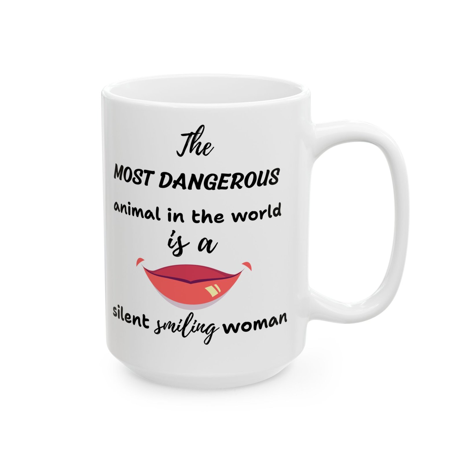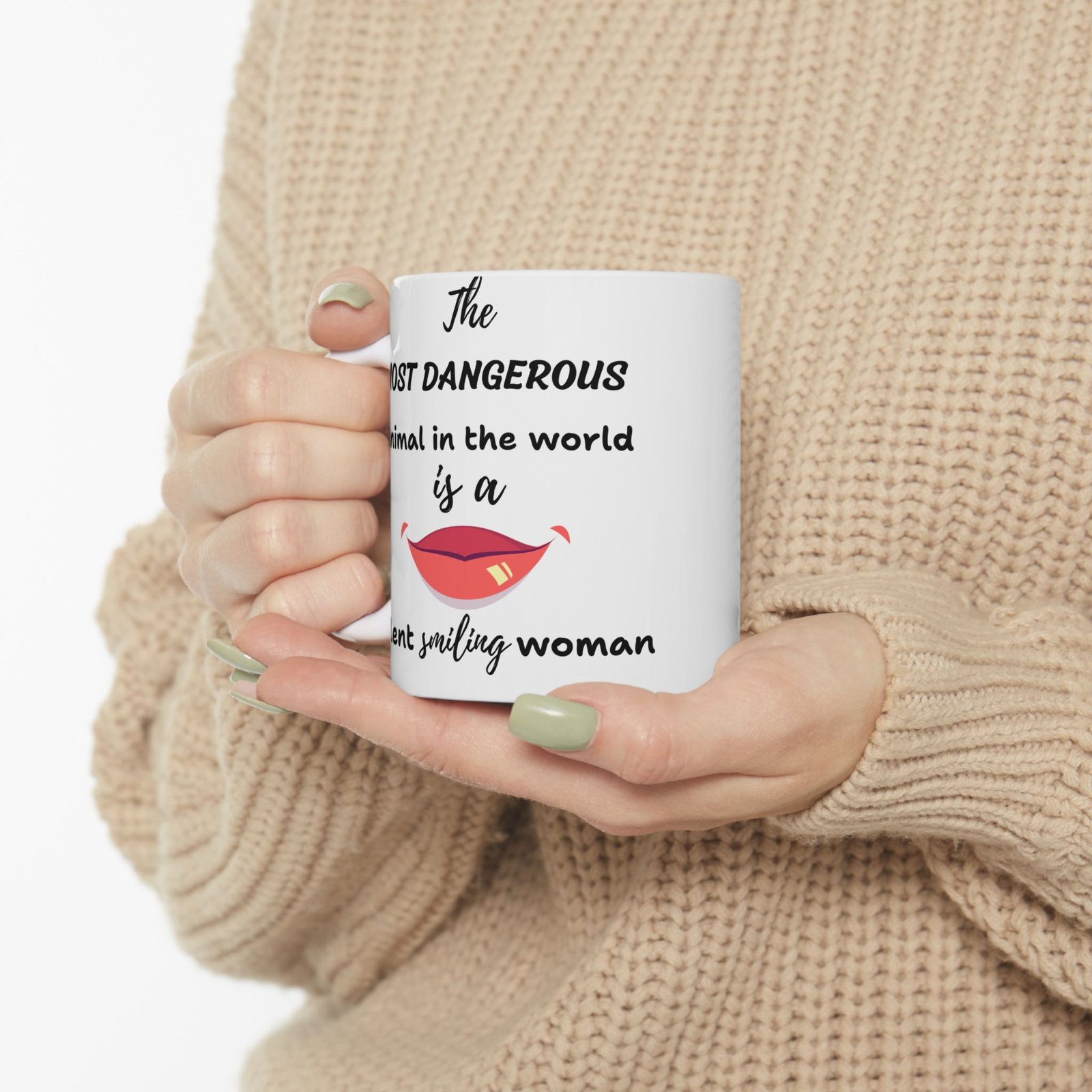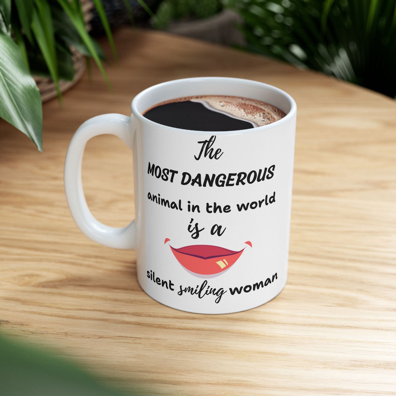 Warn them with a smile! This hilarious mug reads, “The Most Dangerous Animal in the World Is a Silent, Smiling Woman,” making it a gift for anyone who appreciates humor with a bit of an edge. Crafted from durable ceramic and available in both 11oz and 15oz sizes, this mug is microwave and dishwasher safe, ideal for daily use. Whether it’s a personal pick-me-up or a funny gift for friends or coworkers, this mug will add a touch of sass to every sip.