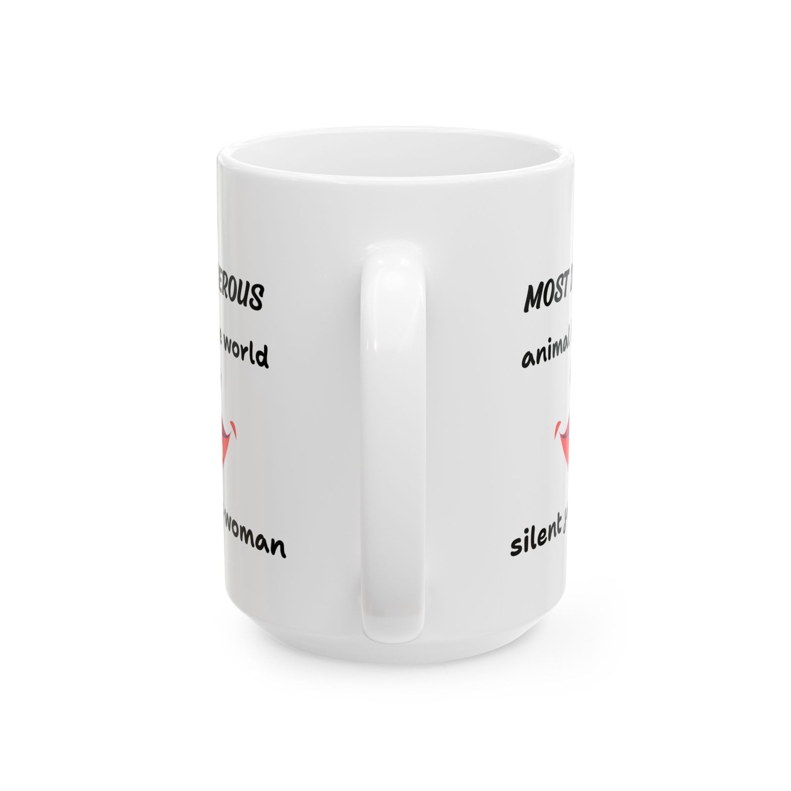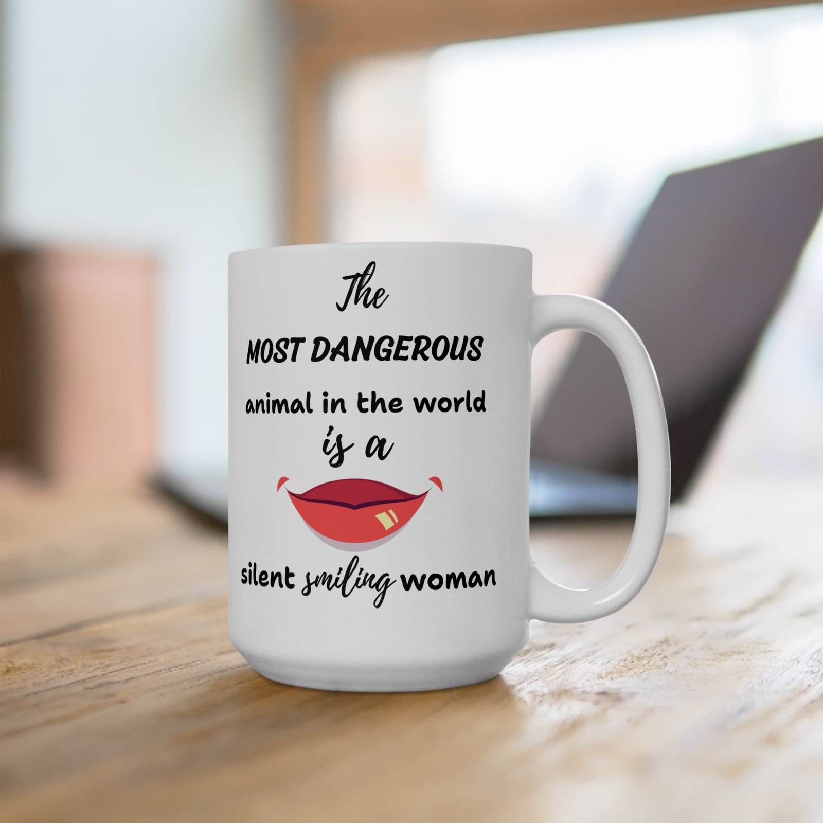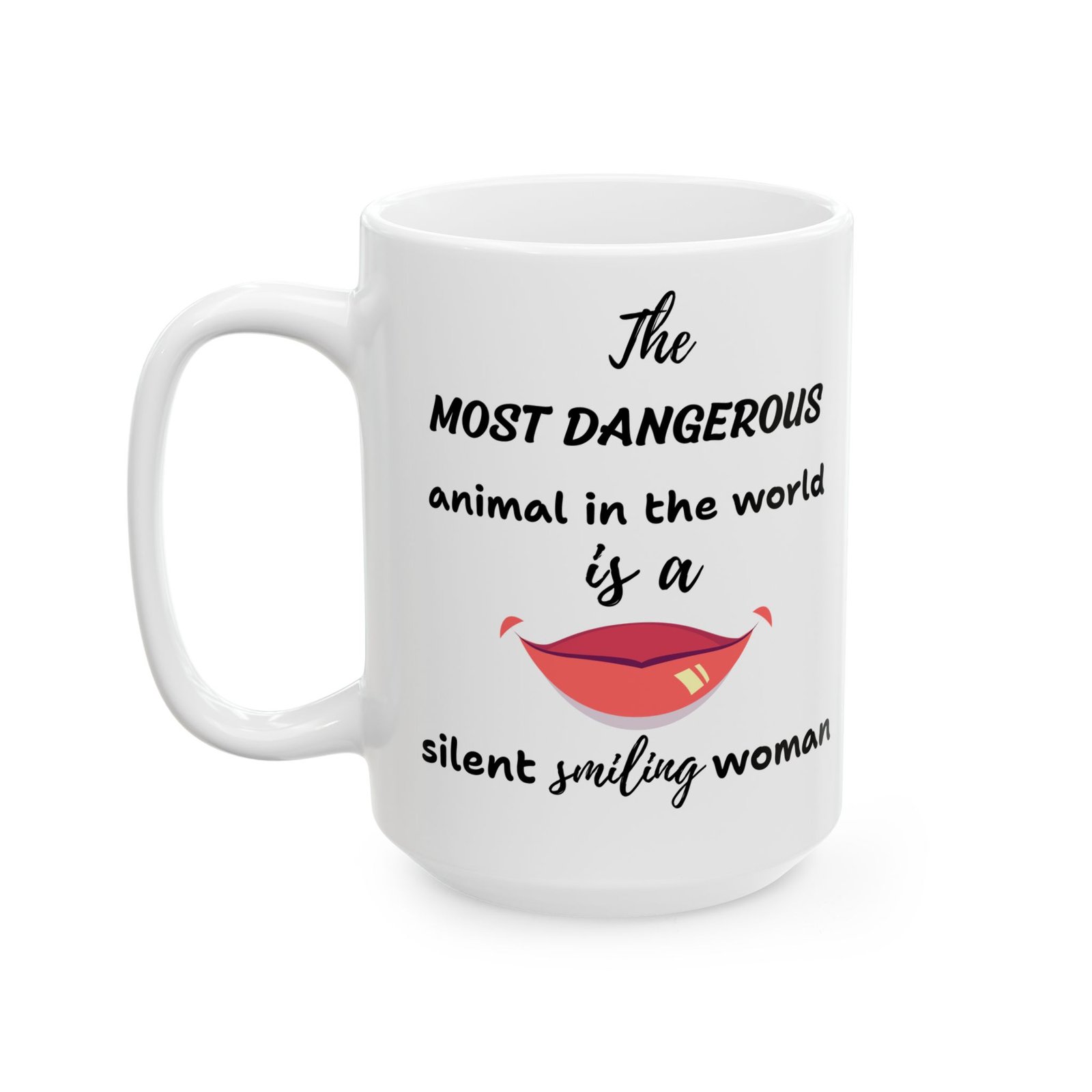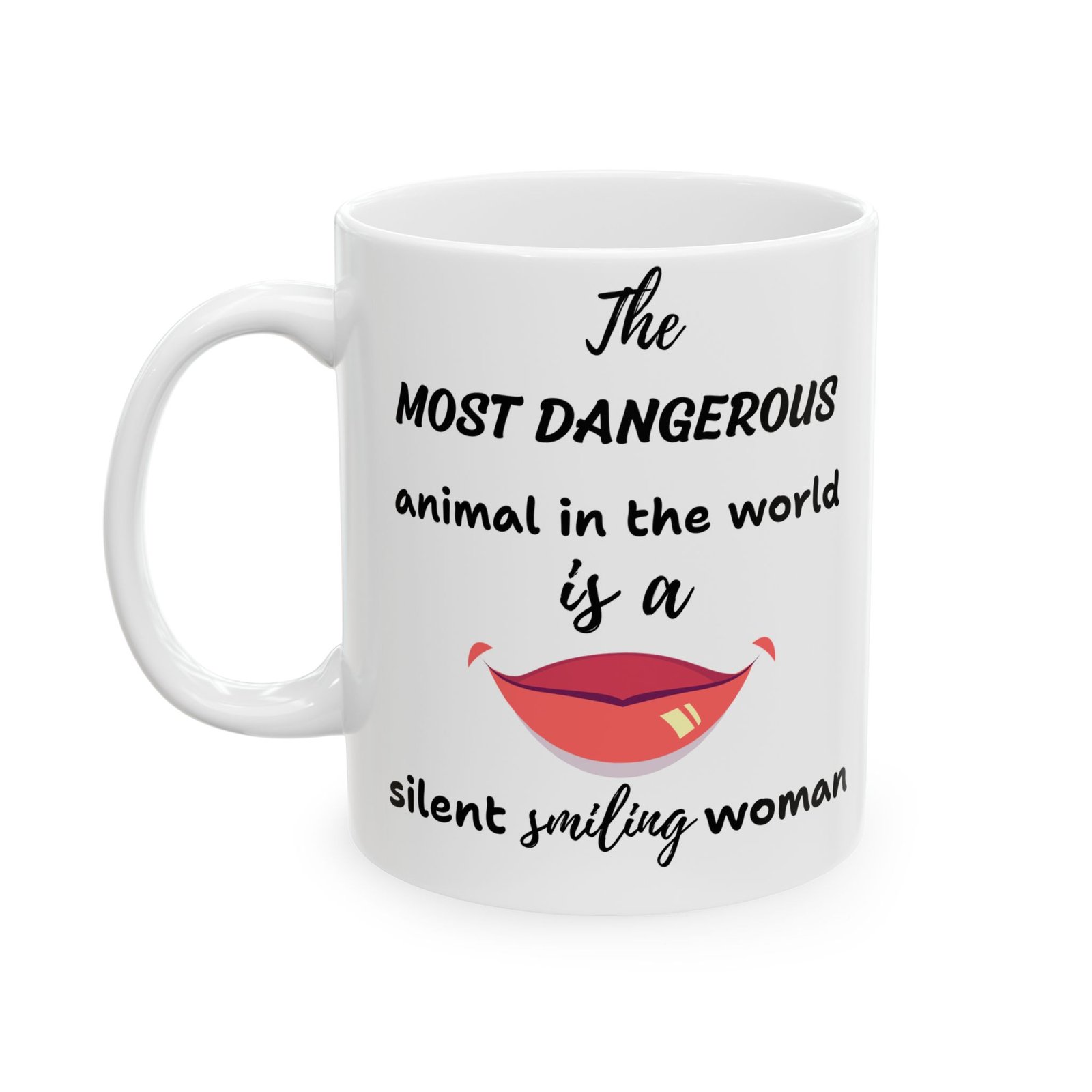 Warn them with a smile! This hilarious mug reads, “The Most Dangerous Animal in the World Is a Silent, Smiling Woman,” making it a gift for anyone who appreciates humor with a bit of an edge. Crafted from durable ceramic and available in both 11oz and 15oz sizes, this mug is microwave and dishwasher safe, ideal for daily use. Whether it’s a personal pick-me-up or a funny gift for friends or coworkers, this mug will add a touch of sass to every sip.