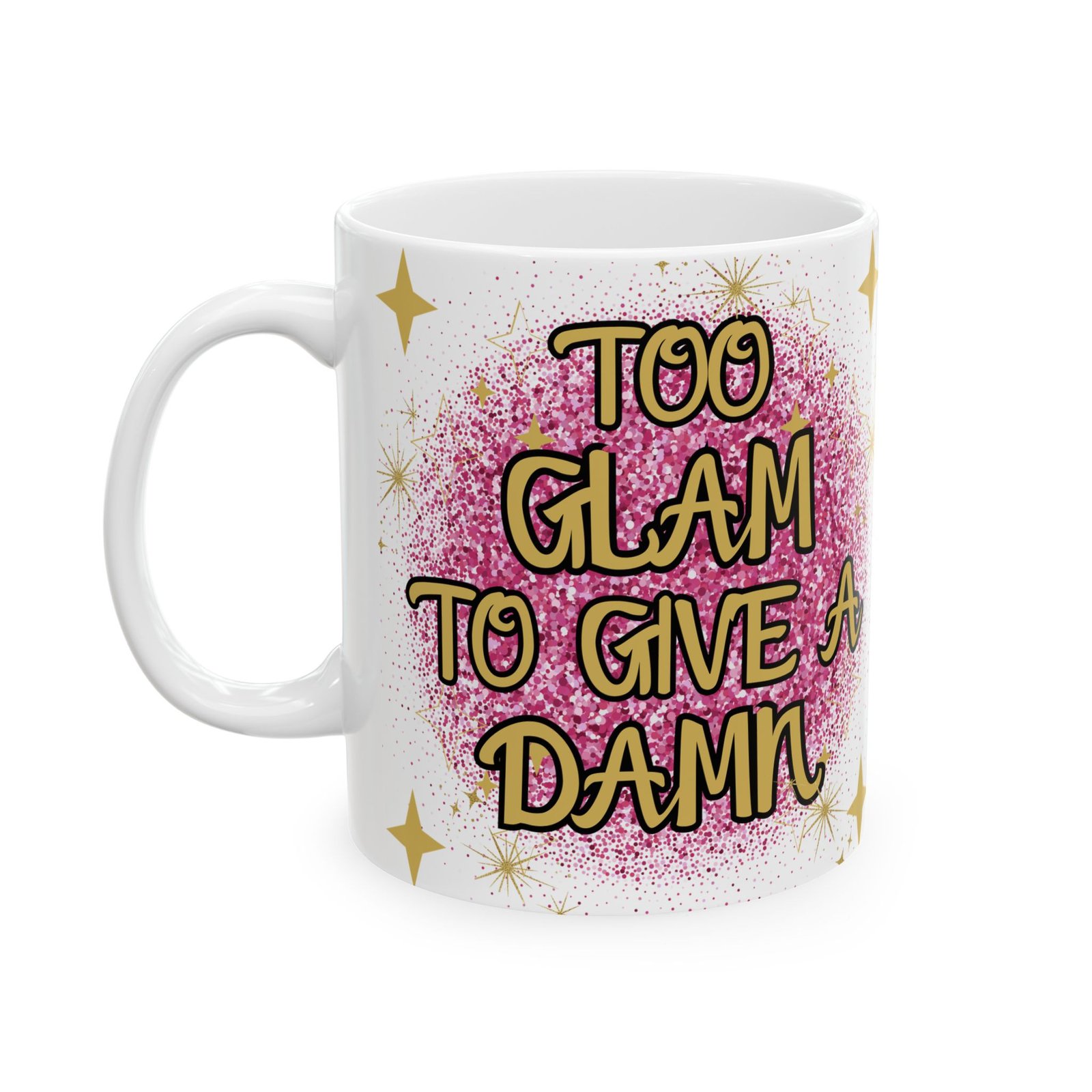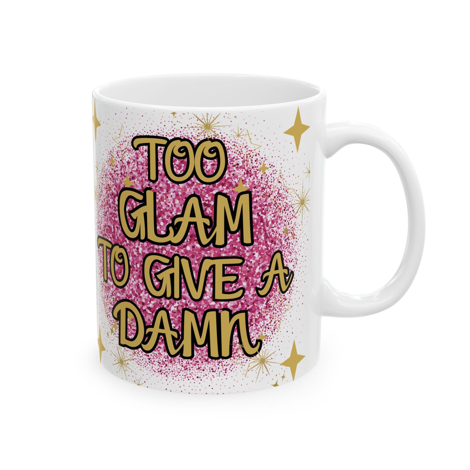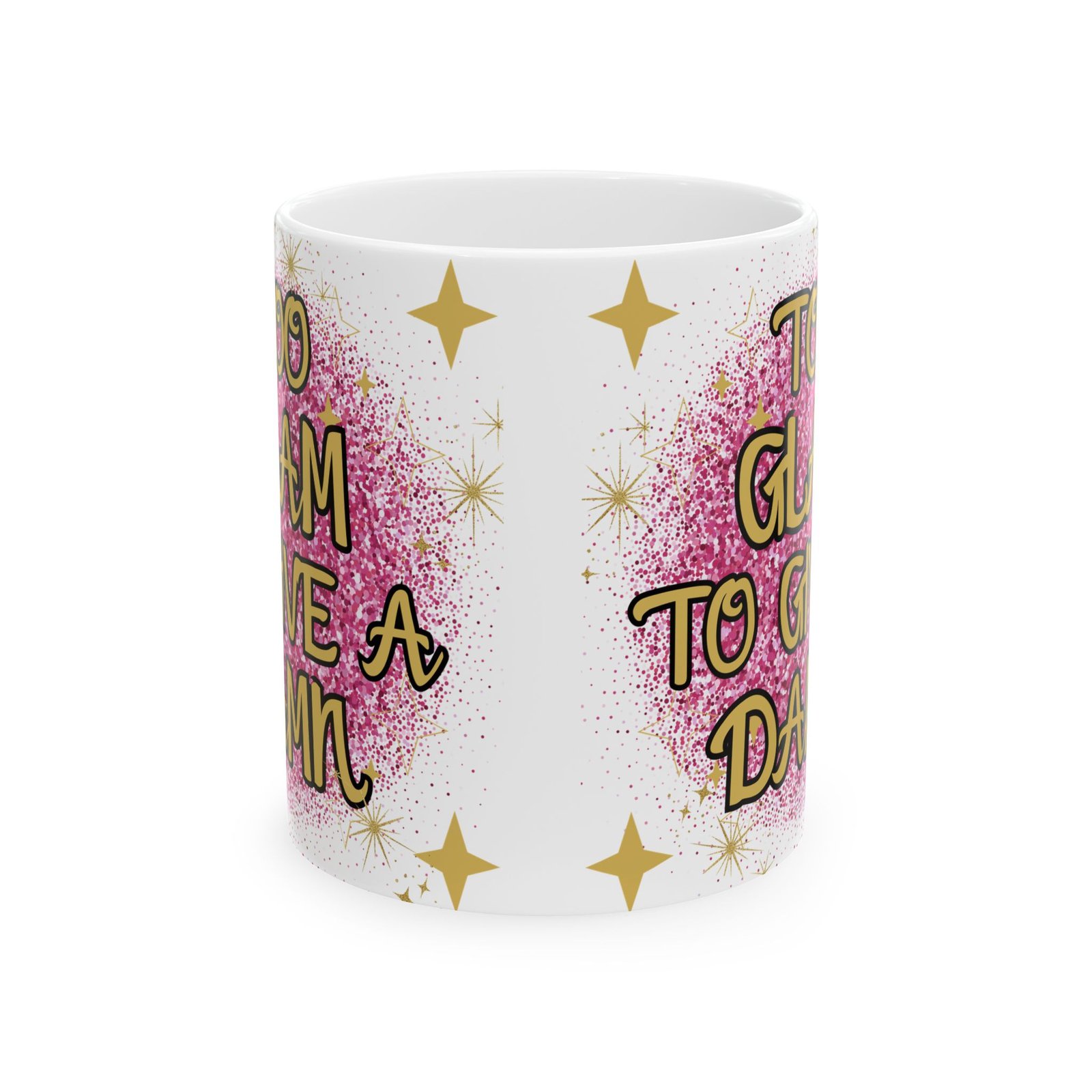 “Too Glam to Give a Damn” Mug with Pink Glitterball & Gold Stars – Perfect for Glamorous Souls Ceramic Mug, (11oz, 15oz)