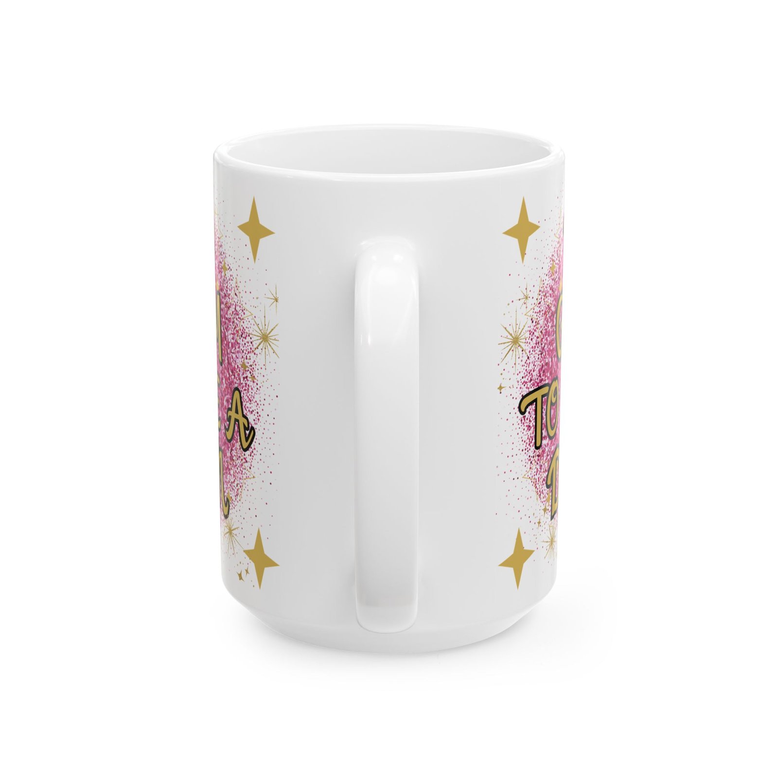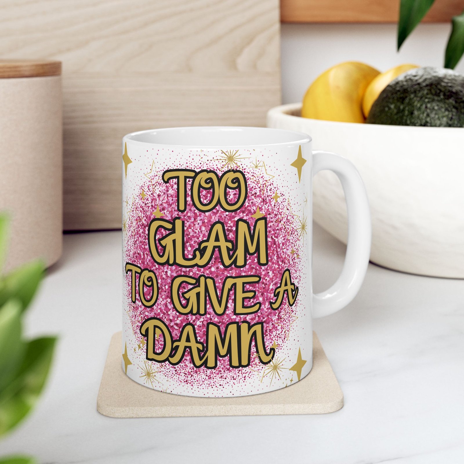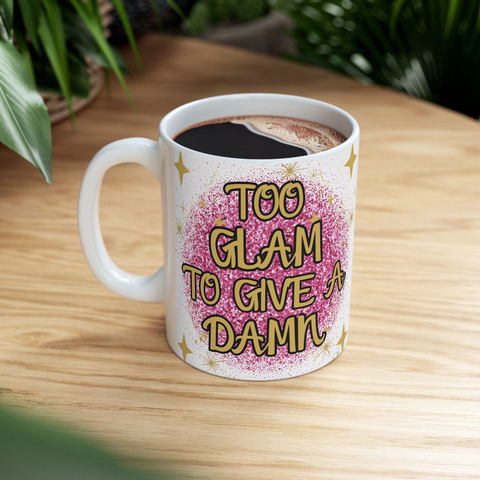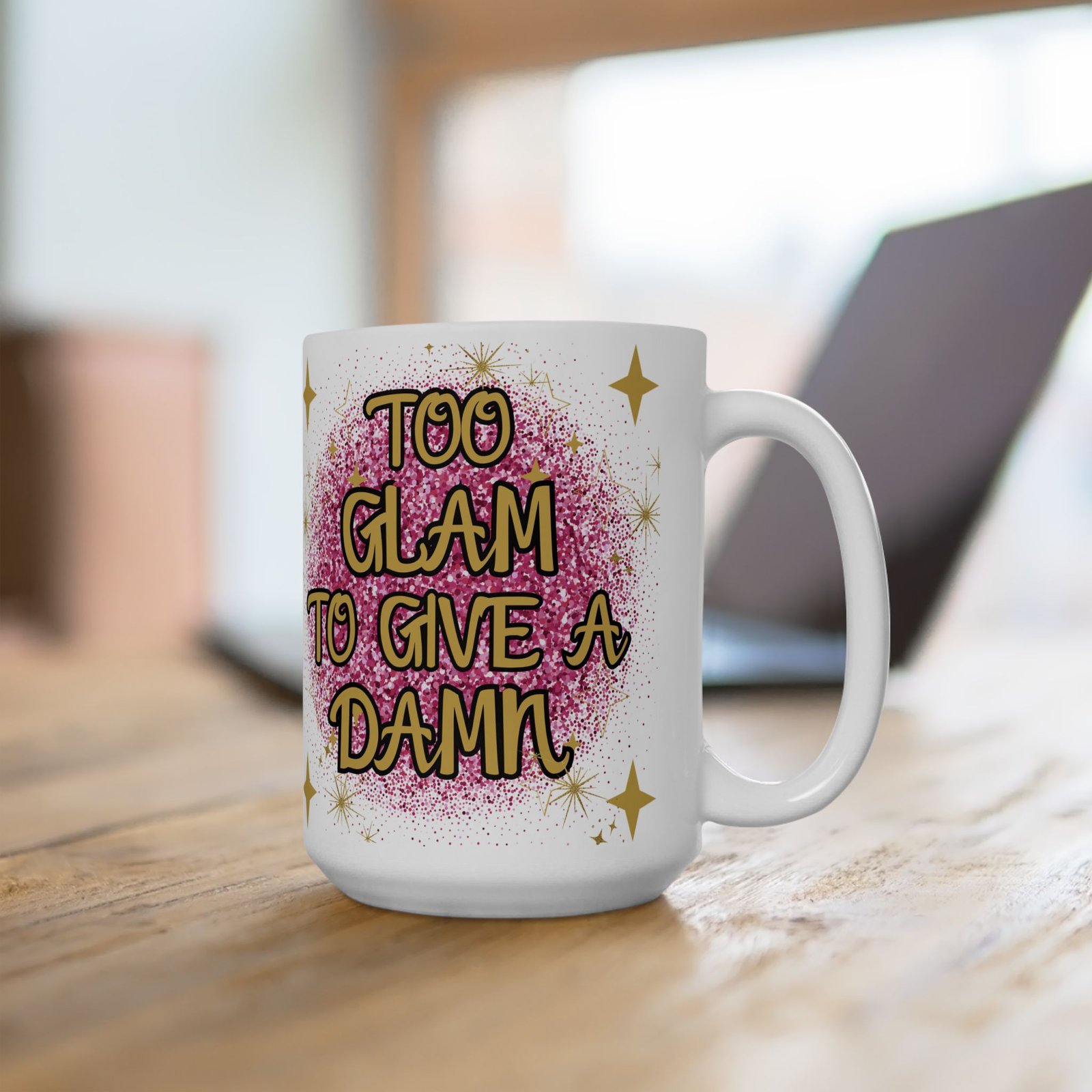 “Too Glam to Give a Damn” Mug with Pink Glitterball & Gold Stars – Perfect for Glamorous Souls Ceramic Mug, (11oz, 15oz)