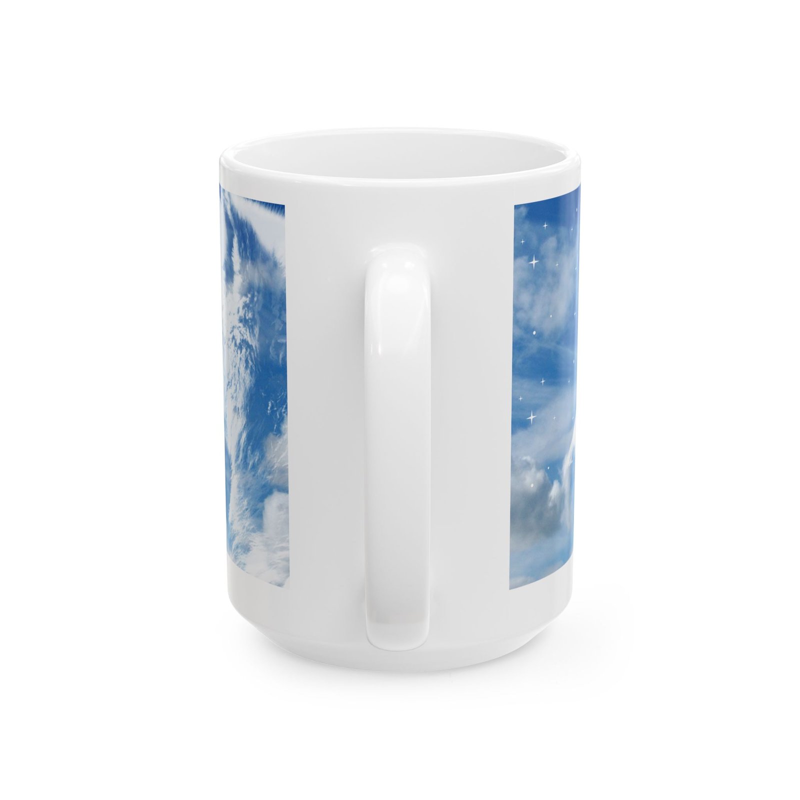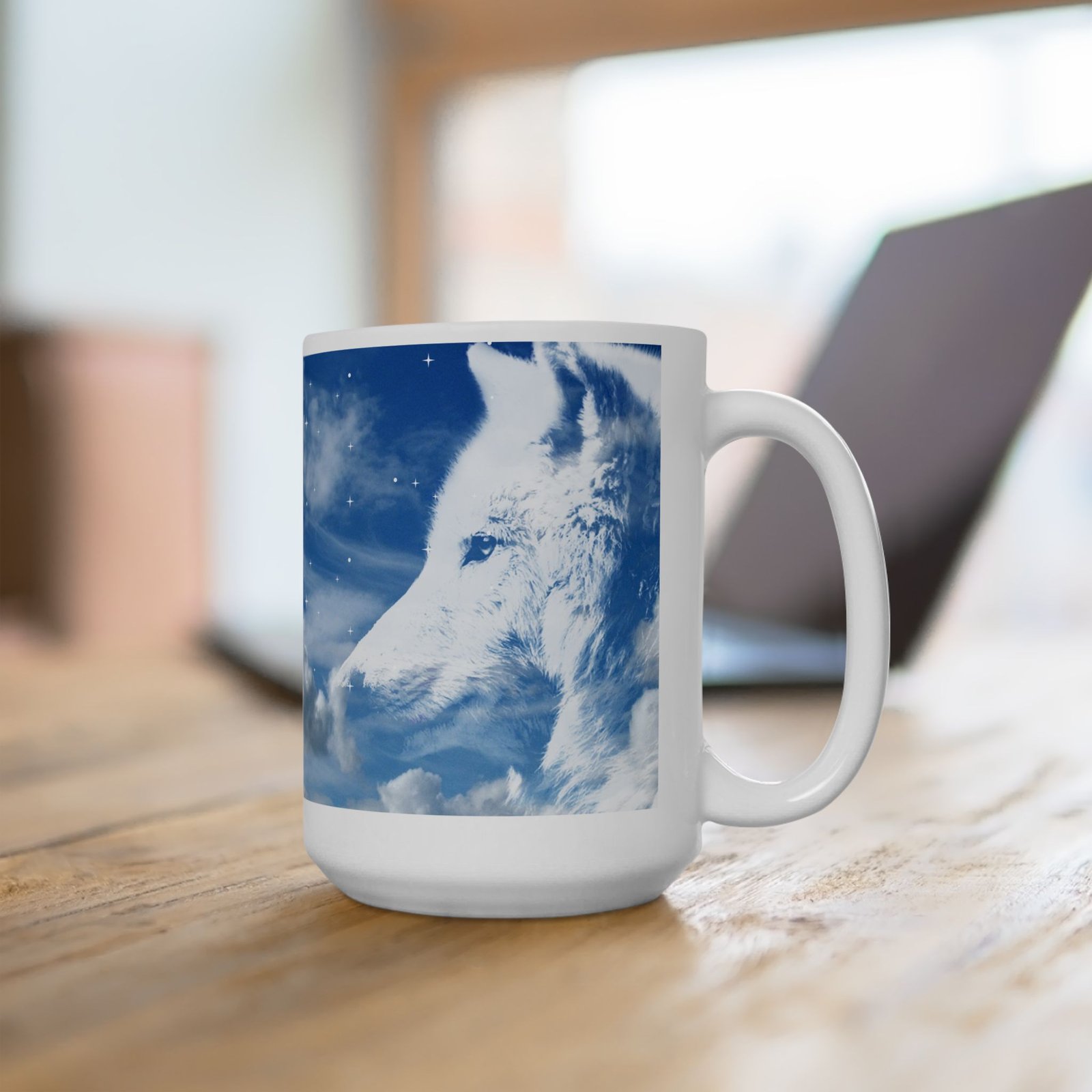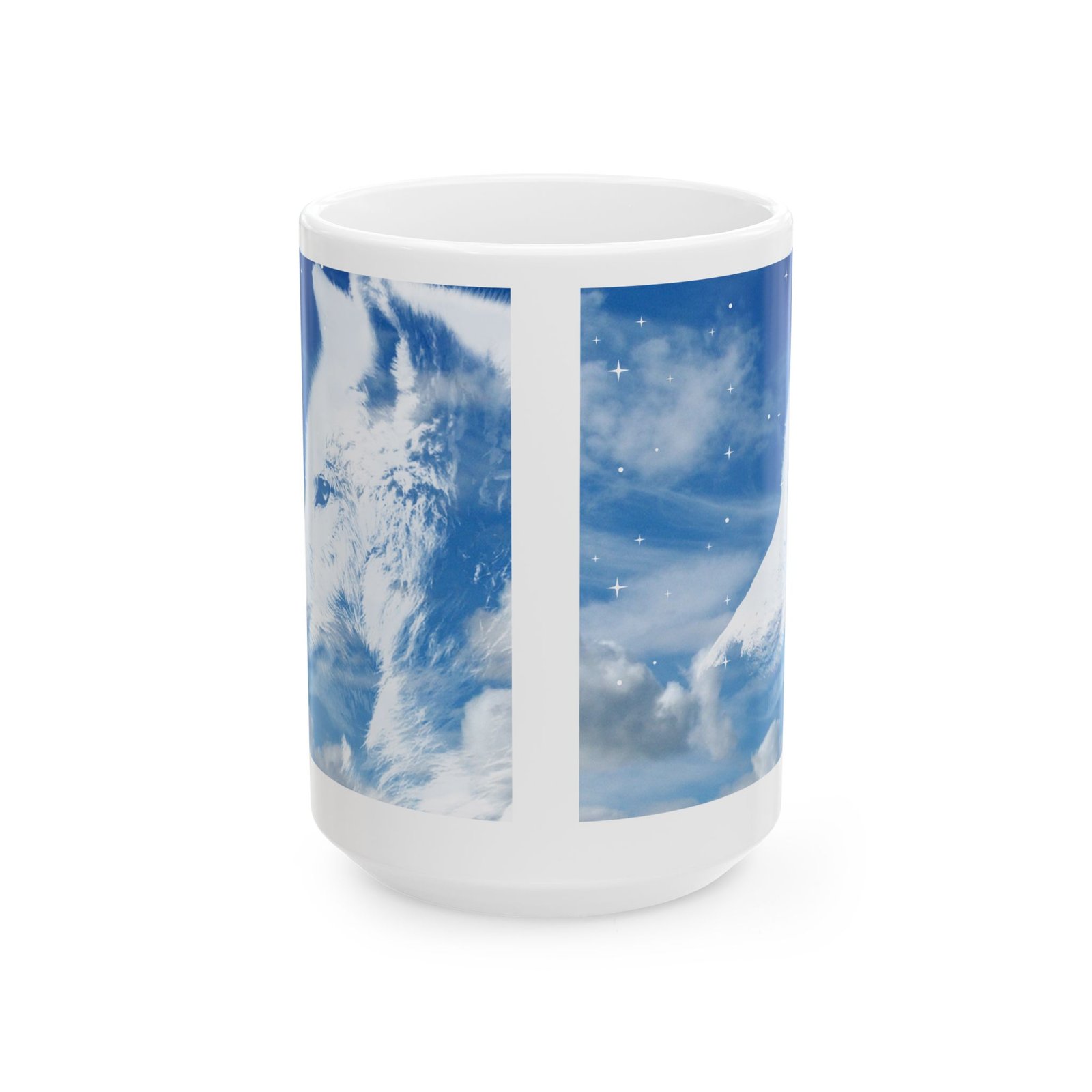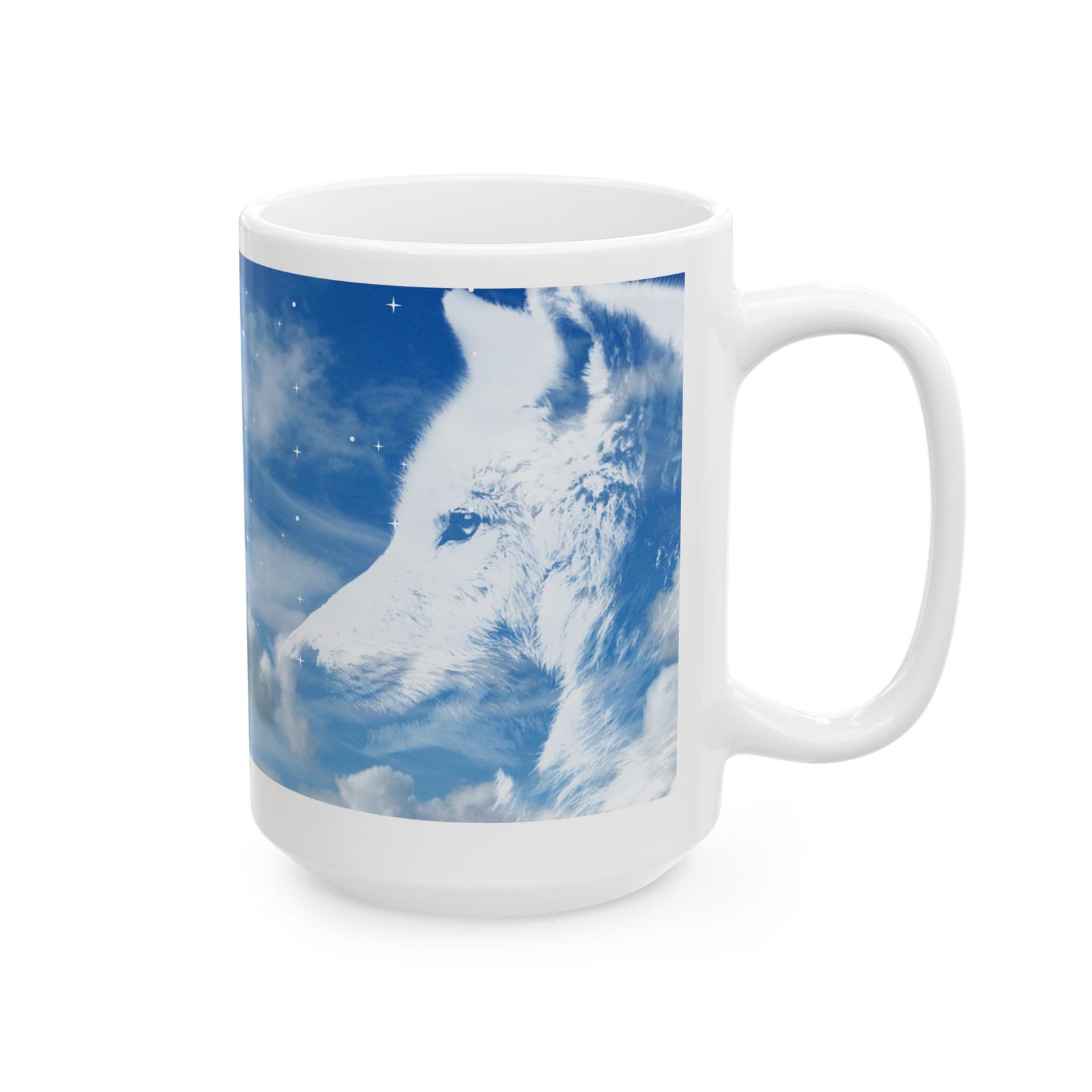 Featuring a majestic white wolf under a sparkling sky and clouds, this mug is both beautiful and serene perfect for wolf lovers.